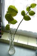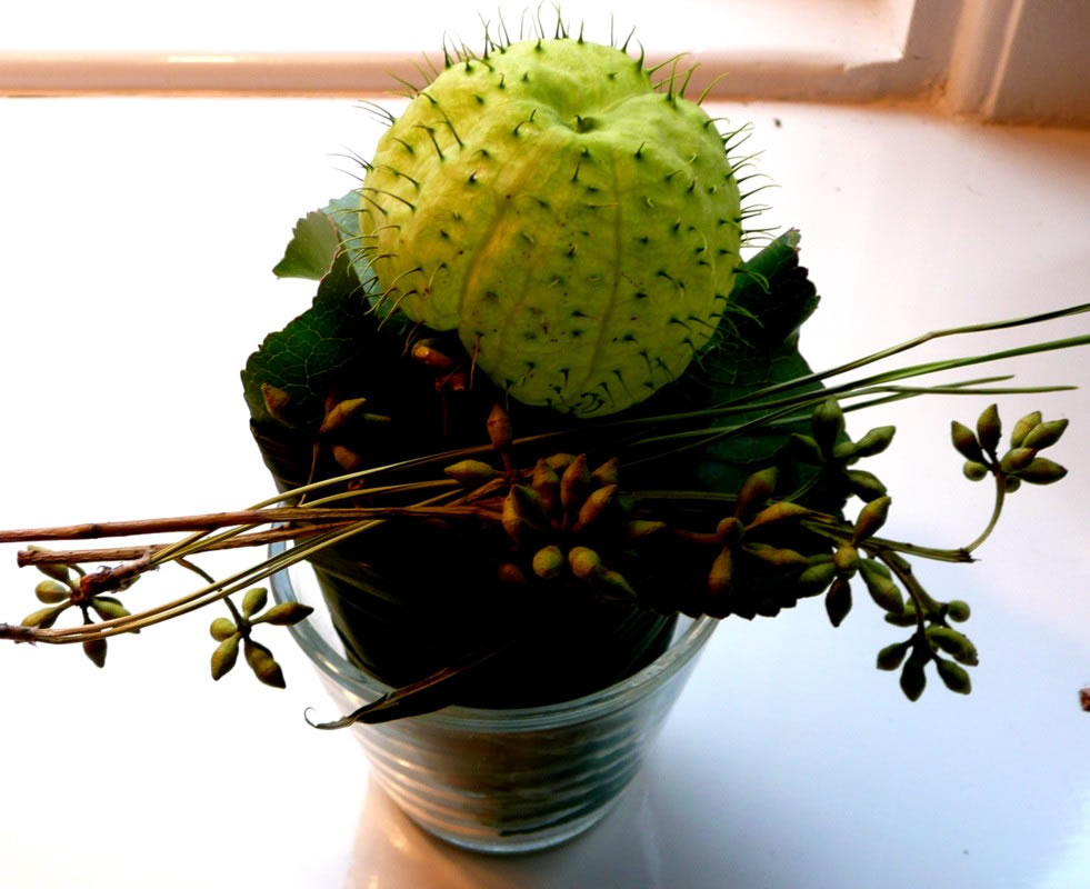 Teemlich dörchfroren möken mien Mann un ik up unsen Utfloog en Paus. Wi müssen uns eerstmal upwarmen. En lütt fien un smuck Kaffee in enen Park laad uns in. Wohlige Warms vun en Kachelaven keem uns glieks dörch de apen Döör in de Mööt. Up jeedeen Disch lüchen Talglichten. Wi harrn ja ok den 1.Advent! An enen Disch in de Neegde vun den warmen Aven funnen wi noch twee frie Stöhl. Eerst as wi uns enen heten Melkkoffi bestellt harrn, wöör ik de Dekoratschoon up den Disch richtig wies. Neven dat Talglicht stünn en hübsch trechmakten lütten Blomenpott. De weer mit Ziergräser un anner verscheden Blattwark utstafeert. Babenup in de Meern seet in hellgröön en Oort Bloom. De sehg meist en Kaktus liek. So'n Blomenpött stünnen ok up de Finsterbänk. De zart hellgröön un düstergröön Bläder möken sik goot up de witten Finsterbänk. Weern de Planten överhaupt echt un weer dat würklich en Bloom? Vörsichtig heff ik se anfaat. Echt weern se, aver dat Ganze weer gor keen Bloom. Dat weer blots en hellgröön meist dörchsichtig Fruchthüls mit luder lütte Stickeln. En Fruchthüls vun en Plant up de Finsterbank weer al platzt un lütte Samenkoorns mit en Fedder to'n Flegen as bi de Pusteblomen keken ut den Spalt. Nu güng de Raderee los. Keeneen kenn düsse Plant mit de