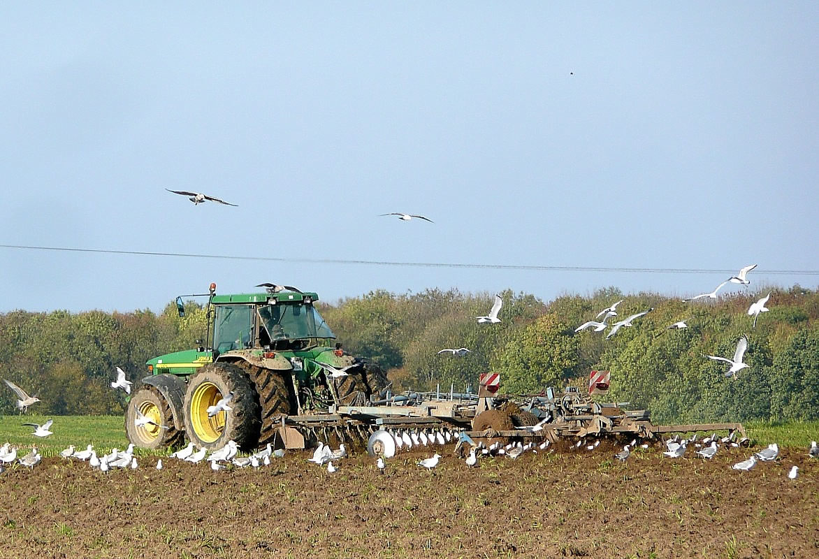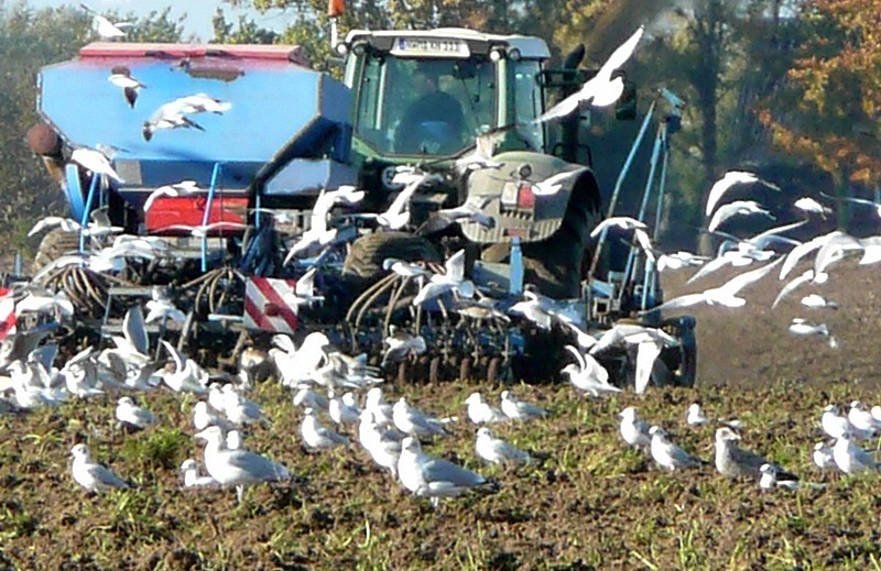 enen Saatkassen achter sik. Dor Up so'n Fohrt över Land kannst n' Barg wies warrn. So veel Möven up en Hupen harr ik sülvst an de Oostsee noch kuum to Gesicht kregen. Un so'n niemodschen Trecker mit soveel Geschirr achter sik harr ik ok noch nich sehn. De Biller köönt Se per Klick