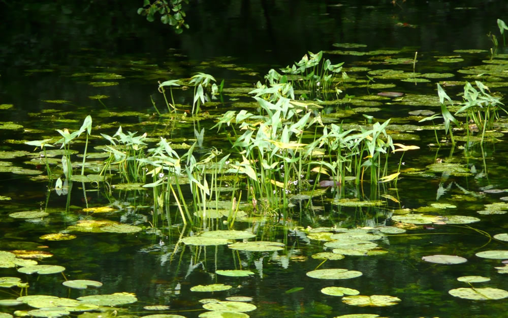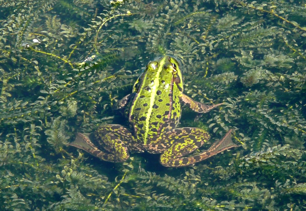 To Huus heff ik denn glieks in mien Plantenbook nakeken. Dor stünn: "Pfeilkraut, Familie Froschlöffelgewächse"! Harr sik dorüm en Pogg ünner de Planten verkrapen? In't flache Water vun de Wakenitz seet he meern mank anner Waterplanten un leet sik vun mi knipsen. De Biller köönt Se per Klick