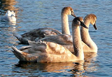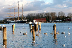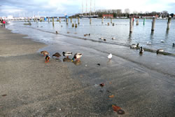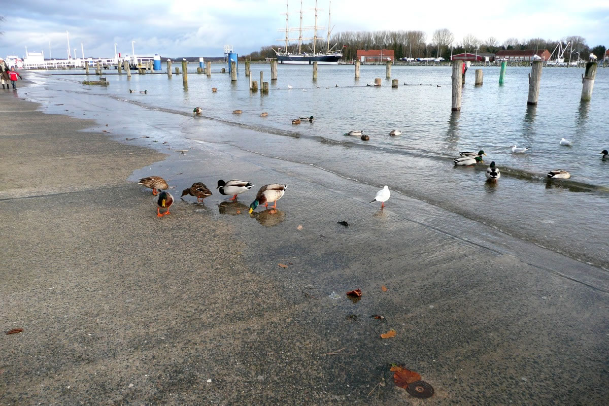In de Narichten harrn se för de Oostsee Hochwater anseggt. Dat müß ik mi ankieken. Bi herrlichen Sünnenschien möök ik mi up den Weg na de Trav. An den Jachthaven swapp dat Water ok wohrhaftig över de Promenaad. De Watervagels, Aanten un Zappen watscheln in't Water över den Weg.