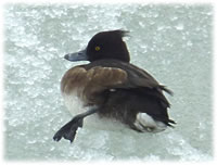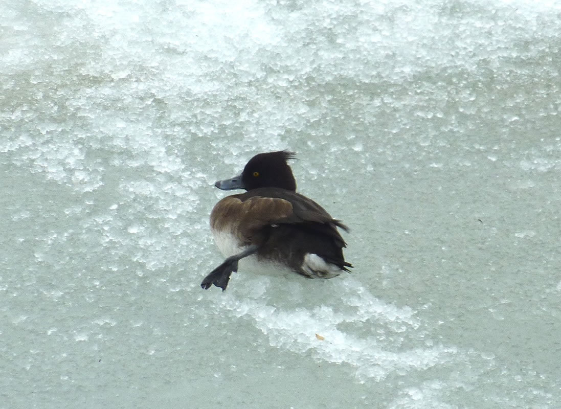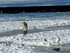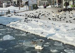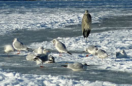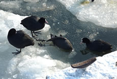breekt de Iesschollen uteenanner. De annern Watervagels müssen an de Kant stahn blieven un töven, bit de neegst Iesscholl sik lööst harr. De Biller köönt Se per Klick