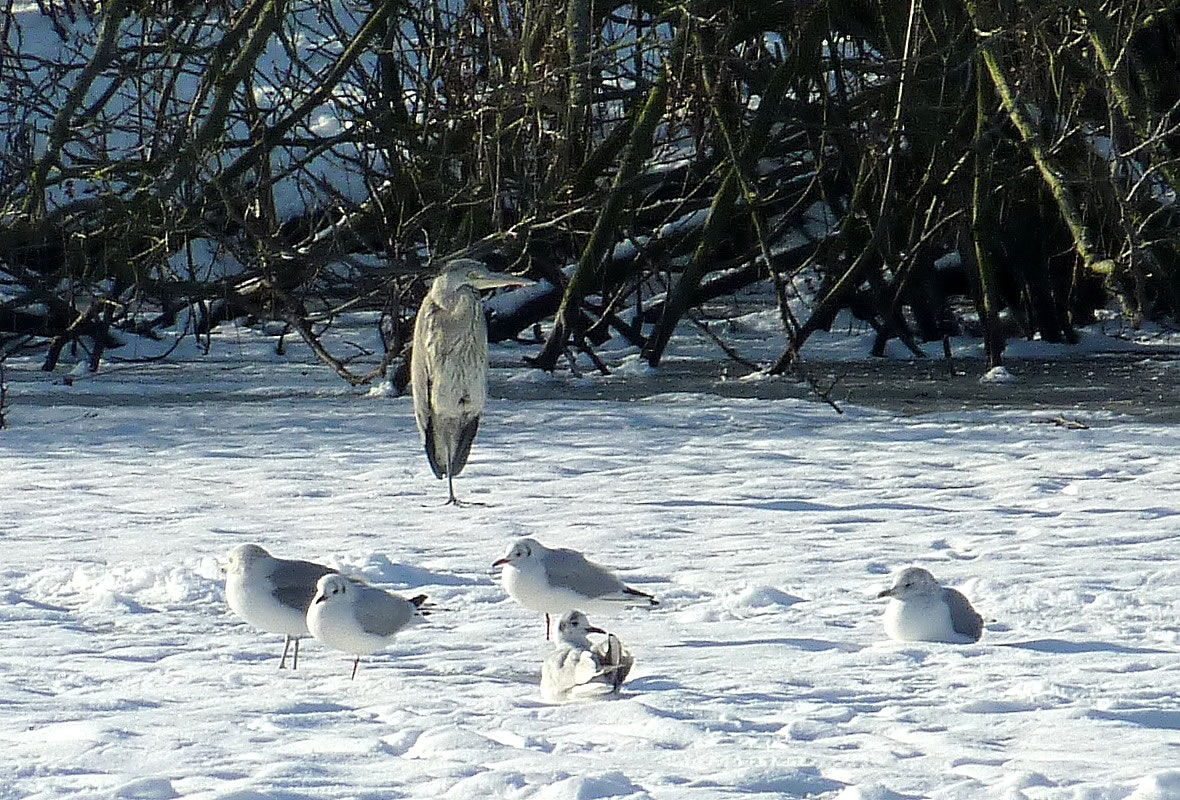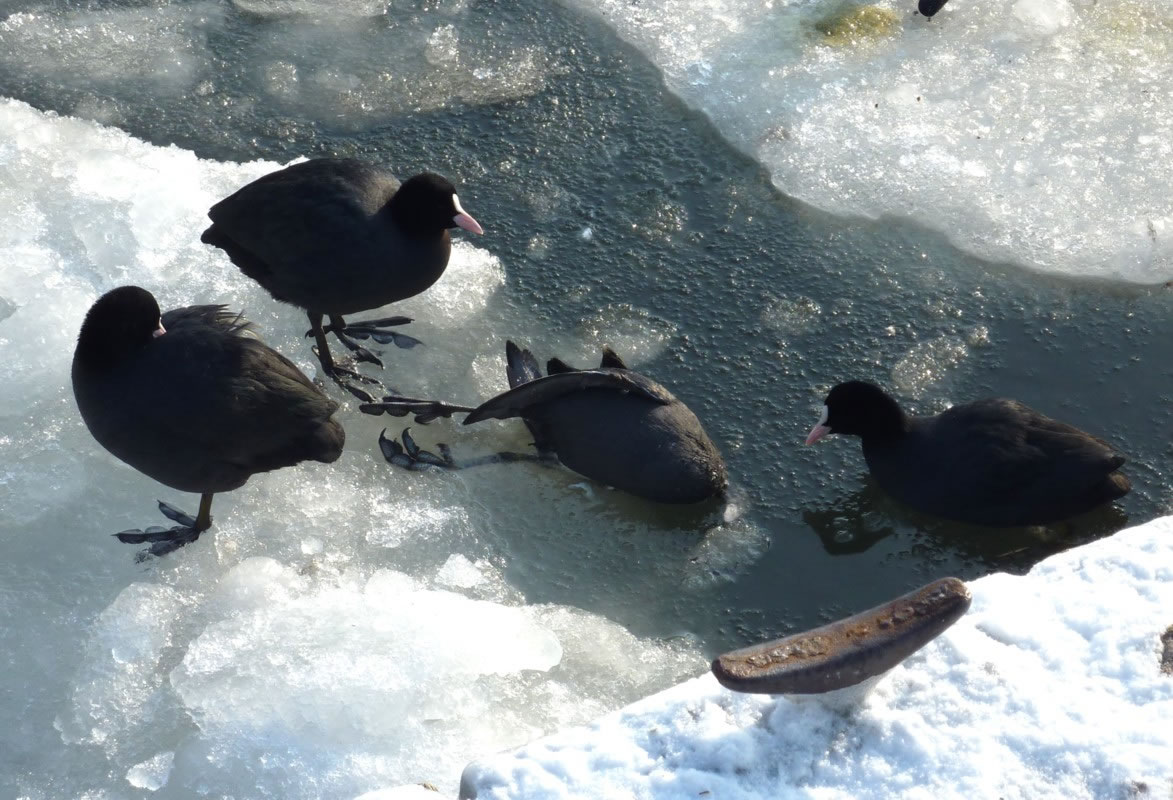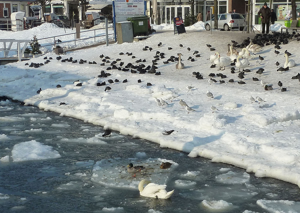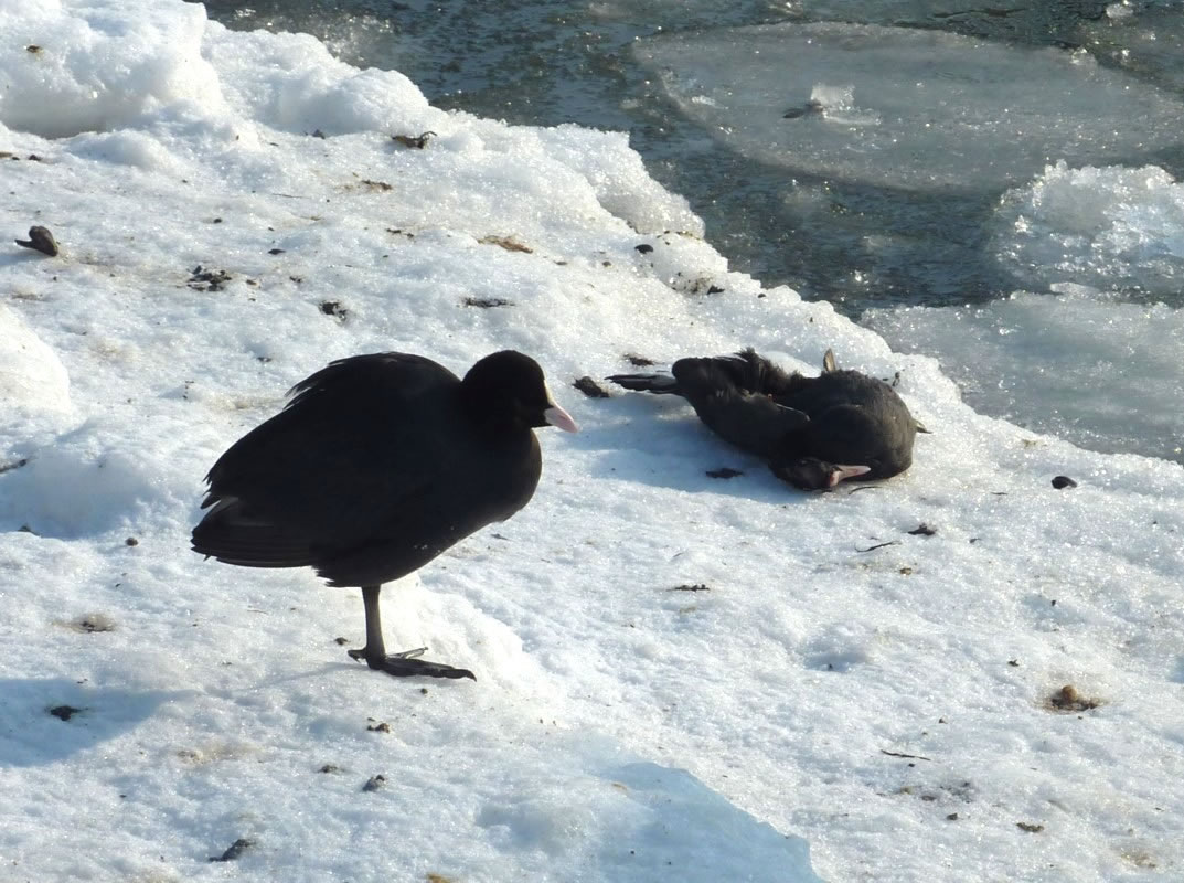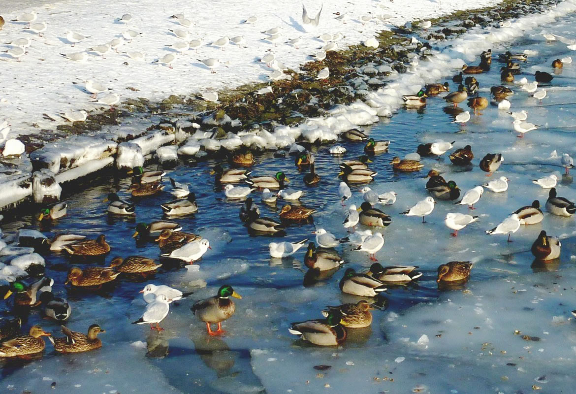 To lang duurt düsse Winter. Nich blots uns lütten Singvagels liedt Noot. Ok de Watervagels findt to wenig Freten. Up mien Spazeergang an dat Över vun de Trav heff ik veel verhungert Watervagels in Snee liggen sehn. Welk weern al storven, de annern legen halv doot up dat Ies. Weern mank de Iesschollen inklemmt un fastfroren. An't Över geev dat en Reeg Foderstellen. Dor weer denn en groot Drängelee. Besünners veel Zappis weern dor to Stell. Aver ok Möven, Aanten un Swaans weern dormang. De Zappis weern deelwies al so maddelig, dat se dat Foder in Liggen uppicken. An Rand vun de Trav un mitünner ok meern mank de velen Vagels legen verhungerte Zappen. Dor möken sik de Möven överher. Veel rode Placken up dat Ies wiesen dat Enn vun en Watervagel.