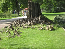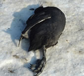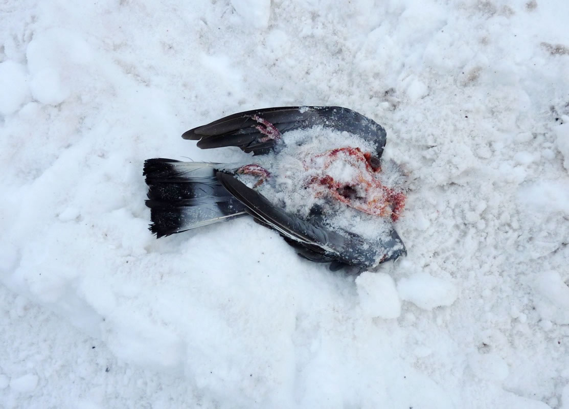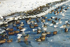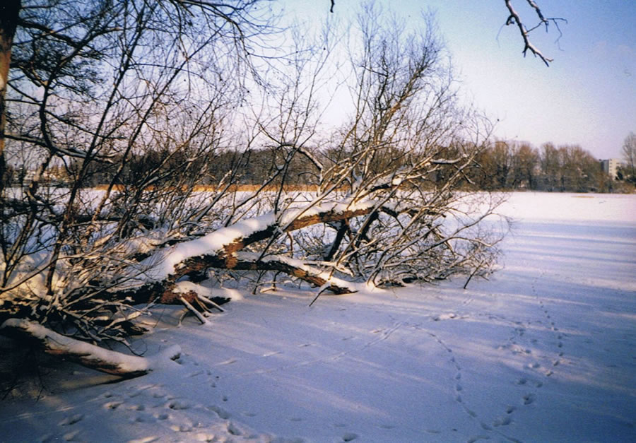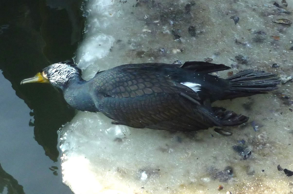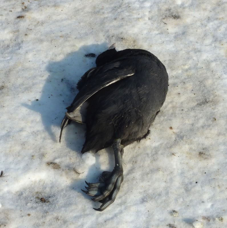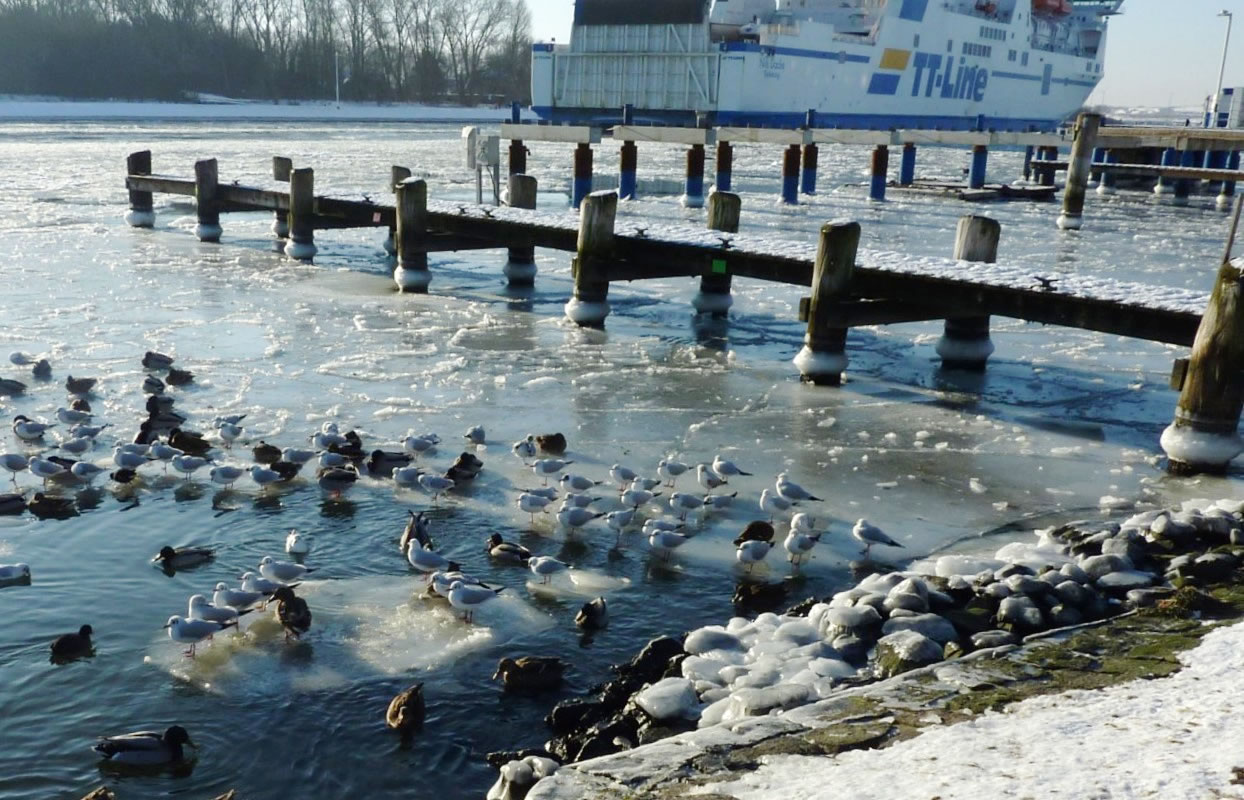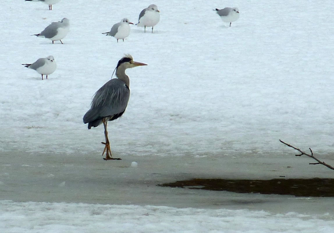 To lang duurt düsse Winter. Nich blots uns lütten Singvagels liedt Noot. Ok de Watervagels findt to wenig Freten. Up mien Spazeergang an dat Över vun de Trav heff ik veel verhungert Watervagels in Snee liggen sehn. Welk weern al storven, de annern legen halv doot up dat Ies. Weern mank de Iesschollen inklemmt un fastfroren. An't Över geev dat en Reeg Foderstellen. Dor weer denn en groot Drängelee. Besünners veel Zappis weern dor to Stell. Aver ok Möven, Aanten un Swaans weern dormang. De Zappis weern deelwies al so maddelig, dat se dat Foder in Liggen uppicken. An Rand vun de Trav un mitünner ok meern mank de velen Vagels legen verhungerte Zappen. Dor möken sik de Möven överher. Veel rode Placken up dat Ies wiesen dat Enn vun en Watervagel.