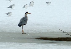 7.2.10 . .Fischreiher up den Karpendiek Düsse Winter harr dat in sik. Alle Dieken weern to. Dat froor Steen un Been. De nakelten Bööm recken sik in Heven un stünnen stief. Wenn de kole Wind dor dörchhuul, knarren un knurren se. Höör sik meist an, as stöhnen se för Küll. Bi dütt Weder wöör ik enen Fischreiher up den Karpendiek wies. He stünn up en Been, meist as so'n Wachsuldaat, meern up den Karpendiek. He ripp un röög sik nich. Keek he villicht in de Runn, up dor en Fisch för em weer? Aver de Karpendiek weer tofroren. Narms weer en Waterlock to sehn. Wi sull he dor an en Fisch kamen? In Sommer hett he sik oftins mit Fisch ut den Diek bedeent. An neegsten Dag keem ik wedder an den Diek vörbi. Un wedder stünn dor de Fischreiher, meist up den glieken Placken. Möven luren ok op dat Ies vun den Diek. Welk seten to den Fischreiher sien Fööt. Sehg meist ut, as wulln se em Sellschop leisten. Düttmal harr ik mien Knipskassen bi mi. Ik kunn mi teemlich dicht an den Reiher ranslikern. He beluur mi aver un keek mit sien scharpen Ogen ümmer rundüm. Denn böör he sien Flünken an un flöög hoch. He dreih twee Runnen un lann dorna wedder up dat Ies. Jedeenmal wenn ik an den Diek vörbikaam, kiek ik na em ut. Ümmer wedder steiht he up dat Ies un luurt. Wolang he dütt Speelwark wull ahn Fisch dörchhöllt? Villicht sull ik em welk köpen. Dat hebbt wull ok anner Minschen dacht. Twee Daag later weer ik wedder an den Karpendiek. Dor harr ener en Lock för den Fischreiher in't Ies haut. Nu stünn he an dat Waterlock un luur up Fisch. Wüllt höpen, dat he dor en Fisch finnt. De Biller köönt Se per Klick