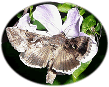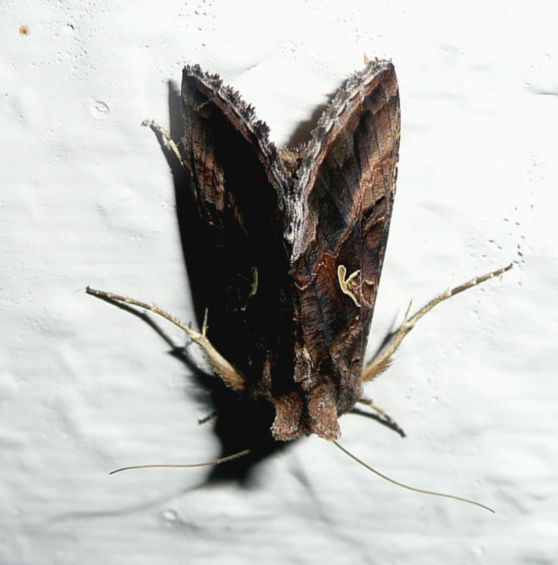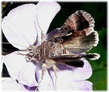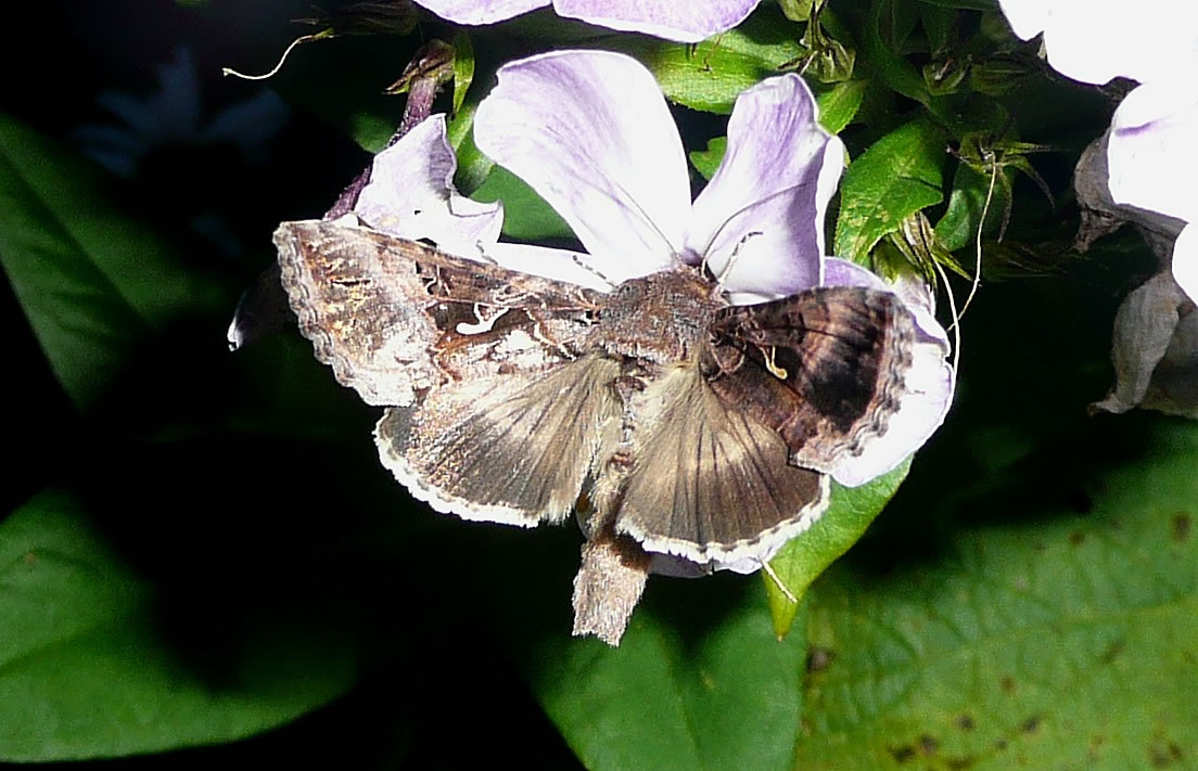 An'n Avend heff ik al oftins Nachtulen in mien Blomenbeet andrapen. Keen Nachtuul in Minschengestalt! Dat weern Nachtfalter, so nöömte Gamma-Ulen. Se flattern so unruhig vun Bloom to Bloom, dat ik keen Schangs harr, se to knipsen. Un hüüt, na den groten Regen, geev dat över Meddag n' beten Sünnenschien. Dat hett veel Insekten rutlockt. Se flögen in mien Goorn üm de Blomen. Un ok en Nachtuul, en Gammauul weer ünnerwegens.