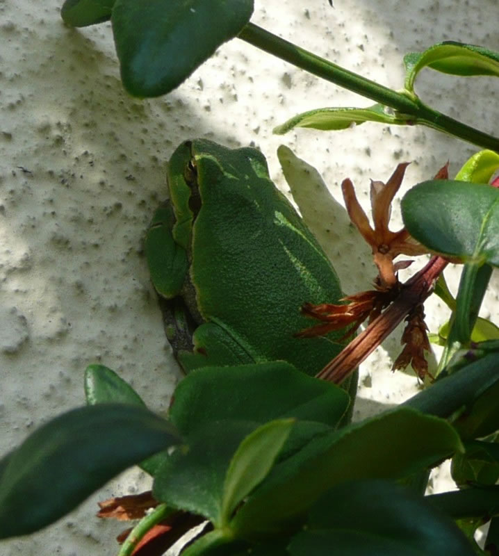 Dor, an de Wand mank den Jasmin weer en gröön Placken! Weer dat de Hasselpogg? Dat kunn doch nich angahn. Ik truu mien Ogen nich, ik dach ik drööm! Upreegt güng ik in de Stuuv un putz mi de Brill. Aver kuum to glöven, dat weer wohrhaftig de Hasselpogg. He seet dor an den glieken Placken in de Sünn as verleden Johr! Up he güsternavend mien Stimm wedderkennt hett? Ik heff up sien "Äpp, äpp, äpp!" antert. Seker will he wedder mit mi snacken! De Biller köönt