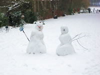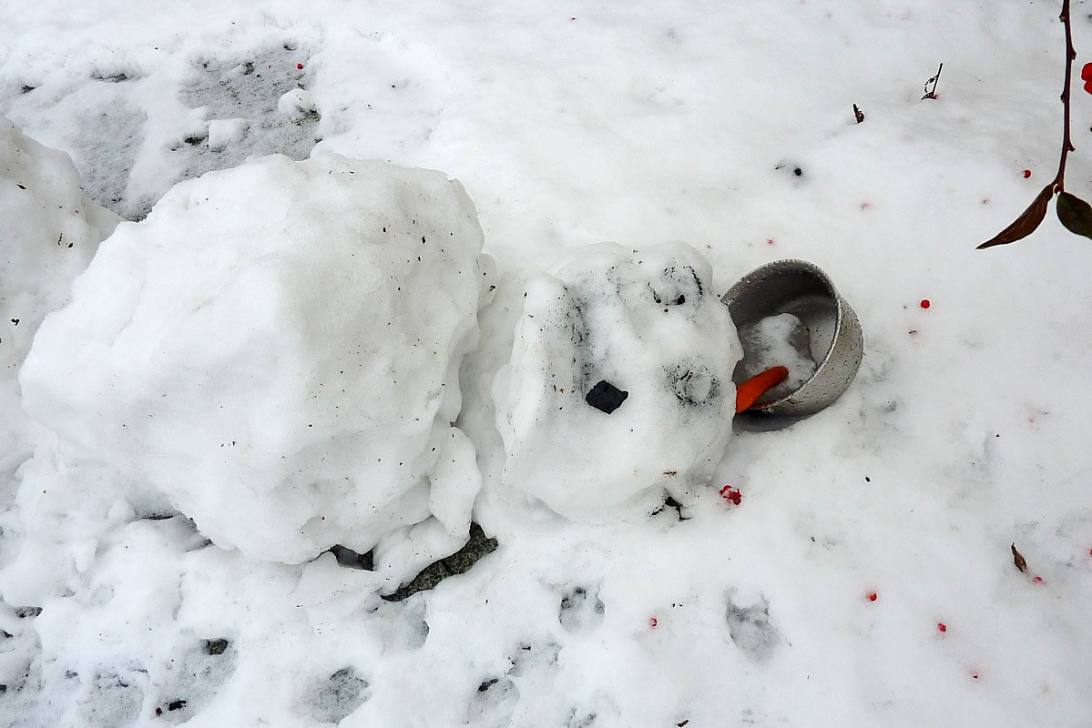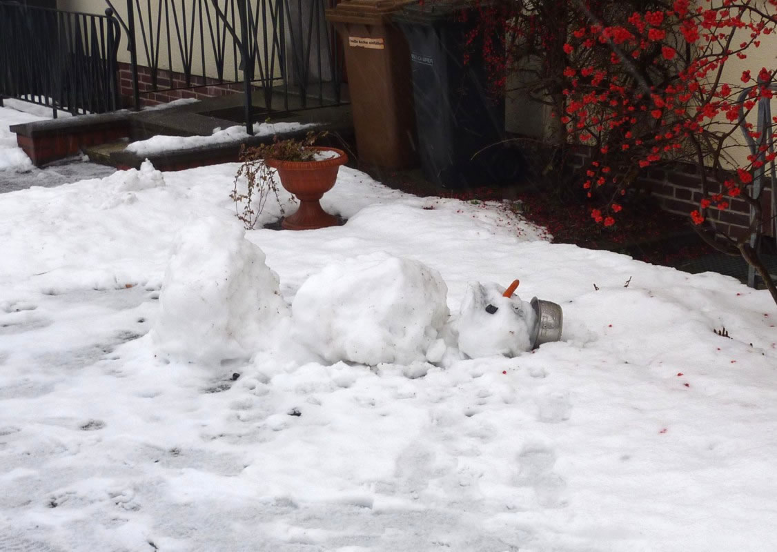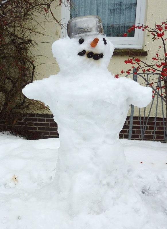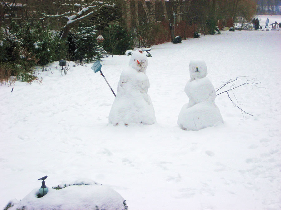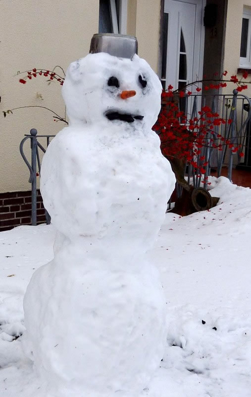 Bi dull Sneedrieven, buten weer dat al düster, keem mien Mann na Huus. "Kiek mal, nevenan steiht een vör de Döör! Hest em al sehn?" Verwunnert keek ik ut, ik kunn nümms sehn. Aver denn wöör ik em wies. En Sneemann stünn bi den Naver vör de Döör! En richtigen Sneemann! Wo lang harr ik keen Sneemann mehr sehn! Up den Kopp harr he en olen Blickputt. Mit glöhen Ogen, swatt