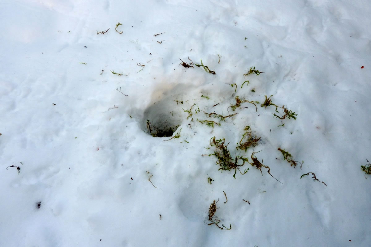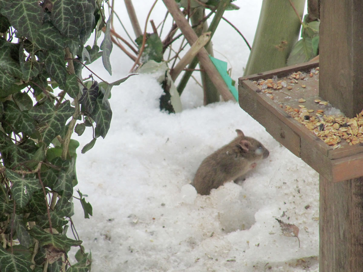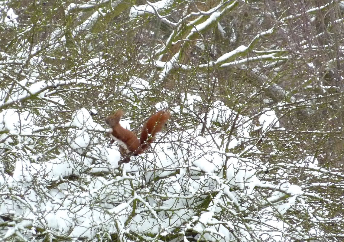 He schüttel sik vör Küll. De Telgen vun de Bööm un Büsch in de Goorns weern mit tominnst 20 cm Snee todeckt. Weer gor nich eenfach, de Nööt ünner den Snee uttomaken. De harr he al in Harvst as Vörrat in'n Goorn vergraven.