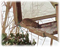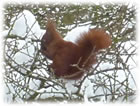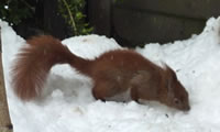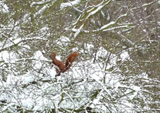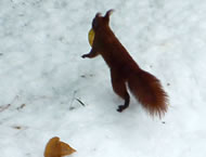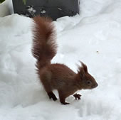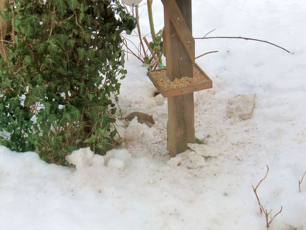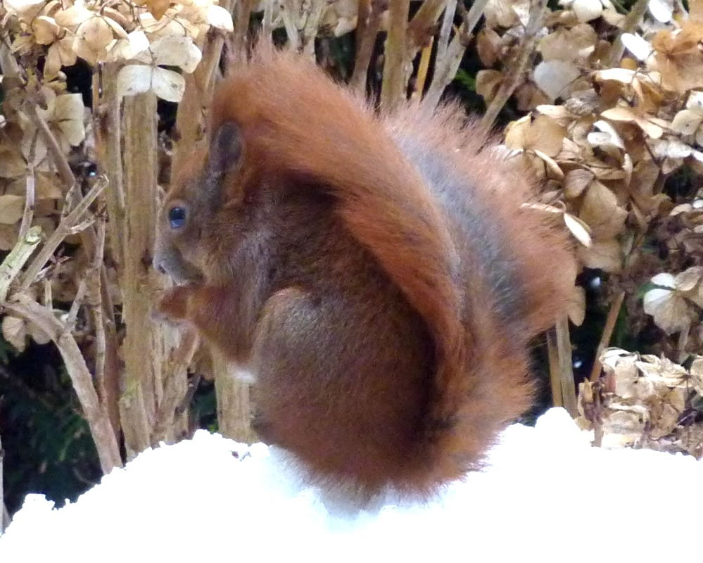 Flink huusch Jan Flink vun Busch to Busch. Mitünner müss he över den hogen Snee. De lütten Fööt saken deep in den weken Snee. En breed Spoor bleev trüch. In't Vagelhuus harrn de Vagels allerhand för em nalaten. Un up de Terrass legen noch grote Stücken vun Appels. De smeckten Jan Flink besünner goot. Mit en groot Stück Appel hau he af in den neegsten Boom. Dor hett he sik den lütten Buuk richtig vullhaut. Annern Dag weer he wedder to Stell. Den buschigen Steert as warme Deek över den Rüüch seet he wedder in't Vagekhuus un leet sik dat goot smecken. Mit Höölp vun dat Vagelfoder kann he sien Hunger stillen. So kümmt Jan Flink seker goot över den Winter. De Biller köönt Se per Klick