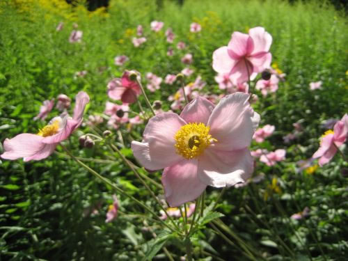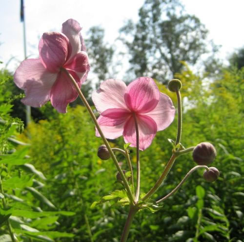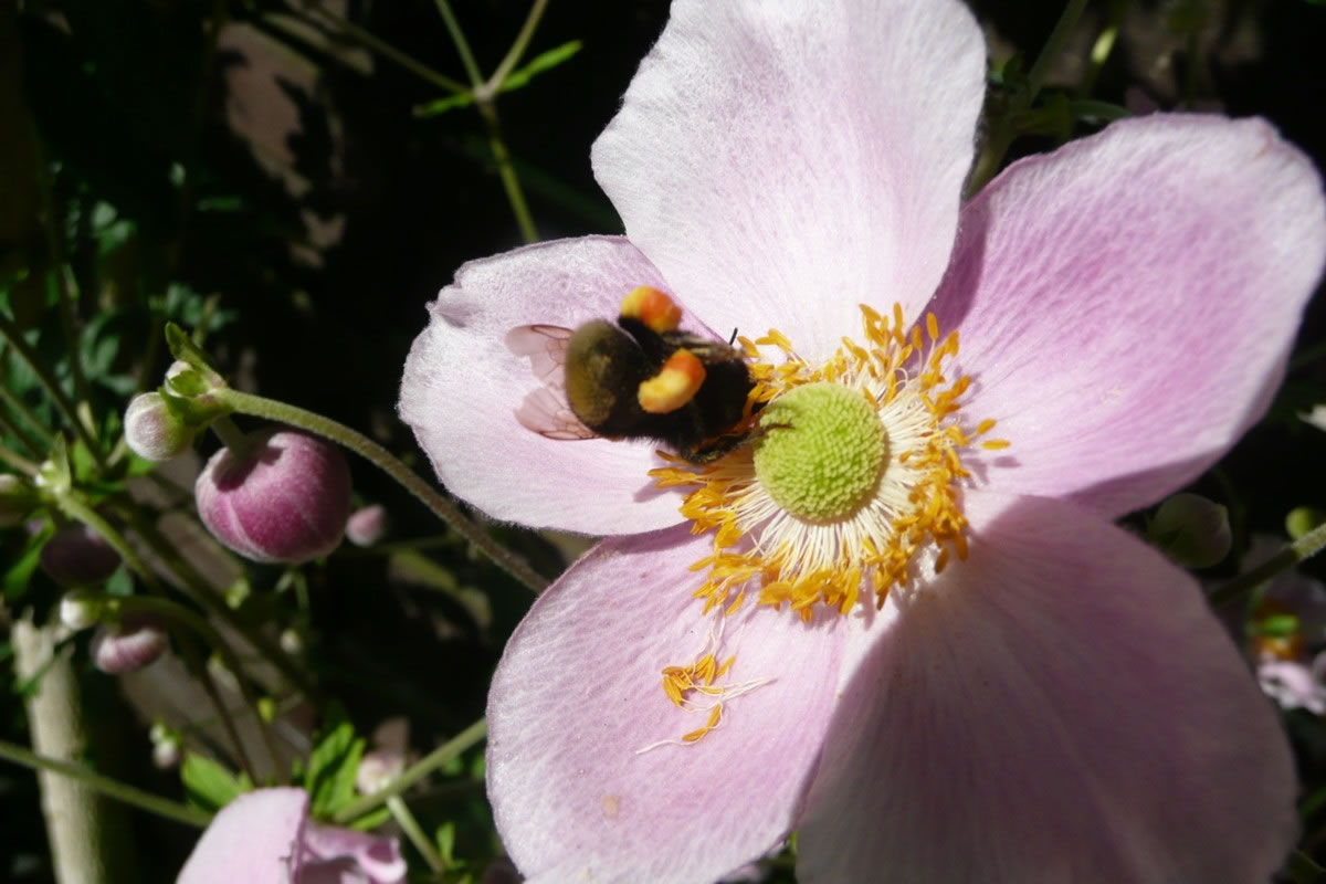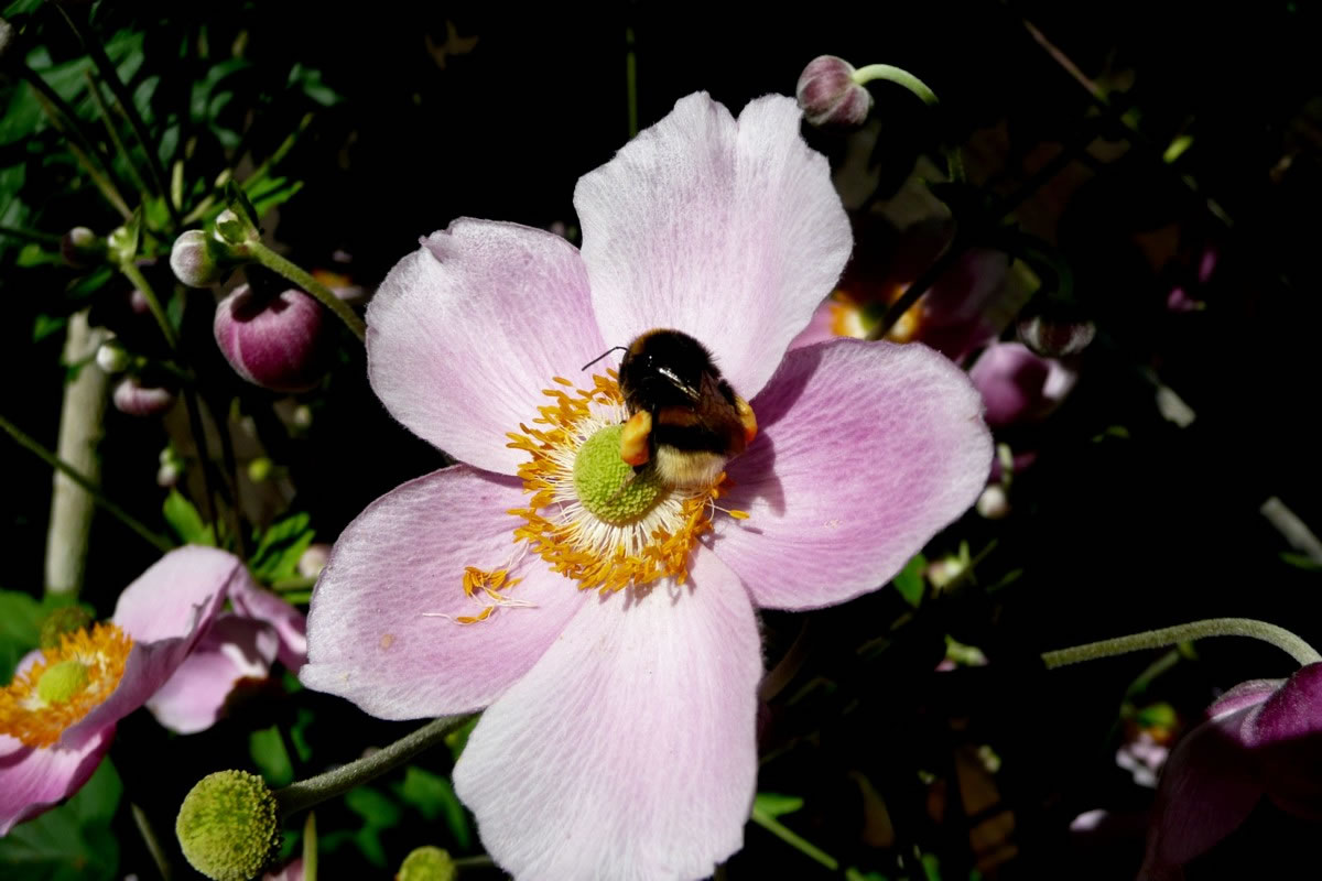 De eersten Sünnenstrahlen an Moorn lüchen up mien rosa Anemone. Se blööt ümmer eerst in den laten Juli un den Augustmaand, de Anemone Japonikum. De smucken Blöden lockt veel Insekten an. Ganz besünners kemen de verscheden Hummeln to Besöök. Se bedenen sik iefrig mit den Blödenstoff, mit de Pollen. Dörch kräftig Slääg mit ehr Flünken in de Blööt lööst se de Pollen. Dorbi verdeelt sik de Stoff över de Hummel, un de süht wi inpudert ut. Denn strepelt de Hummel mit ehr Been de Pollen to Klumpen tohoop. De Klumpen, Pollenhöschen, kleevt se sik an de Achterbeen. Dorbi is en hohes fienes Summen to höörn, meist as wenn ehr wat passeert weer. Dat hett mi anlockt un ik heff en Hummel bi't Pollensammeln tokeken. Se harr ehr Büxen al randvull, söch aver ümmer noch mehr. Möök dorbi Koppstand, üm beter an de Pollen to kamen. Un ümmer noch kleev se welk an ehr Büxen. Wi se de wull na Huus bringen wull? Endlich harr se noog. Bi den Trüchfloog trock de Last vun de vullen Büxen de Hummel meist n'beten na ünnen. Aver se hett dat wull doch schafft. Seker weer dat en Arbeiderin ut en Hummelvolk. De Biller köönt