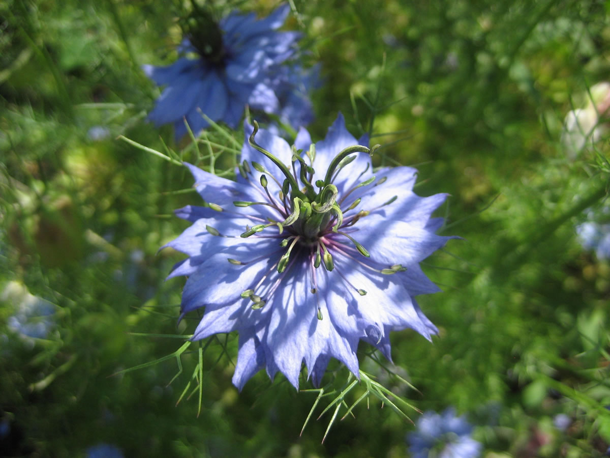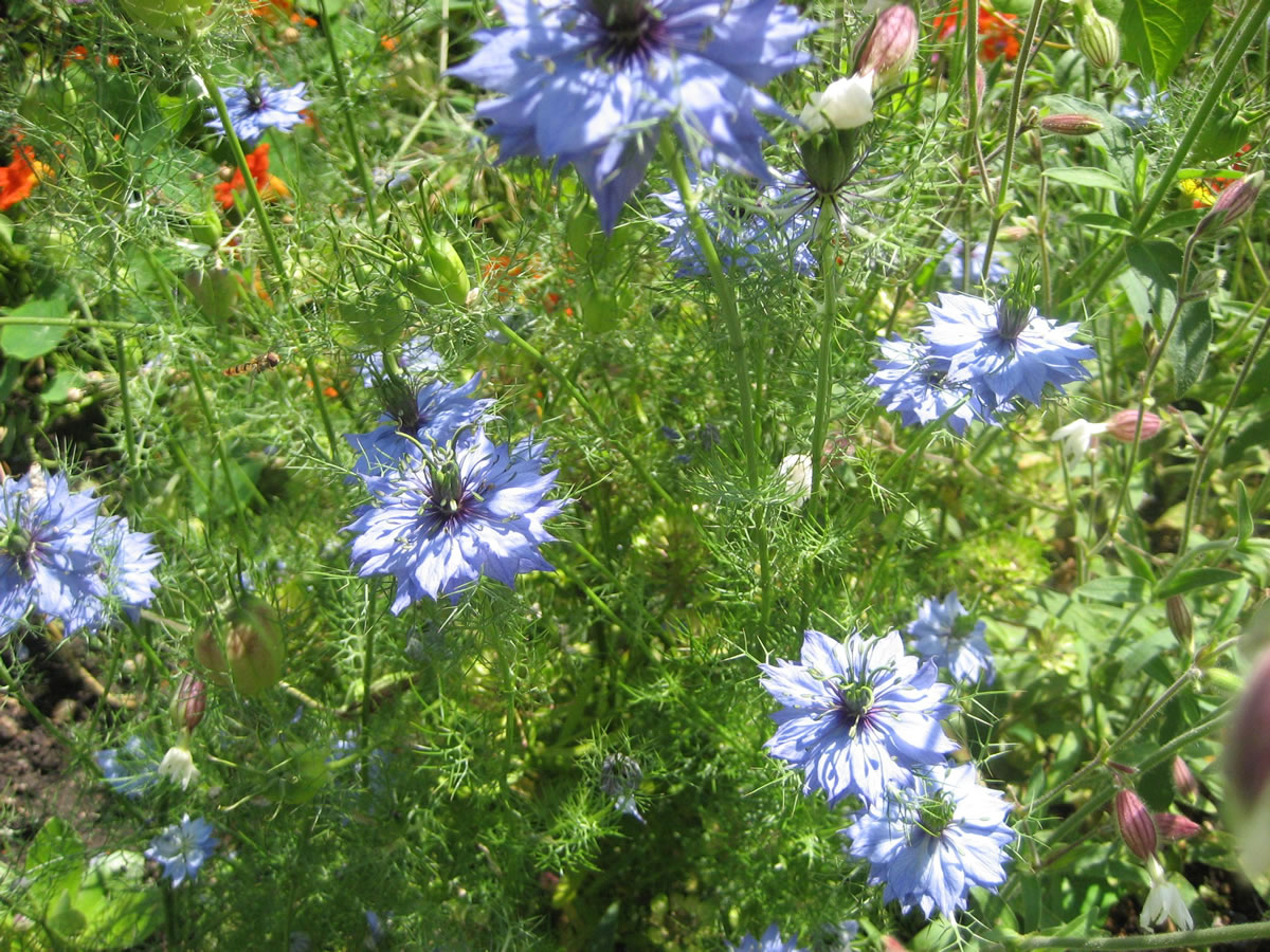 Wat hier so schön blöht, is de "Jungfer im Grünen". Ik mag de Plant lieden. Se ist so fien, un ehre Blöden sind so schöön blaag. Se is veel as Goornplant to sehen, as Bispill in Buurngoorns. Wat mi ok an disse Plant gefallt, sünd ehre hübschen Namen: