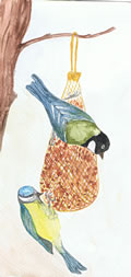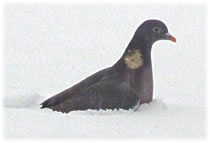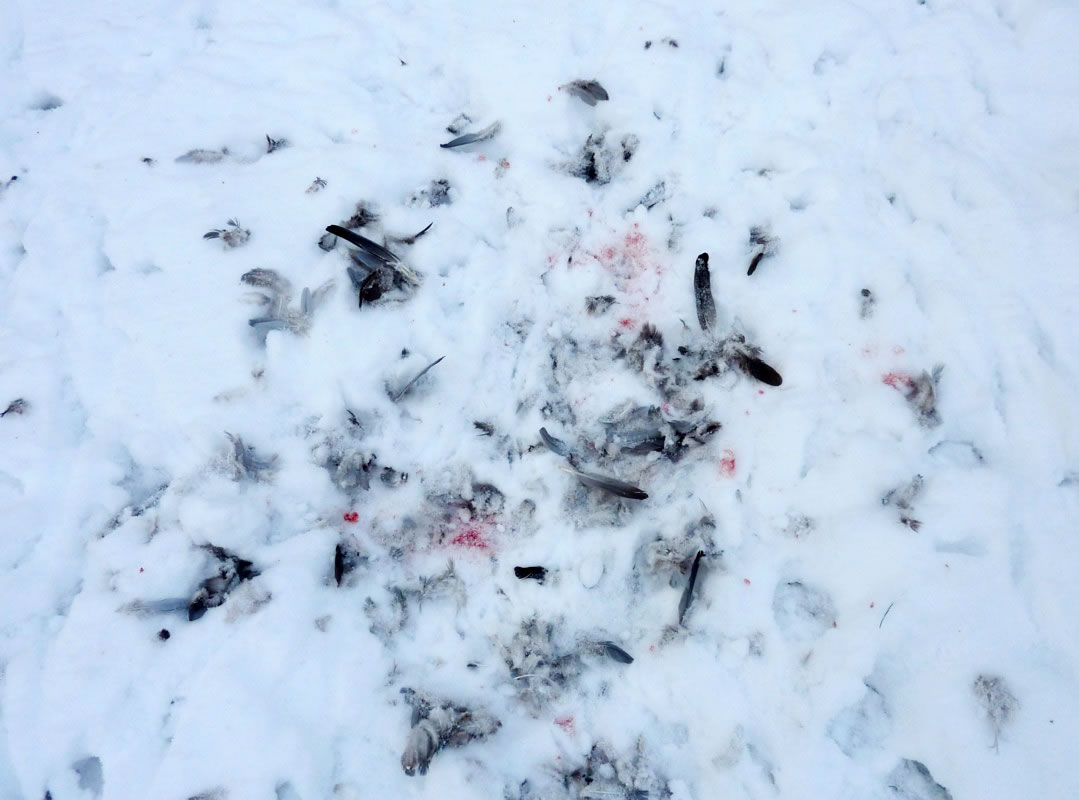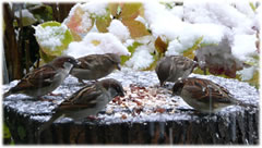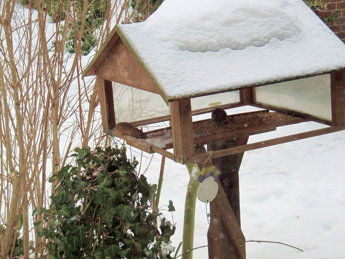 Dat Vagelhuus warrd nich blots vun de lütten Vagels upsöcht. Ok Duven, Heister un Kreien kaamt un söökt na Vagelfoder. De Duuv luurt ümmer up een Telgen. Wenn de Luft rein is, kümmt se dörch den dicken Snee över den Rasen anwackelt. Se is so swoor un behäbig, se versackt in den depen Snee. Dat süht richtig drollig ut. Se lett en brede Spoor trüch. Ünner dat Vagelhuus findt se den de Koorns, de vun de lütten Vagels daalsmeten sünd.