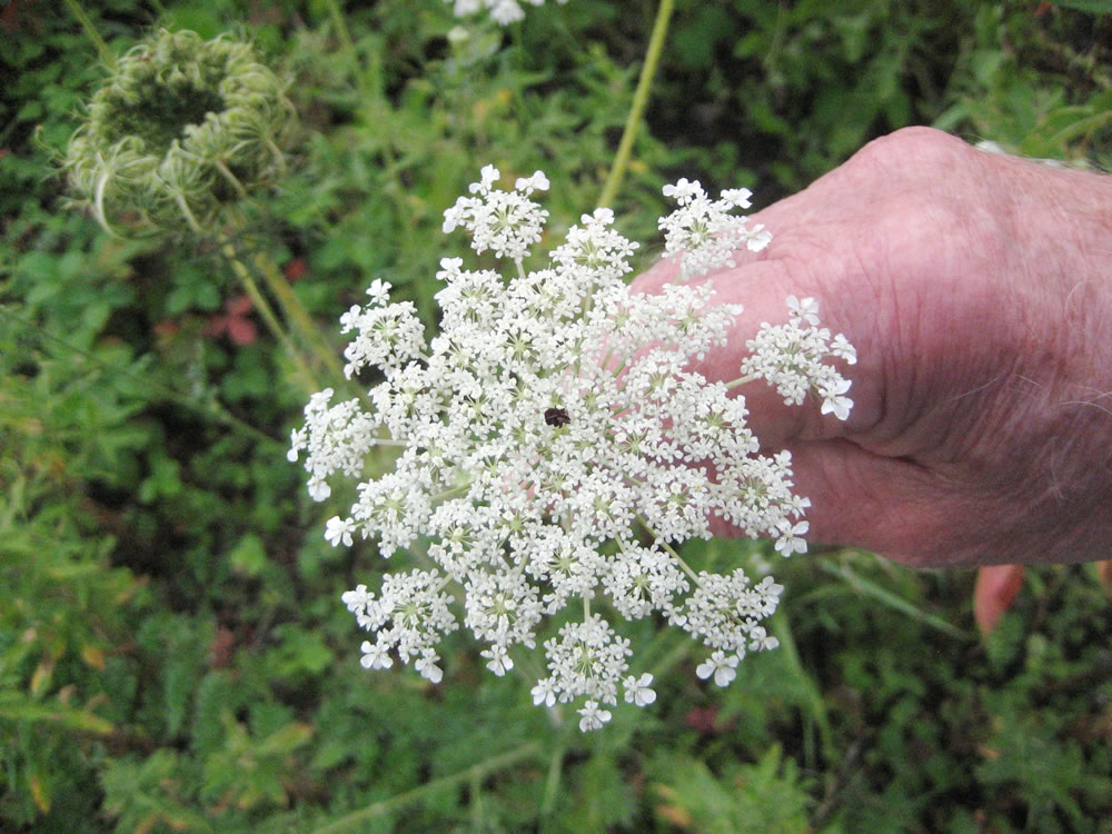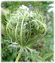 . .Wilde Möhre Anner Namen: Möhre, Maurach, Mauroch, Merchen, Merl, Mörlen, Mohrrüben, Mohrwurzeln, Mohrenkümm, Mohrenköpfe, Morich, Murke, Murr, Eselsmöhren, Maidele, Schatthutbengel, Vogelnest Wenn een in'n Sommer buten ünnerwegens is, denn süht een heel vele Dolden-Planten. All seht se tominnst för miene Ogen liek ut. Ik kann de eenfach nich ut'neen hollen. Is dat nu Fenchel, Anis, Kümmel, Dill orrer noch wat anners, nie bün ik mi seker. Blots een Plant is dorbi, de kann ik jümmers glieks kennen, un dat is de Wilde Möhre. De Wilde Möhre hett in de Mitt vun ehre witte Dolde en düüster Blööd. As so 'n swarten Punkt süht dat ut. Wenn de Plant utblöht hett, denn treckt sik de Dolde na de Mitt hen tosamen. As so 'n Vagelnest süht dat denn ut. Ik weer graad ünnerwegens un dor stünn de Wilde Möhre