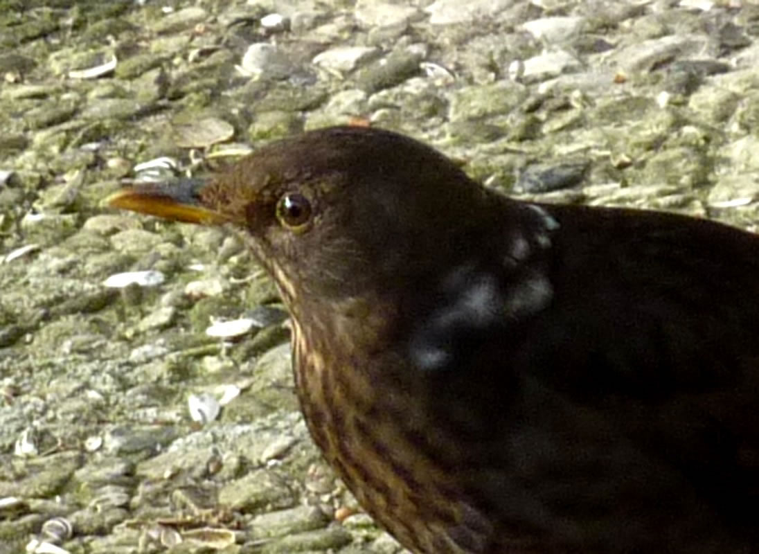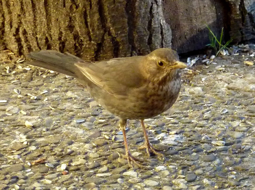 Ik glööv, wi hebbt ok ene Singdrossel üm uns rüm. Ik höör dat Singen, sehn heff ik se noch nich. Man sehn heff ik ehre "Drosselsmeed". Dat is en Steen, up den de Singdrossel Snicken tweihaut, so, as weer't en Amboss. De Vagel nimmt de Snick an de apen Siet in'n Snabel un haut dat Snickenhuus so lang up den Steen, bet dat tweigeiht. "Peng, peng, knack" Also, wenn ik mi dissen Steen mit all de Snickenhuus-Schören üm rüm ankiek, nee, denn stimmt dat wohl nich mit "Dusslige Drosseln". De Biller köönt Se per Klick
