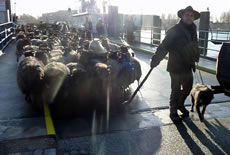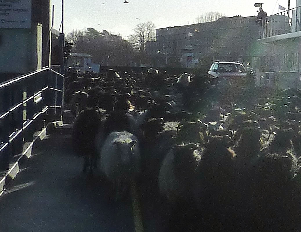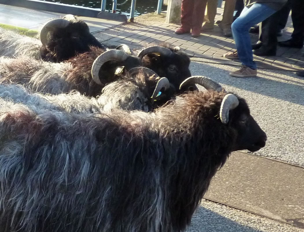 Denn weer dat sowiet. Schöön vörsichtig legg de Fähr "Schleswig-Holstein" an den Anlegger an. Ganz vörut föhr en Polizeiauto mit Blaulicht vun de Fähr. Dat möök den Weg för de Schaap frie. Liekers harrn de Schaap vör de velen Minschen an't Över Schuuch un bleven stahn. Eerst as de Scheeper mit sien Stock un sien beiden Hunnen keem un de Schaap toreep: "Komm, Alte, komm!", güng dat wieder.