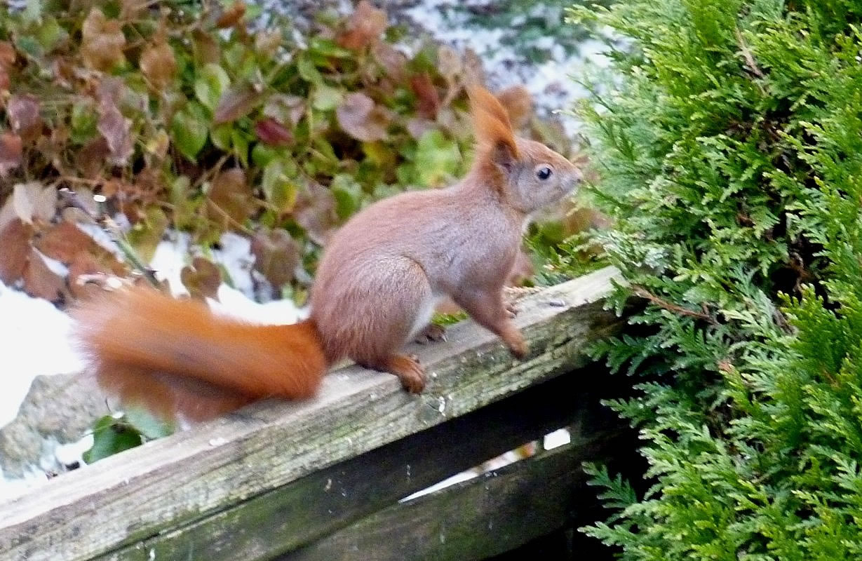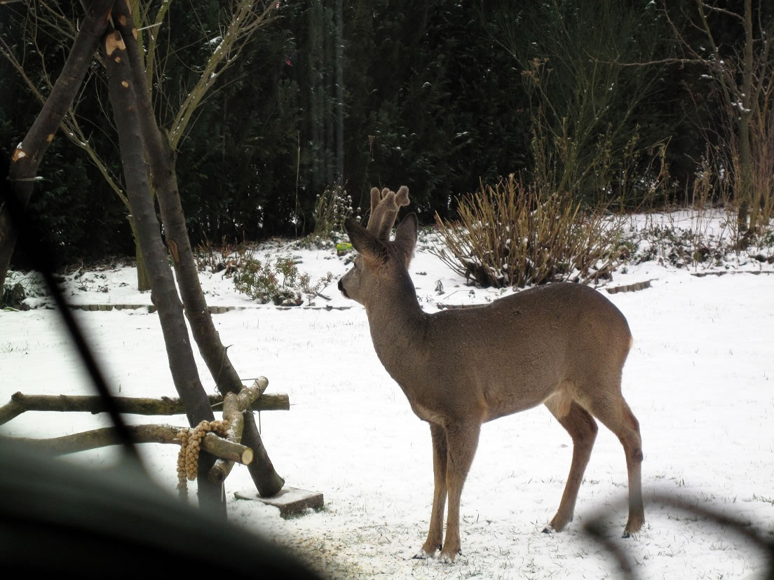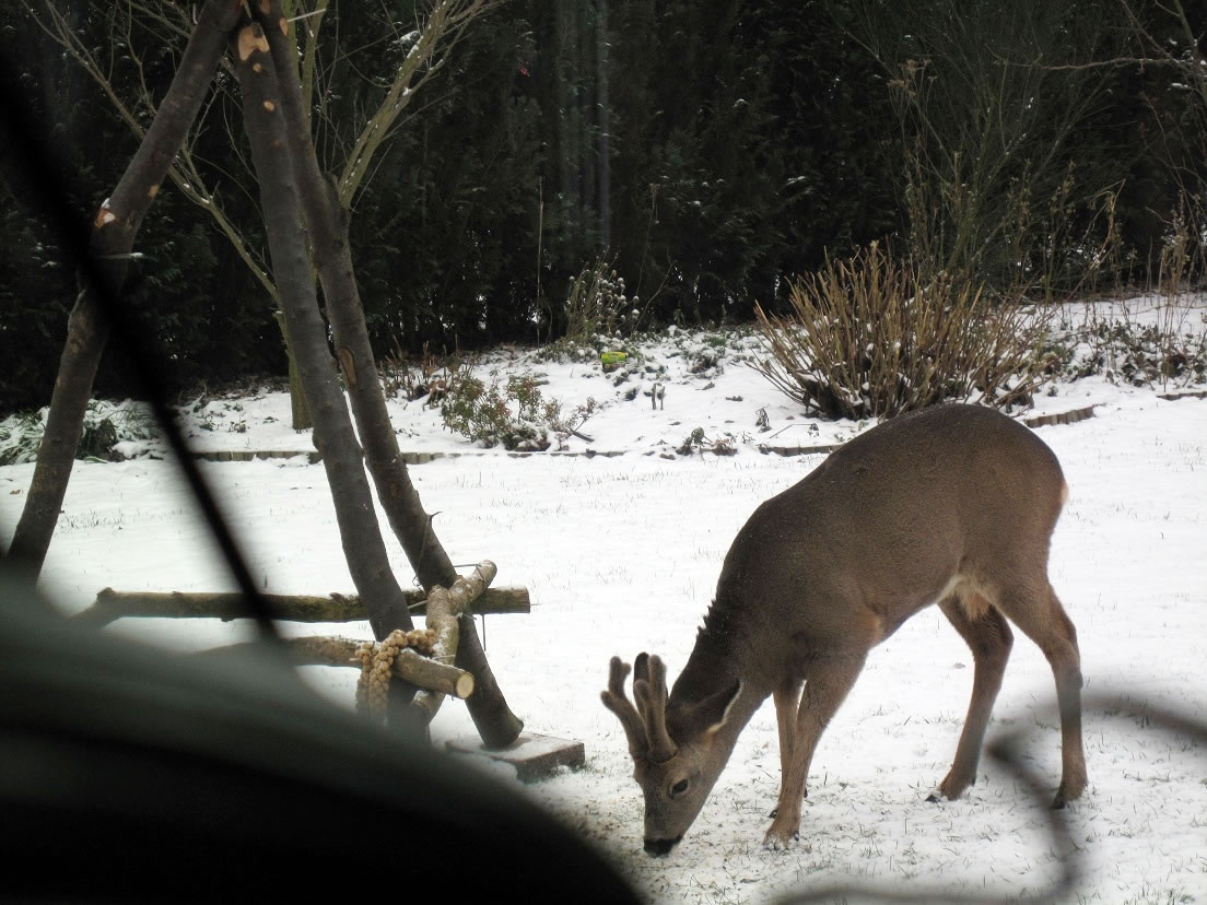 Worüm ok jümmers, se sünd goot to höörn, de Spechte, man to sehn kriggt man dissen Vagel eher selten. Ik aver heff vör poor Daag Glück hatt. En Buntspecht harr sik över den letzten Meisenbüdel hermaakt, den mien leef Mann noch ruthangt harr. He harr dat nich licht mit den Meisenbüdel, de för veel lüttere Vagels maakt weer. Ik kunn em also "infangen". He weer wohl noch en jungen Vagel, denn he harr noch de rode Huuv up'n Kopp. De Biller köönt Se per Klick