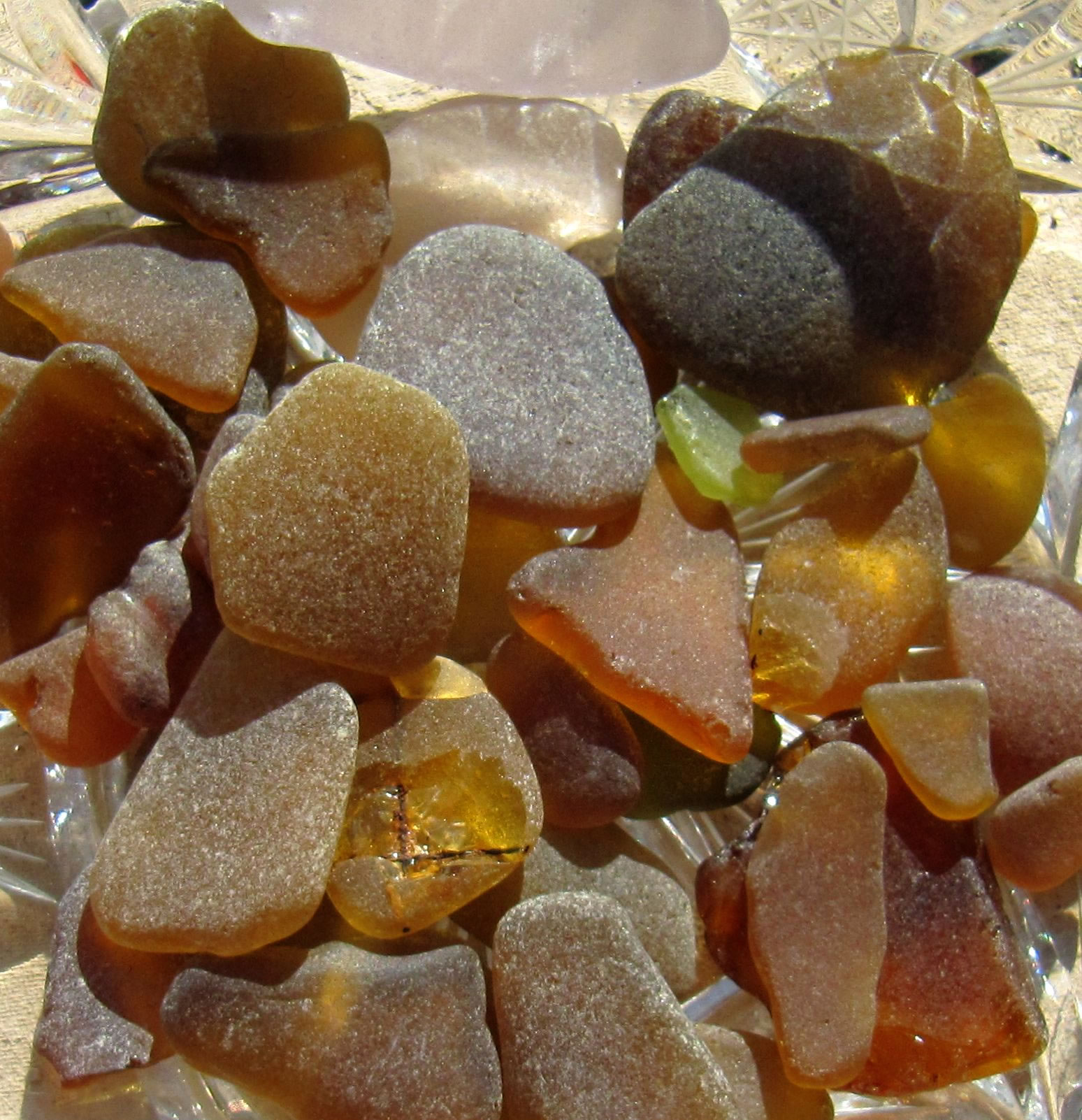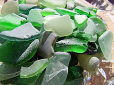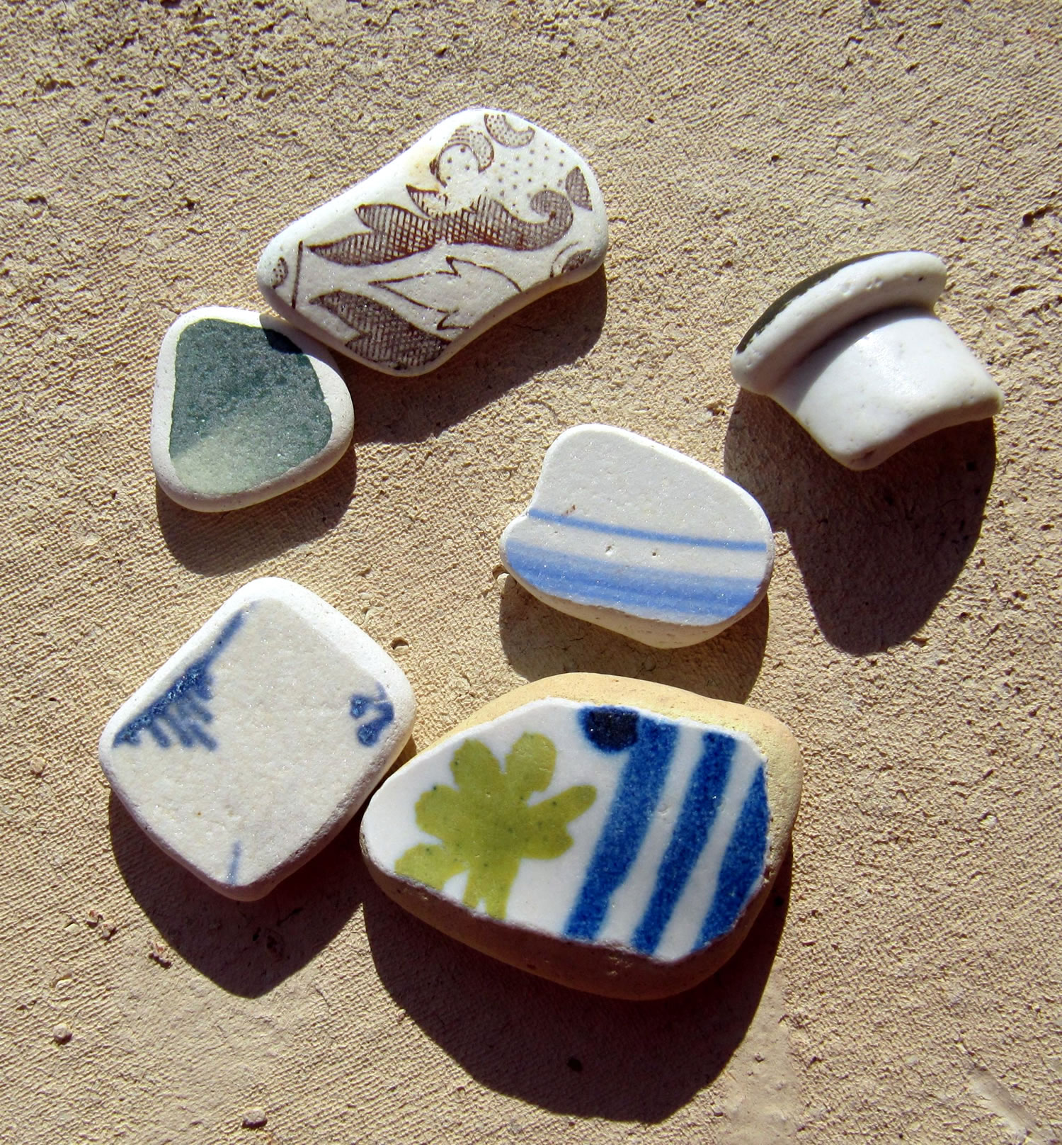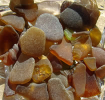 He hett ja Recht, mien leef Mann, ik gah dorüm ok veel lever alleen an't Water lang un freu mi an allens, wat dor so rümliggen deit, as Muscheln orrer Steen orrer ok an Schören. Mehrst sünd dat Schören ut Glas, blaag, gröön, witt, bruun. Bi de brunen Schören krieg ik elkeenmal enen lütten Kick: "Sull dor en Stück Bernstein liggen?" Man nee, mehrst is dat weller en Schöör. Un wiel de Glasschören in't Water vun de Wellen jümmers hen un her beweegt warrt un dor denn bi över den Grund schraapt, sind de Stücken all glatt un rund un fein in de Hand to hollen. Un so'n Stück kann ik denn doch nich liggen laten! Dat mütt doch jedereen insehen. Na ja, togeven, ik heff tohuus en ganz Glas vull mit Schören aver ik freu mi jümmers to elkeen nieget Stück. Wenn ik dat Glasstück an'n Strand find, denn is dat natt un lüücht so'n beten. Wenn dat Stück denn dröög is, wenn dat also hier bi uns up't Schapp in en Glas liggt, denn sünd de Stücken wat stuff, matt, licht witt. Glänzen doot se denn nich mehr. Ok Keramik-Schören heff ik al funnen. Un denn kiek ik mi de Muster an un sinneer, to wat för'n Gegenstand disse Schöör wohl mal höört hett un woso disse Pott wenn't denn en Pott weer wohl in't Water kamen is. Dor kannst di denn wunnerschöön Geschichten to utdenken. De Biller köönt Se per Klick