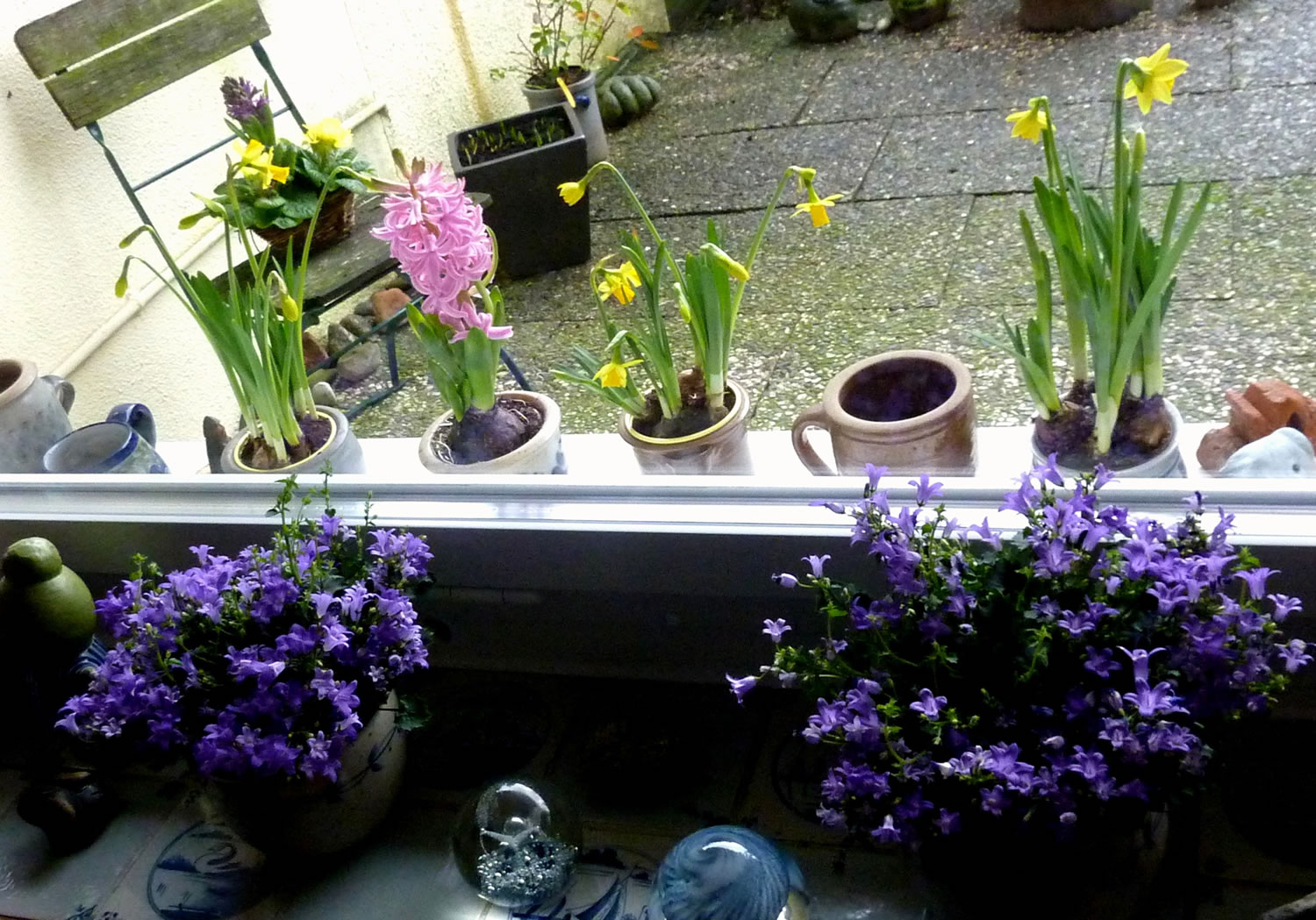 Wenn se dat nu ut Hunger daan harrn, denn wörr ik ja nix seggen man direkt dorneven steiht mien leev Mann sien groot "Vagelvilla", de jümmers goot mit Vagelfoder füllt is. Dor köönt se freten, de Drosseln un Kreihen, man doch nich miene Blomenzibbeln ut de Eerd rieten! Nee dat is ganz un gor nich in Ordnung! Ik heff fix mit dat Vagelvolk schimpt.