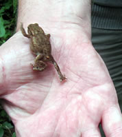 30.4.12 . .Rana en echten Pogg! Wat weer ik verwunnert över de Utkunft vun den lütten Pogg, den ik tofällig funnen harr! Dat weer en echten Pogg (lat. Rana)! Gifft dat ok unechte Poggen? As ik letzten Sünndag mit mien Mann mit Auto dörch den Woold föhr, wöör ik an den Rand vun en Waldweg de ersten Mööschen wies. Glieks heff ik anhollen, dat müss ik genauer ünnersöken. Un wohrhaftig, an de Kannt vun den Weg wussen n'Barg Mööschen up en lütten Wall. Dor müss ik mi doch enen lütten Struß plücken un mit na Huus nehmen. De drögten Mööschen legg ik ümmer in mien Wäscheschapp mank dat Linnentüüch. Dat rüükt so goot. As ik up den Wall kladder un mi na de Mööschen bück, hüpp mi en lütten Pogg meist in't Gesicht. Ik heff mi böös verfehrt. Den Pogg harr ik wull ut sien Meddagsslaap haalt. He hüpp mank dat verdröögte Loof un dörch de Mööschen vör mien Fööt. Denn sett he sik up en Blatt. Gau haal ik mien Knipskassen ut de Tasch. Aver dor weer de Pogg al wieder hüppt. Endlich wöör ik em wedder wies. Aver in den Momang, as ik up den Utlöser drücken wull, swupp!, hüpp he al wedder wieder. Ik ümmer achterna. Dat güng den Wall up un daal un duer so lang, bit ik in't Gras full. Mien Mann müss mi wedder hoochtrecken. Nahdem ik mi dat Loof un de Dannennadeln vun de Büx kloppt harr, fraag he: "Hest denn nu wenigstens en godes Bild vun em maakt?" "Dat weet ik doch noch nich, ik mütt eerst mal nakieken!" As ik em denn up dat Display vun mien Knipskassen den Pogg wies, meen he: "Dat hett sik ja richtig lohnt! Dat is ja en ganz besünneres Exemplar!" Ja, dat weer en echten Pogg, en Moorpogg! De Biller köönt Se per Klick