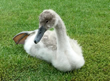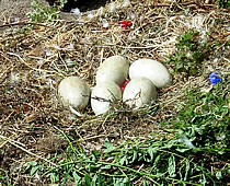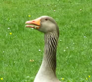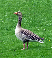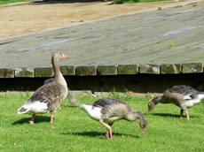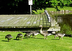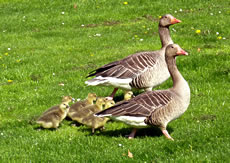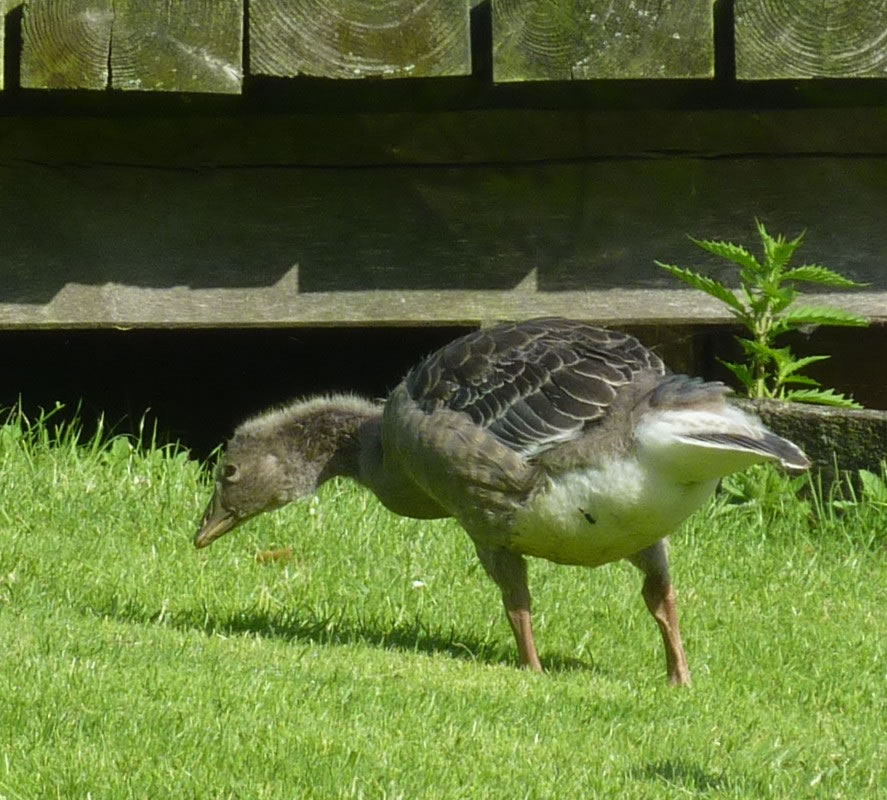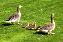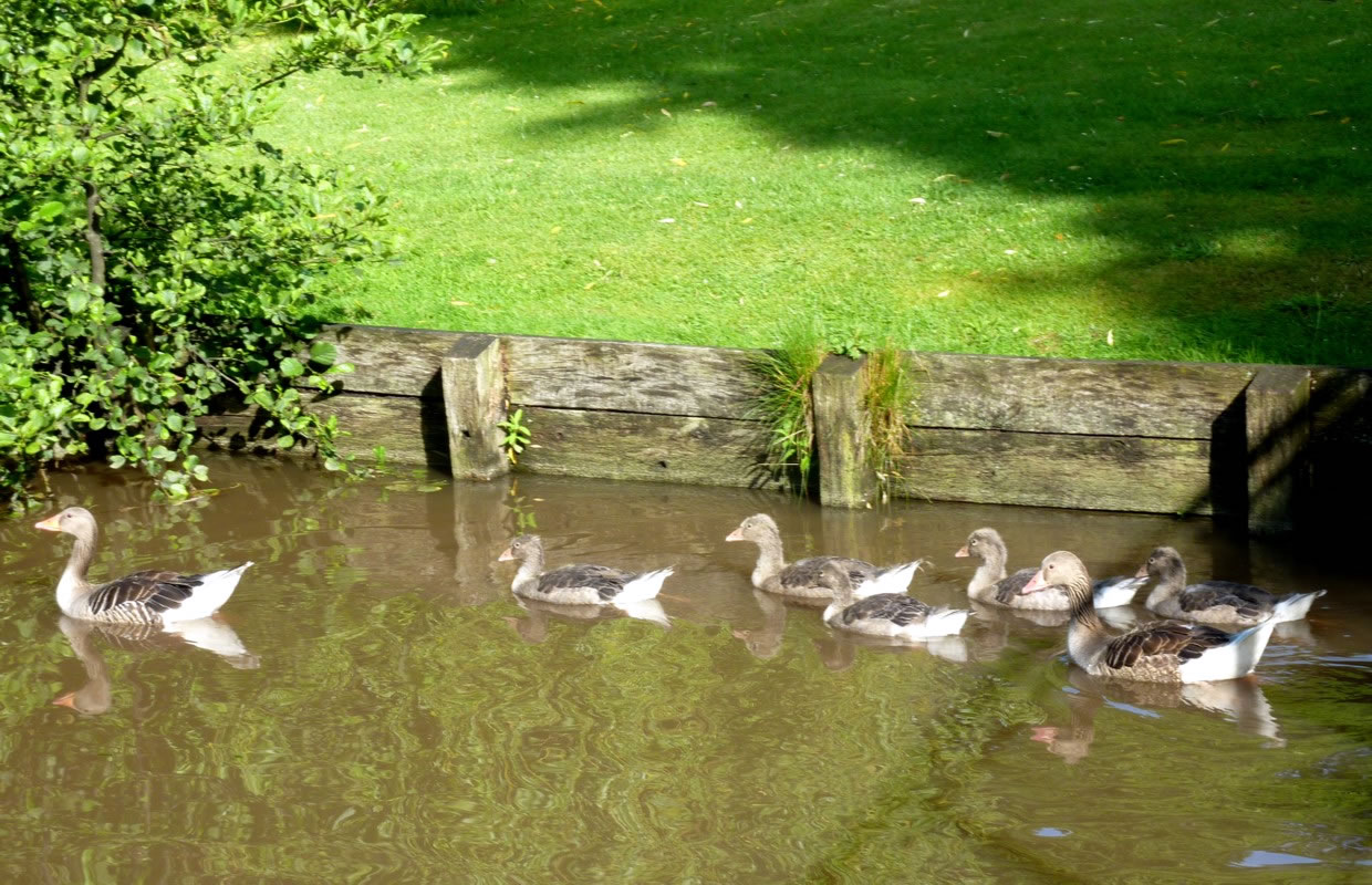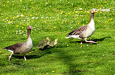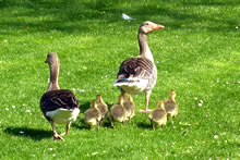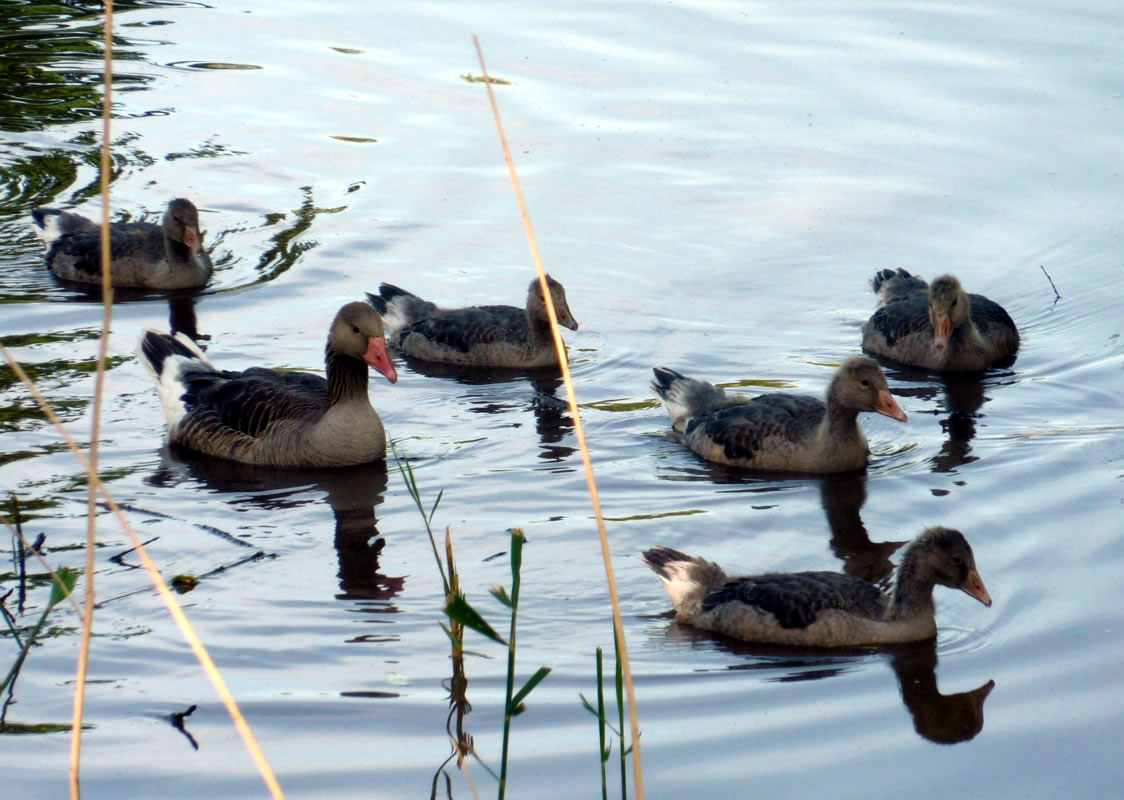 Se sünd wedder dor, de lütten Göös vun verleden Johr. De Öllern harr ik al mal in't Reet sehn. De fief Kinner bün ik hüüt dat eerstmal wies woorn. Kuum dat ik se wedderkenn. Mit luut "Ga, Ga, Ga!" flogen se över mien Kopp un lannen up den Rasen an den Karpendiek. Wat weern dat för smucke Graugöös woorn! De Gröötste keek mi an, as wenn se mi noch kenn. Se snack richtig mit mi. De annern leten sik dat saftig gröne Graas goot smecken. Ganz vörsichtig güng ik wat dichter ran. Aver dat leten se doch nich to. Se böörn ehr Köpp hoch un snacken miteenanner. Denn flogen se all över den Diek. Of de wull hier an den Diek ok mal en Nest buut? De Biller köönt Se per Klick