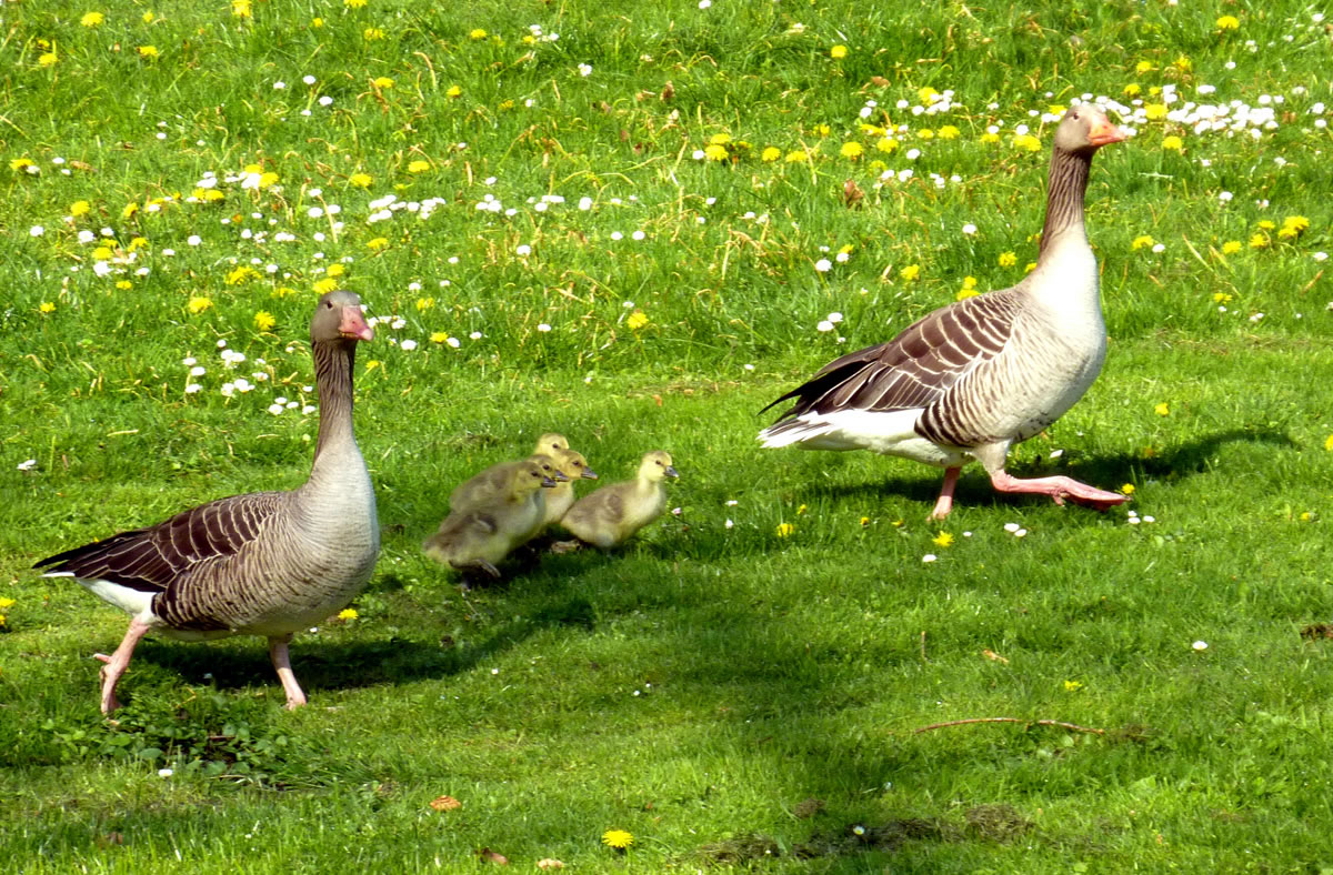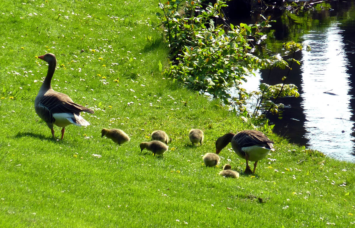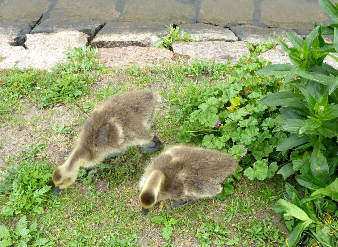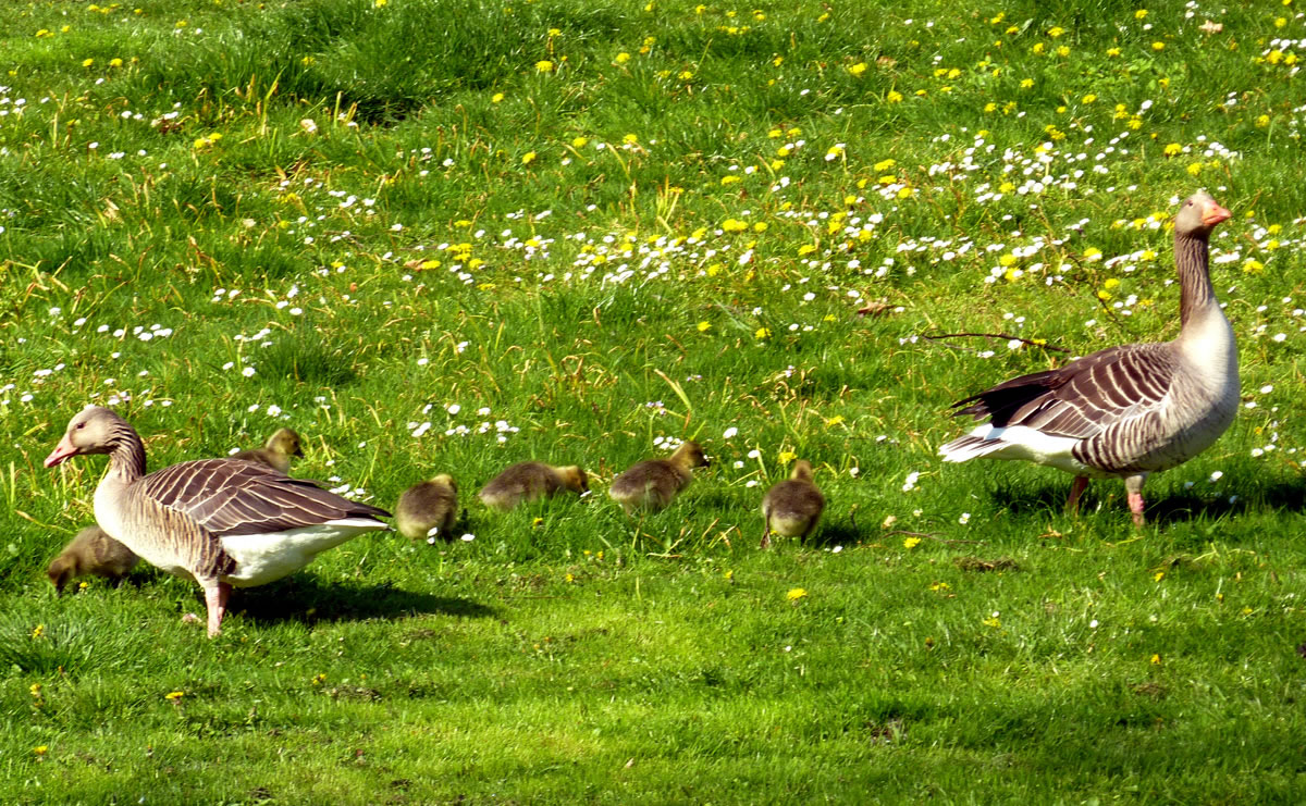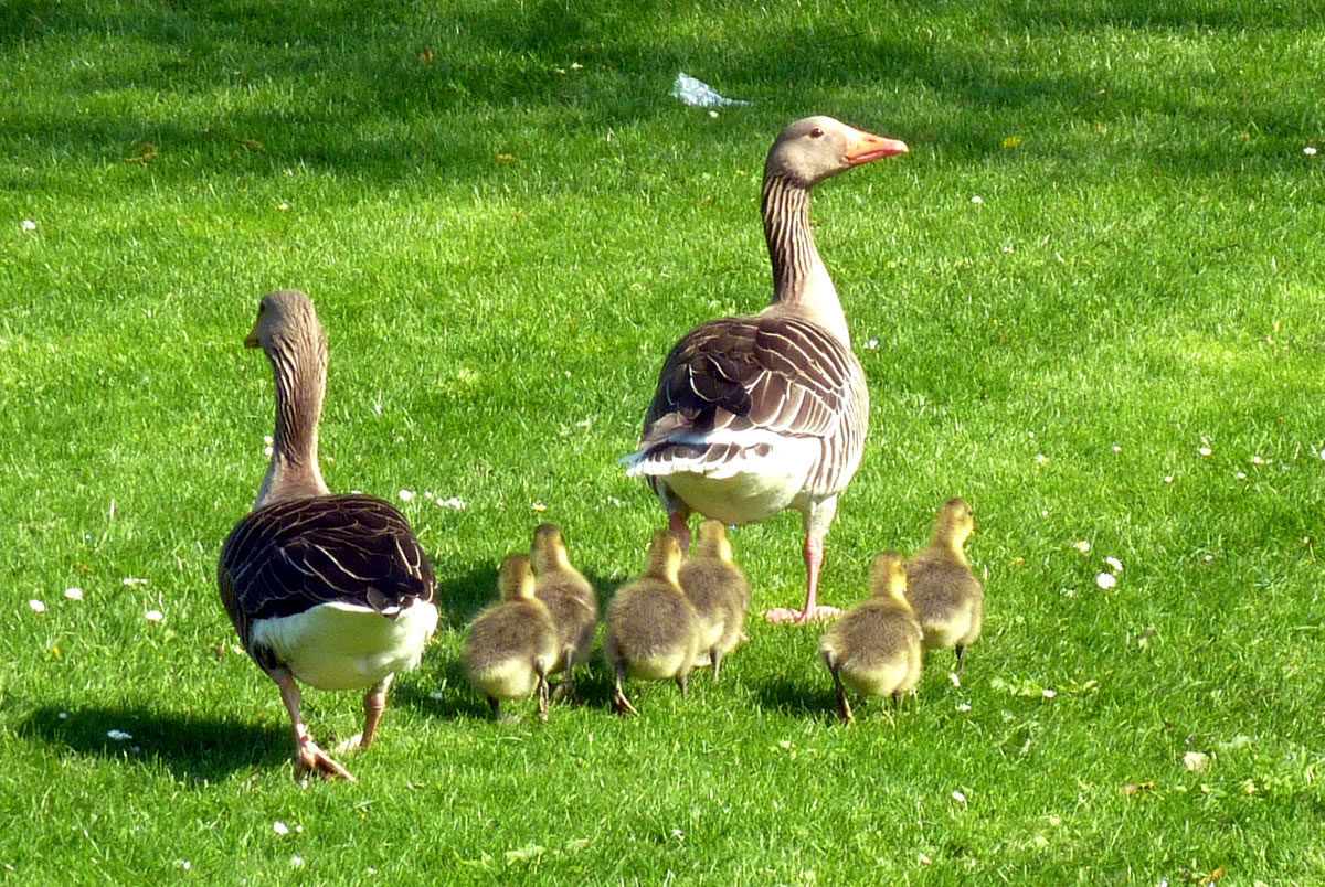 Vadder un Modder passen beide goot up ehr Gössel up. Se leten se nich ut de Ogen. Ik dörf nich to dicht mit mien Knipskassen rankamen. Denn zischen se mi an. Se wiesen ehr Kinner den Weg över de Straat up de grönen Rasen. Dor geev dat frisches Gras. De lütten Gössel un ok de Öllern leten sik dat goot smecken. De Nonnengöös harr ik al mal as Togvagels in Harvst an de Noordsee beluurt. Dor gifft dat regelrecht Nonnengöösdaag. Hunnerte vun Vagels kemen ut den Noorden. De mehrsten flögen wieder. Up de saftigen Wieschen hebbt se sik eerstmal so richtig satt freten. Dor sünd denn wull mal enkelte Vagels hier bi uns bleven. De Biller köönt Se per Klick