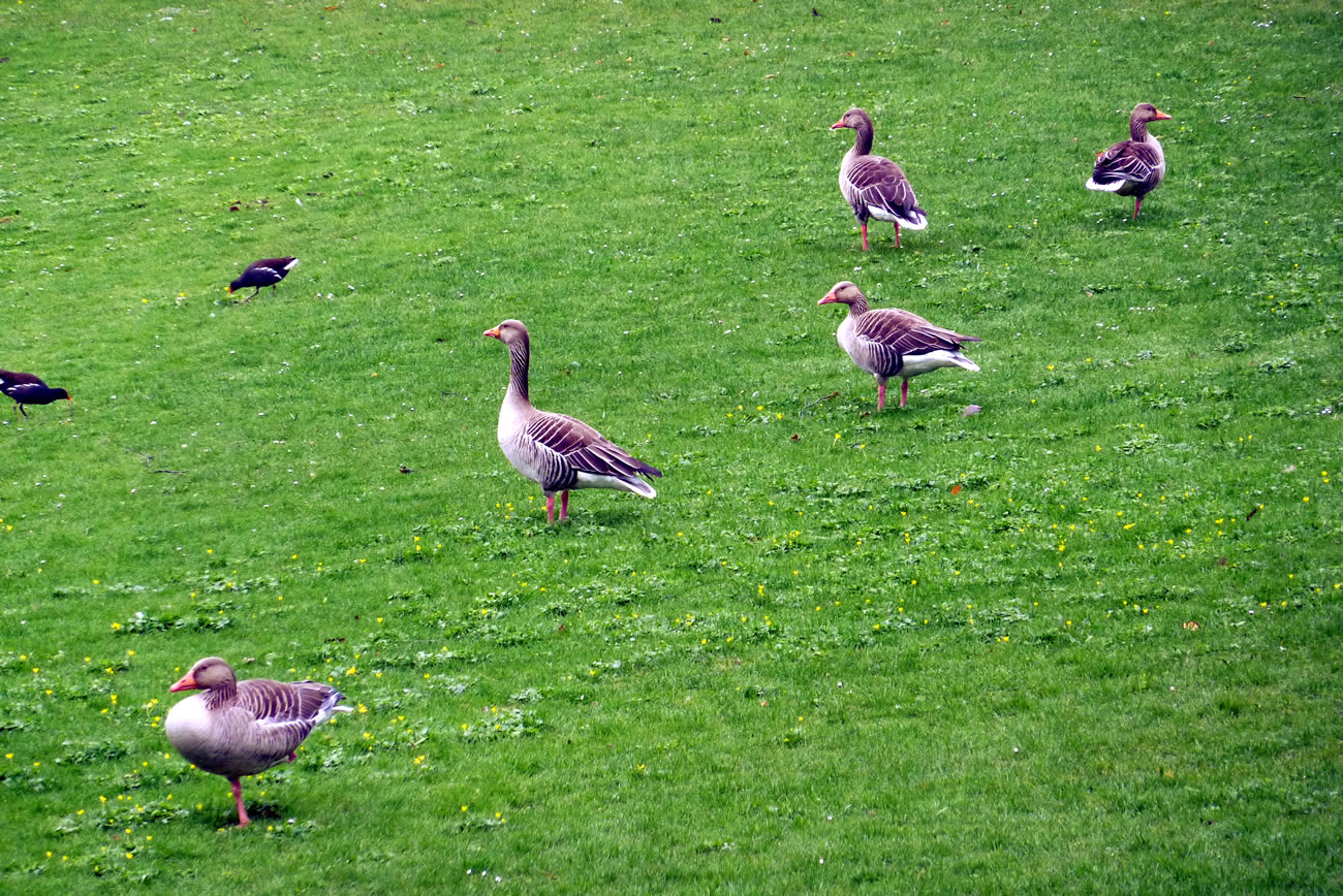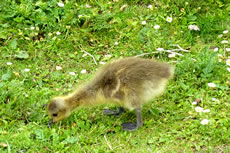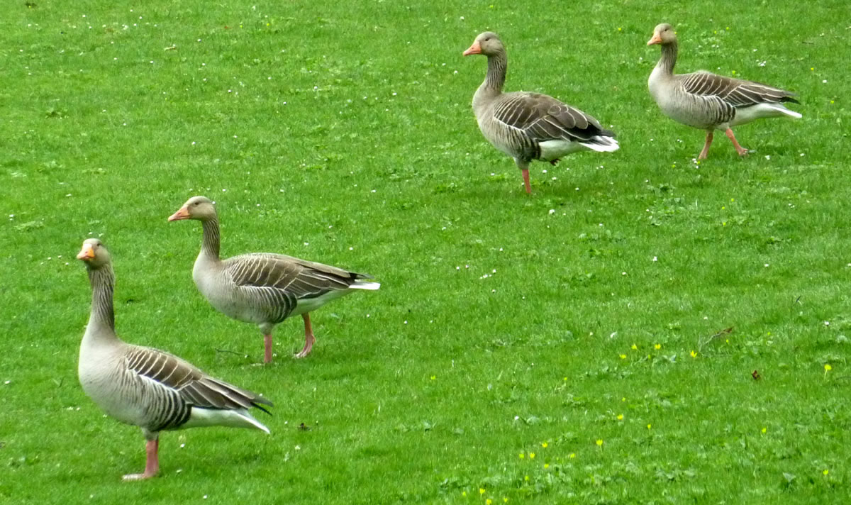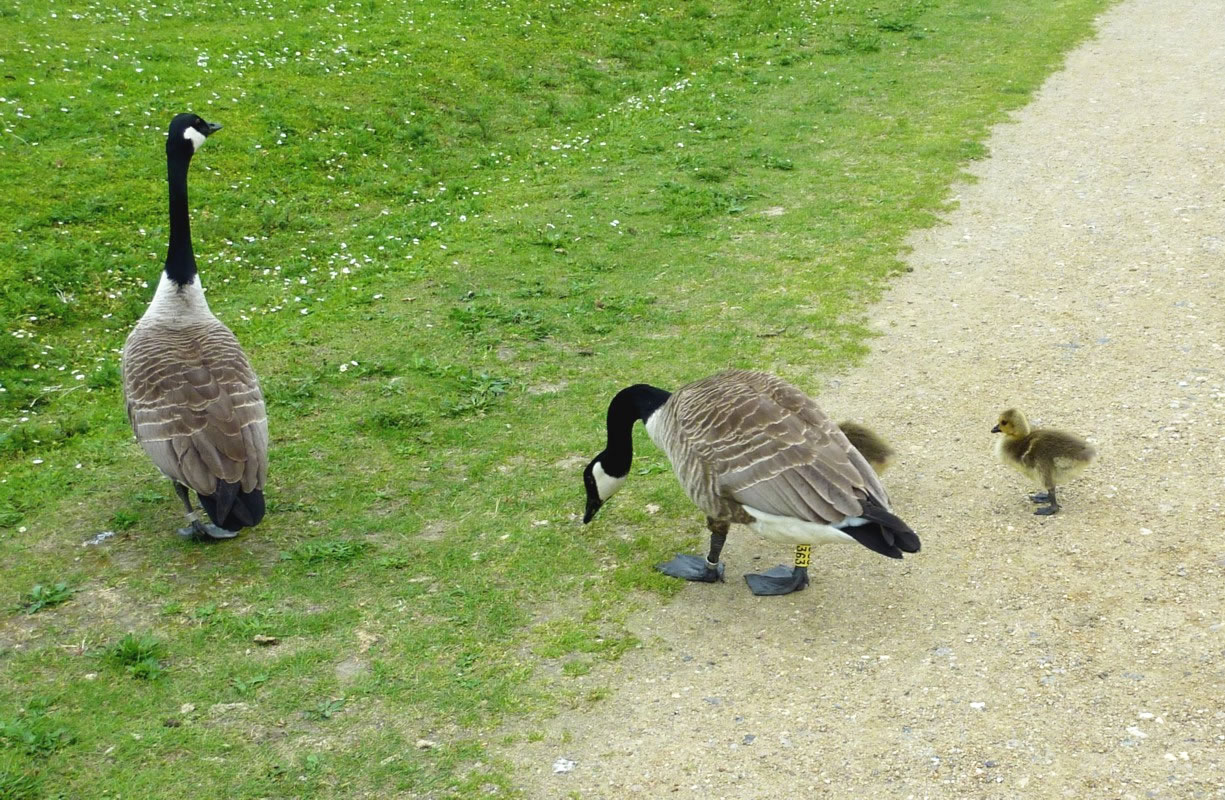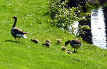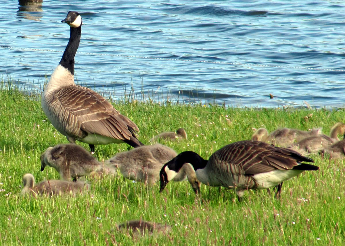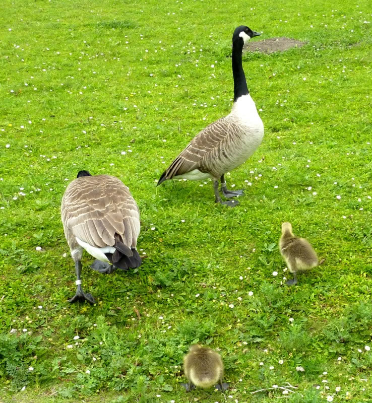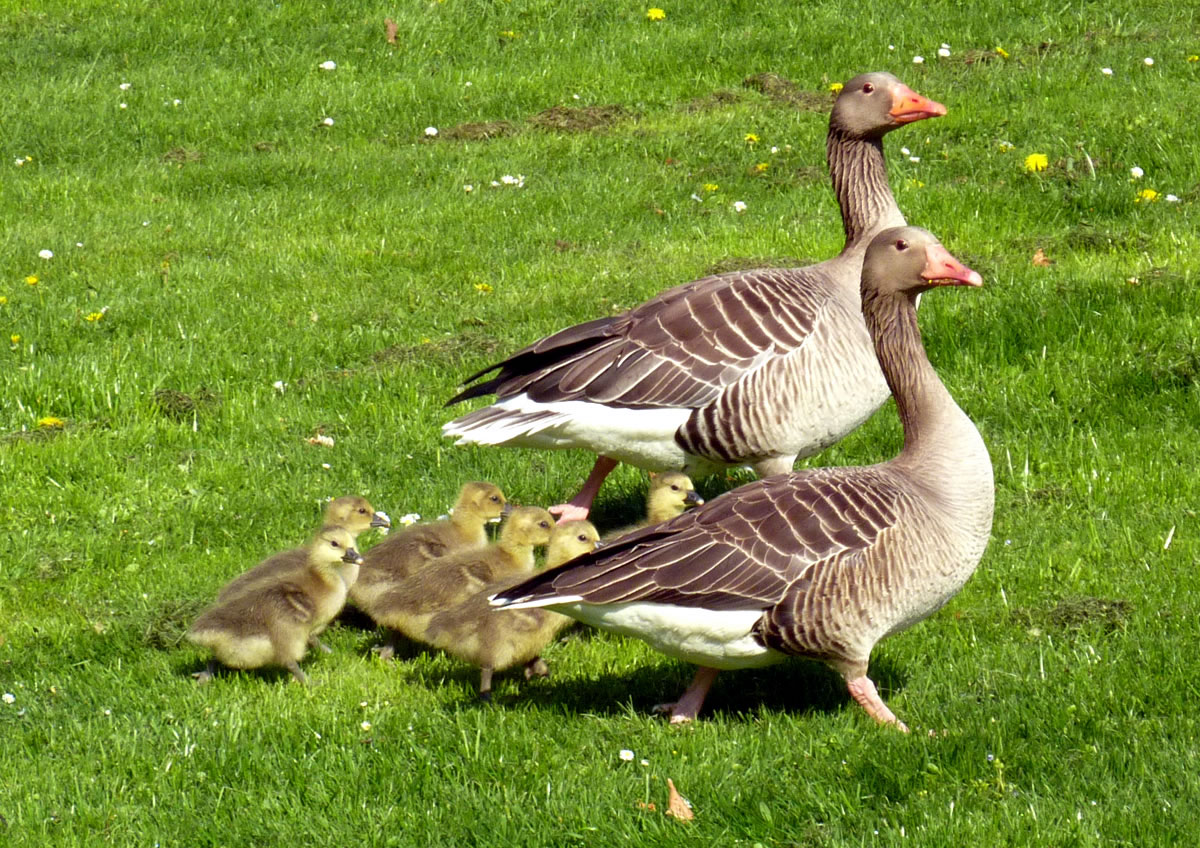 Vadder un Modder passen beide goot up ehr Gössel up. Se leten se nich ut de Ogen. Ik dörf nich to dicht mit mien Knipskassen rankamen. Denn zischen se mi an. Se wiesen ehr Kinner den Weg över de Straat up de grönen Rasen. Dor geev dat frisches Gras. De lütten Gössel un ok de Öllern leten sik dat goot smecken. De Nonnengöös harr ik al mal as Togvagels in Harvst an de Noordsee beluurt. Dor gifft dat regelrecht Nonnengöösdaag. Hunnerte vun Vagels kemen ut den Noorden. De mehrsten flögen wieder. Up de saftigen Wieschen hebbt se sik eerstmal so richtig satt freten. Dor sünd denn wull mal enkelte Vagels hier bi uns bleven. De Biller köönt Se per Klick