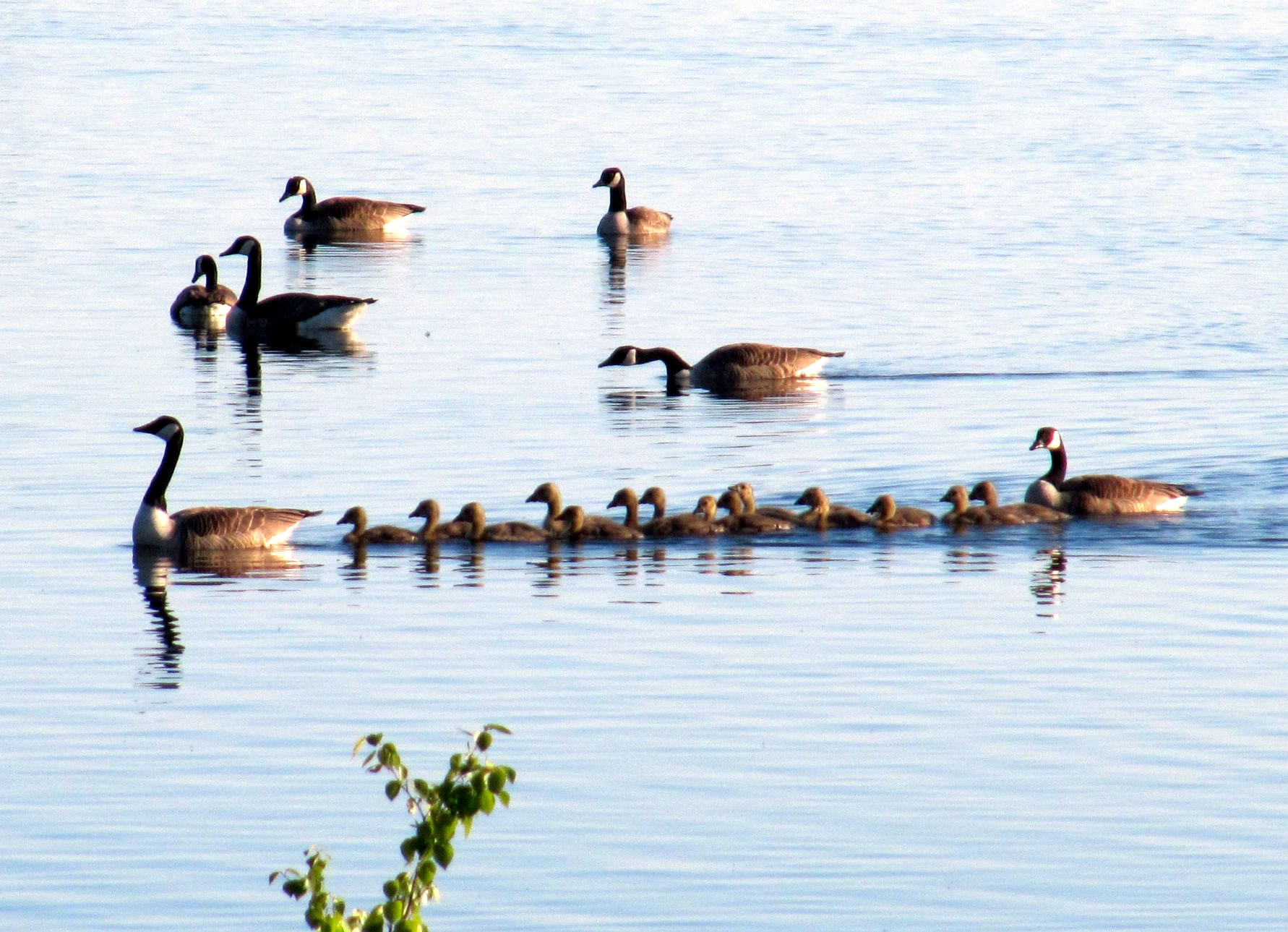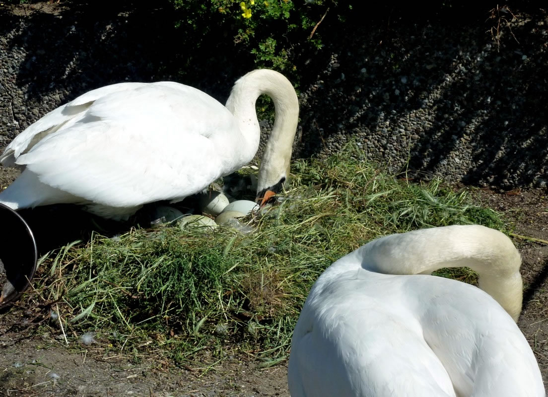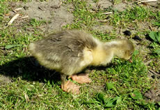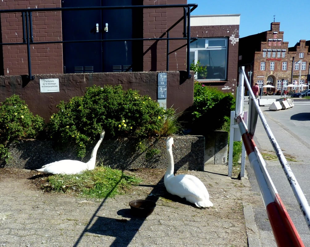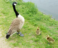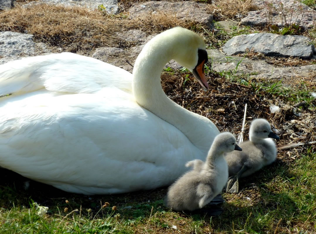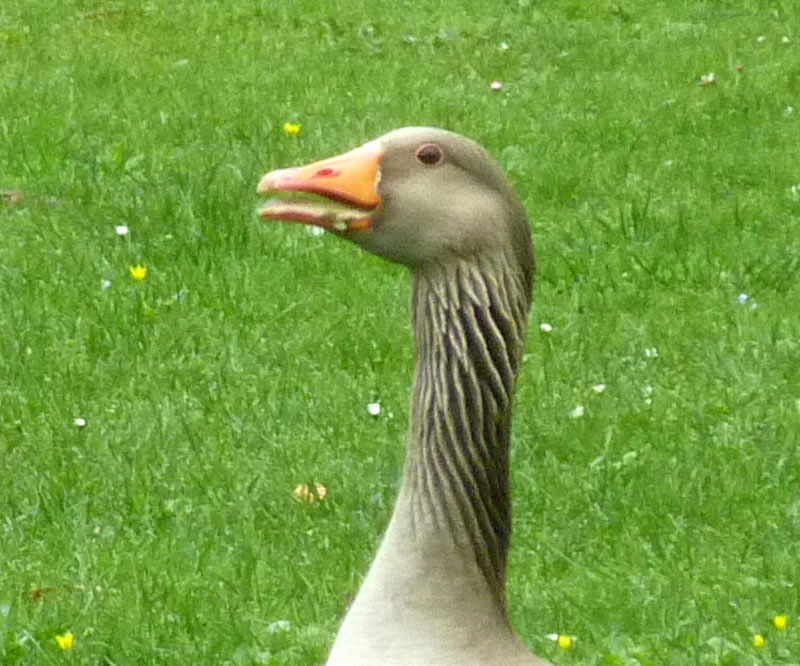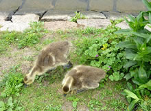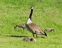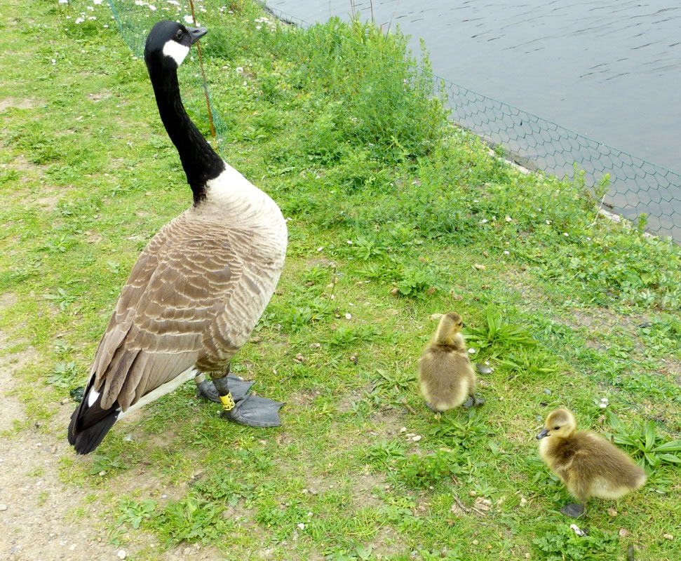 Vadder un Modder passen beide goot up ehr Gössel up. Se leten se nich ut de Ogen. Ik dörf nich to dicht mit mien Knipskassen rankamen. Denn zischen se mi an. Se wiesen ehr Kinner den Weg över de Straat up de grönen Rasen. Dor geev dat frisches Gras. De lütten Gössel un ok de Öllern leten sik dat goot smecken. De Nonnengöös harr ik al mal as Togvagels in Harvst an de Noordsee beluurt. Dor gifft dat regelrecht Nonnengöösdaag. Hunnerte vun Vagels kemen ut den Noorden. De mehrsten flögen wieder. Up de saftigen Wieschen hebbt se sik eerstmal so richtig satt freten. Dor sünd denn wull mal enkelte Vagels hier bi uns bleven. De Biller köönt Se per Klick