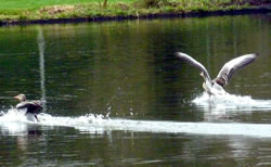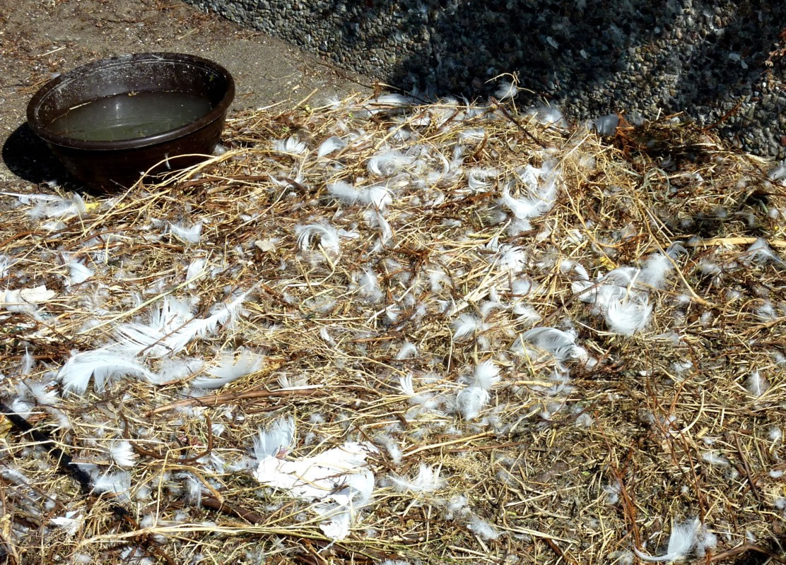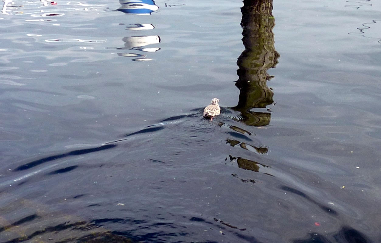 Al wedder kreisen twee Aanten schnatternd över mien Goorn. Nu lannen se ünnen bi de Vageltränke. Dat Water vun de Tränke blenker in Sünnenschien. Dat harr se wull anlockt. Aver dat weer doch keen Diek! Villicht harrn se ok blots Döst.
