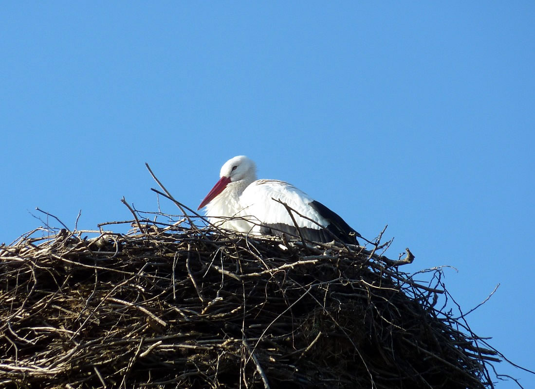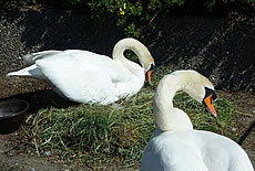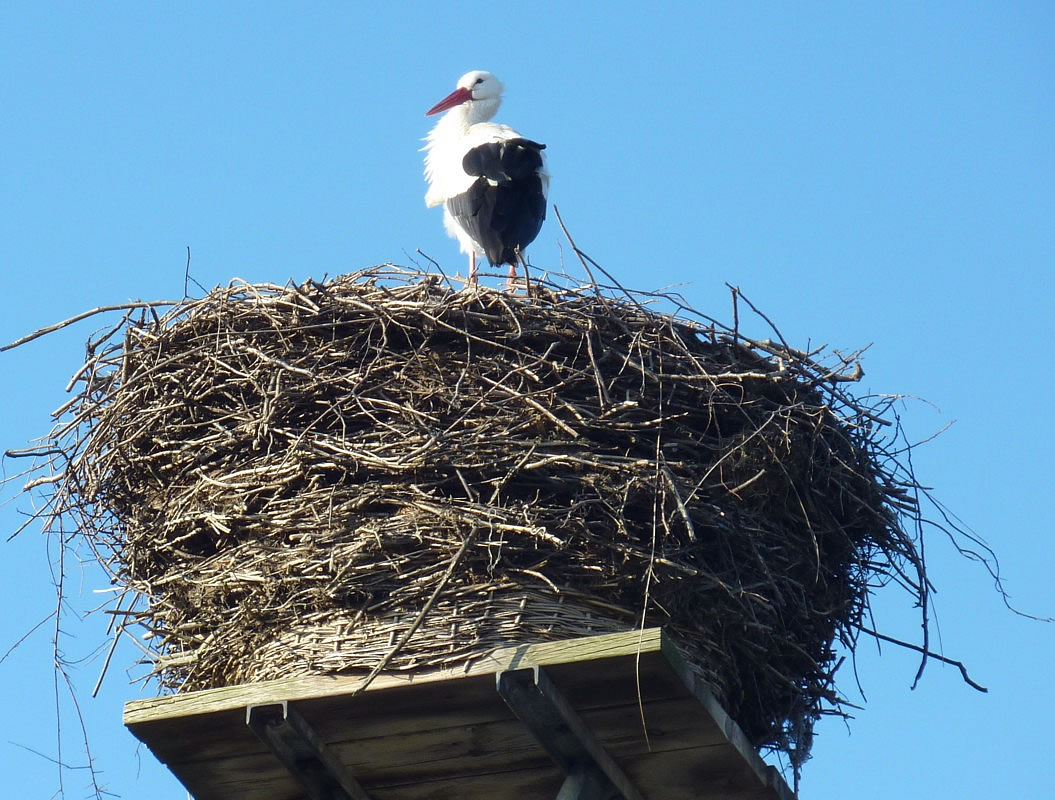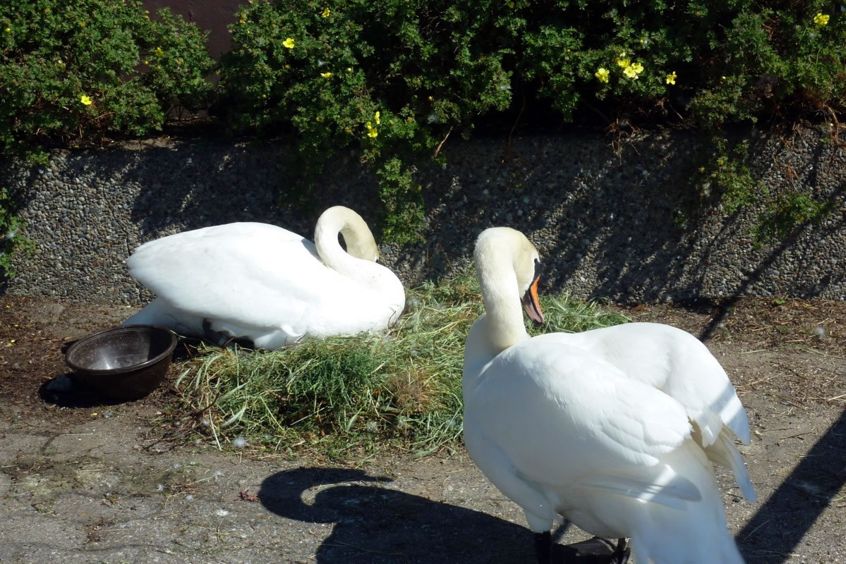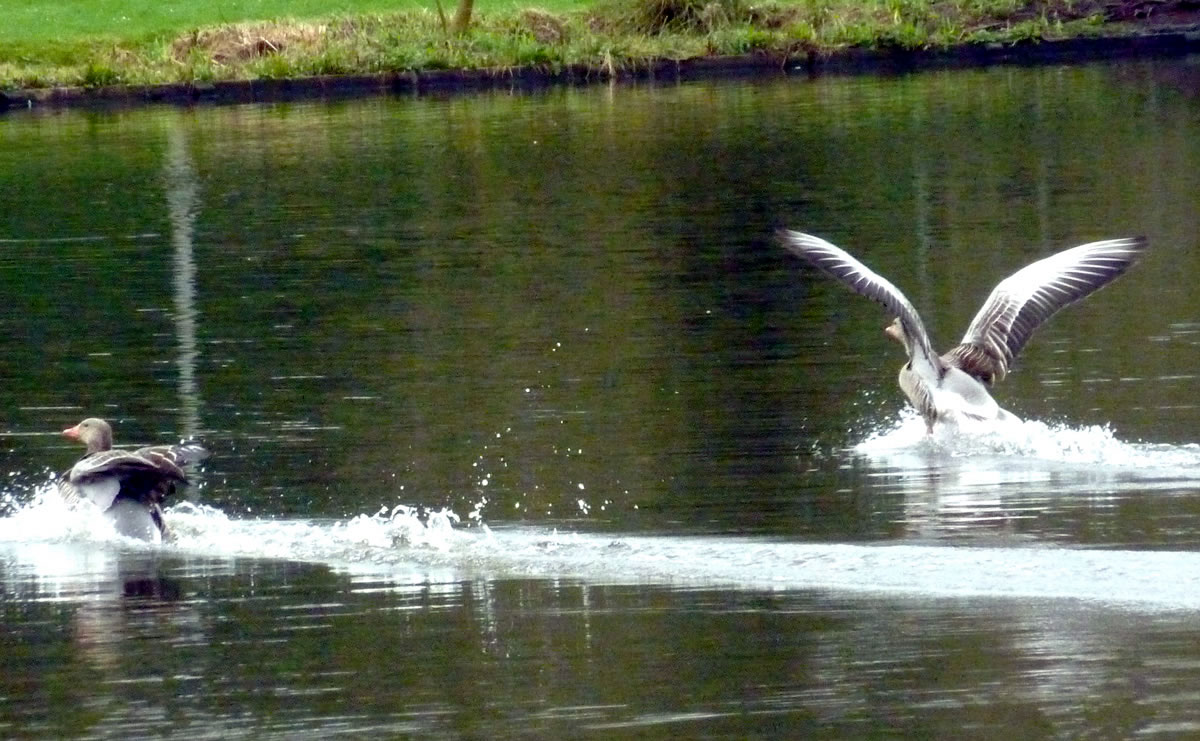 Dorna güng dat wedder na de ünnere Tränke. De viseteeren se nochmal wat ganauer un snattern miteenanner. Ehr'n Döst harrn se löscht, aver för en Nestbu nehm se ehr Eier leggen kunnen, weer hier in düssen Goorn nich de richtige Placken. Se nicken sik mit de Köpp to, breden de Flünken ut un flogen dorvun. De Biller köönt Se per Klick