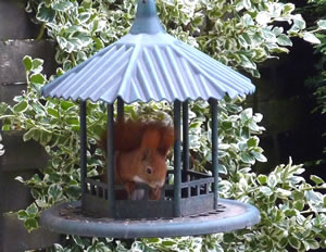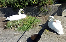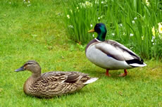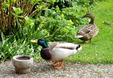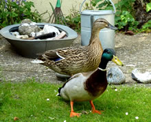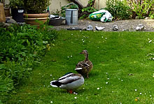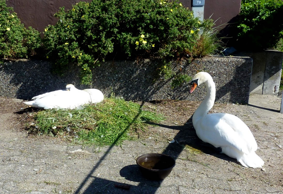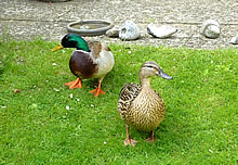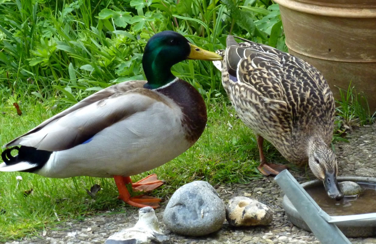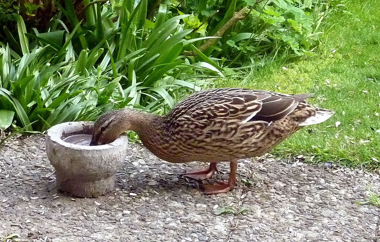 Denn watscheln se över den Rasen bit an de Terrass. Dor ünnersöchen se ok noch de beiden Vageltränken. De Aantenfru vörnweg. As treuen Ehemann watschel he ümmer achterna. Se söchen wull enen Placken, nehm se ehr Nest bugen kunnen. Aver dat weer wull allens nich dat Richtige.