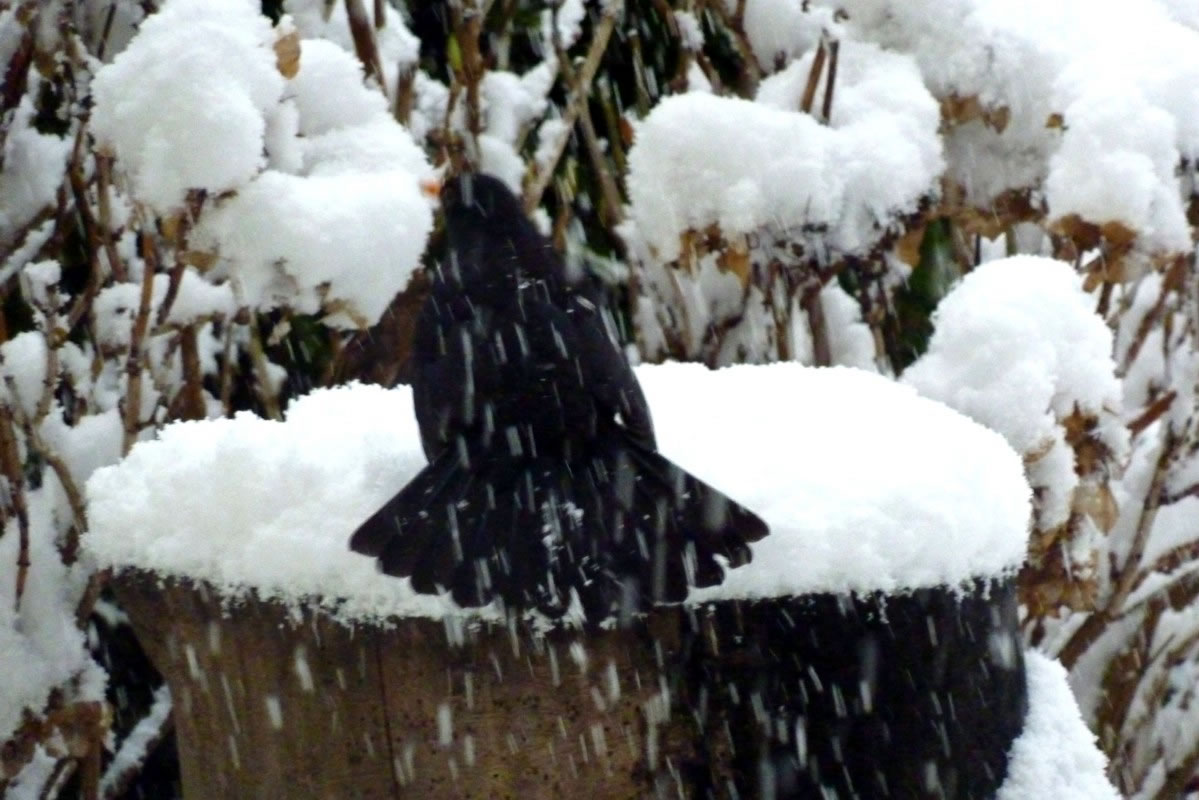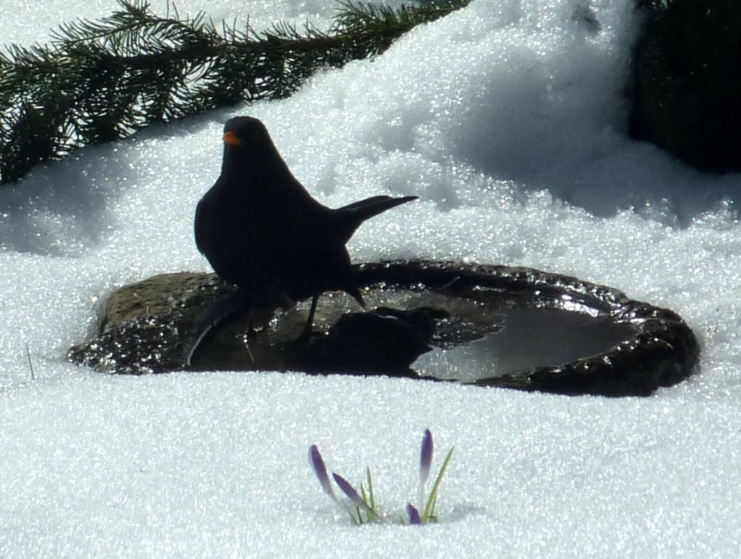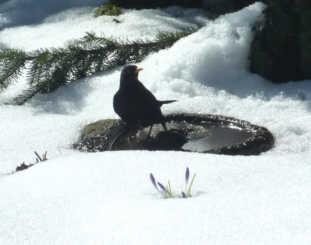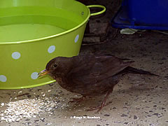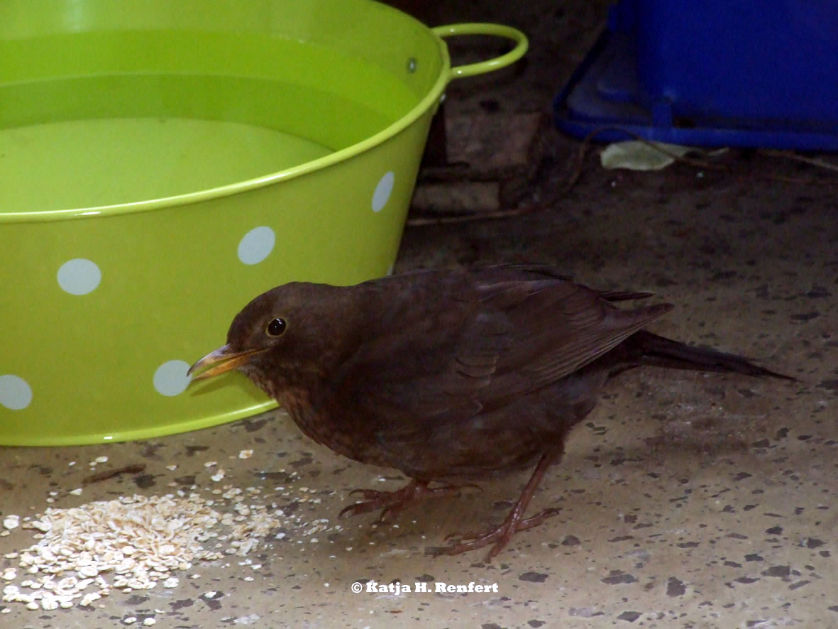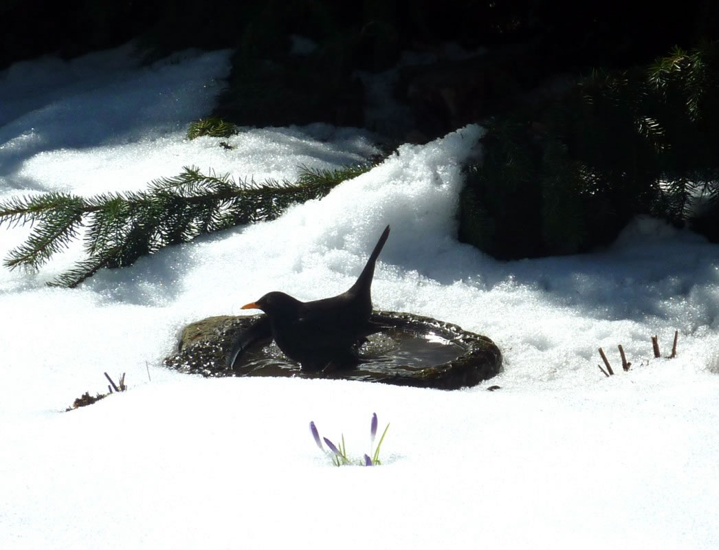 As ik na'n lütt Stunnstiet wedder rut keem, dor bleev ik miteens up'n Stutz stahn. De Vagels harrn miene niege Kumme to'n Badeplatz maakt. Graad tummeln sik dor mehre Blaumeisen in. En lütt Meisje seet mirrn in mien niege Schöttel un sprütt as dull üm sik rüm, denn hüpp se up den Schöttelrand un schüttel sik düchtig ut un denn glieks wedder rin in dat Natt un den Kopp ünnerdükern. Nee, weer dat possierlich! Mien leef Mann harr ja wohl bi't Rasensprengen de Schöttel vull Water "sprengt". Orrer sull dat Afsicht west sien? Up jeden Fall wüß ik nu, woto se bruukt warrt, de Schöttel. Se warrt uns Vageltränke! Veel Freud hebbt wi hatt an dit besünner Geschenk. Wi hebbt tokeken, wenn dat Rotkehlchen baadt hett, orrer de Finken. De Grünlinge kemen glieks mit de hele Familie. Wenn aver de Amsel keem, denn müß ik achteran frisch Water ringeten, so weer de jümmers an't Planschen un Sprütten. Anke Nissen