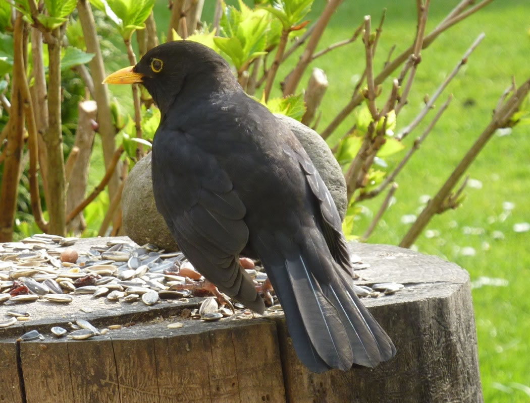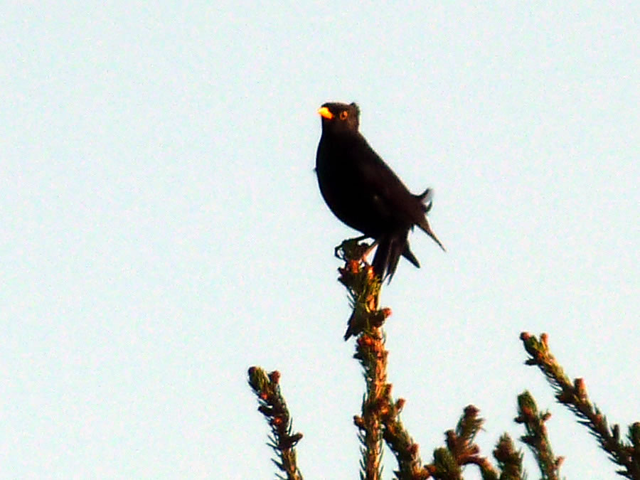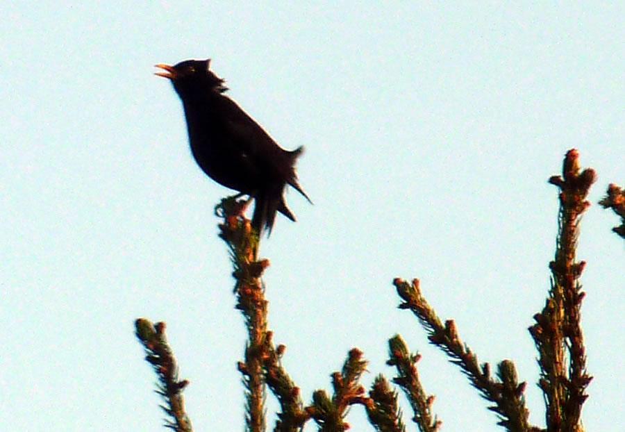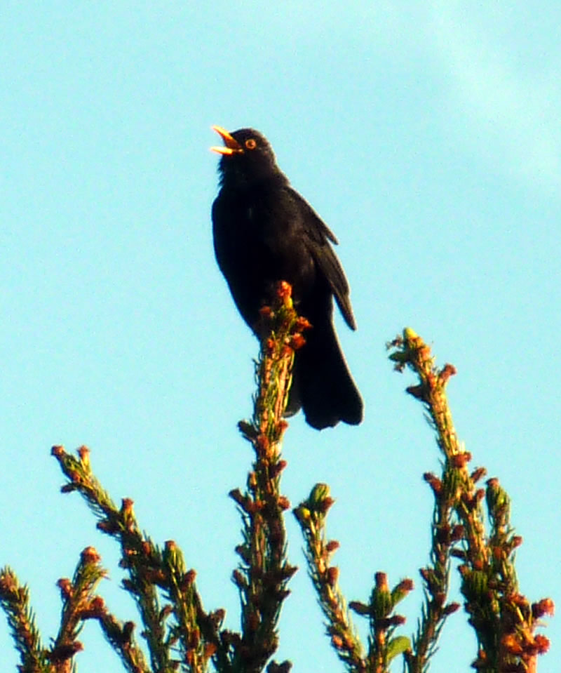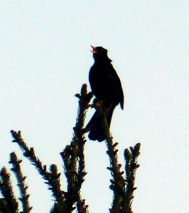 Up dat hüüt bi den stiefen Wind mit dat Avendleed vun de Amsel wat warrd? Ik weet nich so recht. De kann sik ja gor nich up de böberste Spitz vun de Dann hollen! Aver se keem wedder anflagen. Flatter üm den Dannenboom un balanceer up de Spitz. Endlich harr se dat schafft. Krall sik an de Dannennadeln fast un smetter wedder ehr Avendleed. Dat weer en reine Freud. Ut Navers Goorn keem sogoor en Anter. Neegsten Dag harr se dat lichter. De Wind weer inslapen un de Avendsünn warm ehr dat Fedderkleed. De gele Snavel lüüch richtig in de Sünn. Kunnst sehn, dat ehr dat Singen Freud möök. Un so geiht dat jeden Avend. Sülvst Regen kann de Amsel nich dorvun afhollen, uns en Ständchen to bringen. Wi hebbt ehr enen Naam geven. Dat is unsen Caruso! De Biller köönt Se per Klick