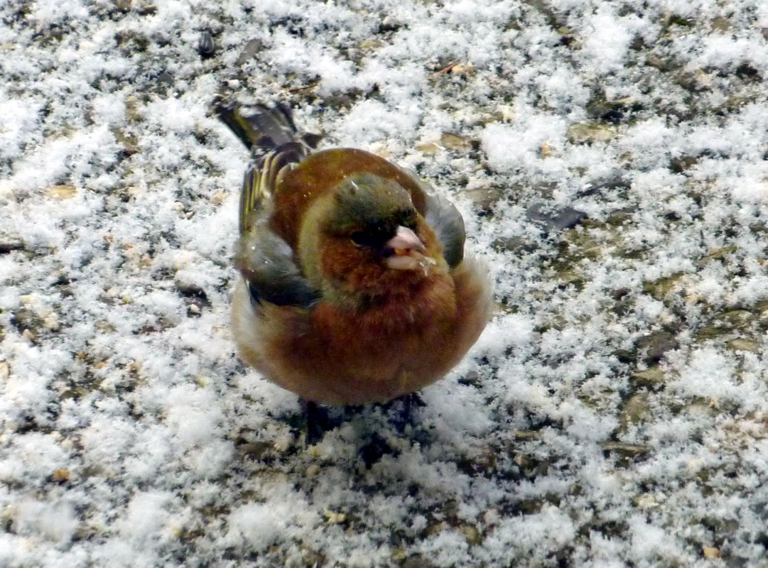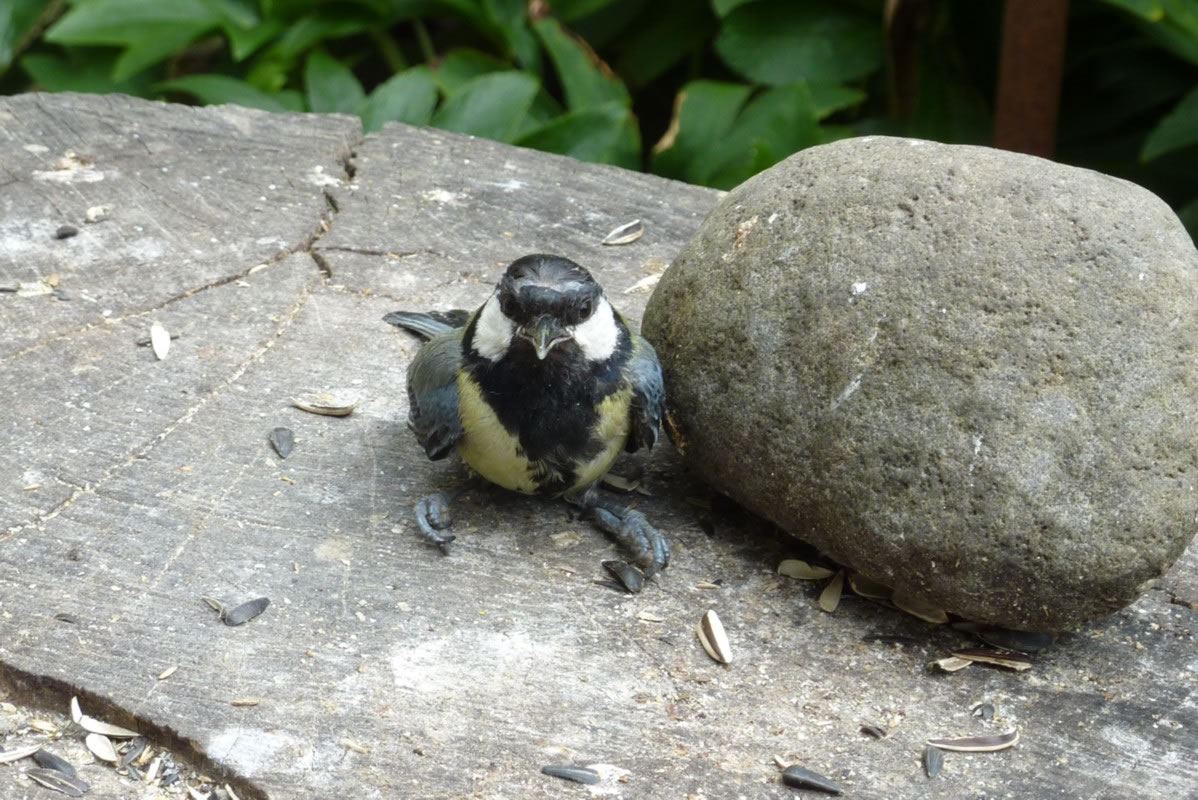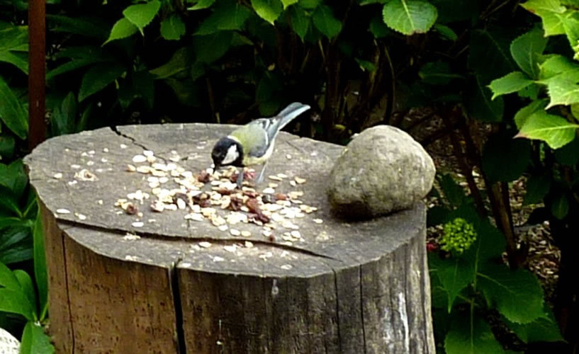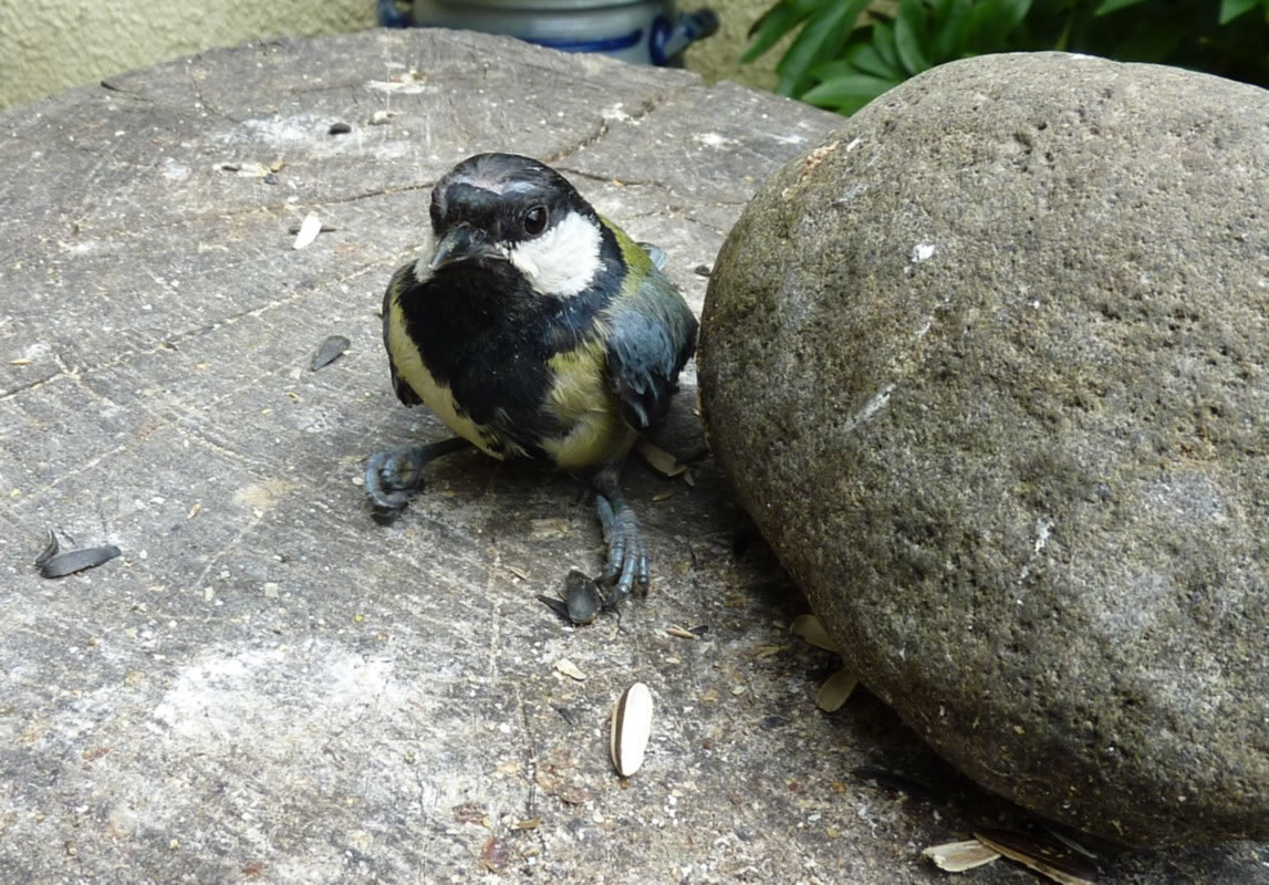 Mit sien groten Ogen keek he mi an. Sien lütten Fööt harr he tosamen krallt, stahn kunn he noch nich. Aver he dreih al den Kopp na mi. Up den Kopp harr he en richtig Buul. Natüürlich heff ik em mit mien Knipskassen fasthollen. As ik noch wat neger ran wull, breet he sien Flünken ut un flöög dorvun. Wat heff ik mi freut! Annern Dag seet he wedder bi mi up den Lünkendisch un hett sik satt freten. An de Buul up den Kopp kunn ik de Blaumeesch, den lütten Pechvagel, mank all de annern Meeschen rutkennen. He kümmt ümmer noch un is wedder richtig kregel. Toeerst sett he sik up den Haken vun de Blomenampel un kiekt üm sik, up de Luft rein is. Denn haalt sik de lütt Pechvagel wedder en Mahltiet vun den Lünkendisch. De Biller köönt Se per Klick