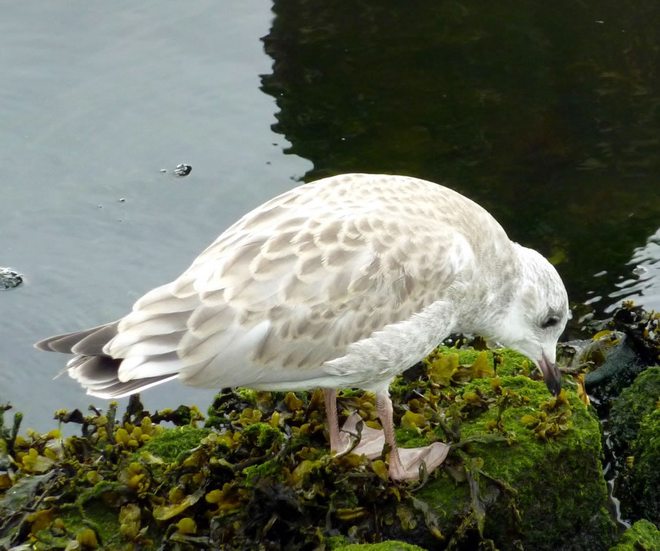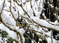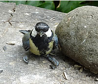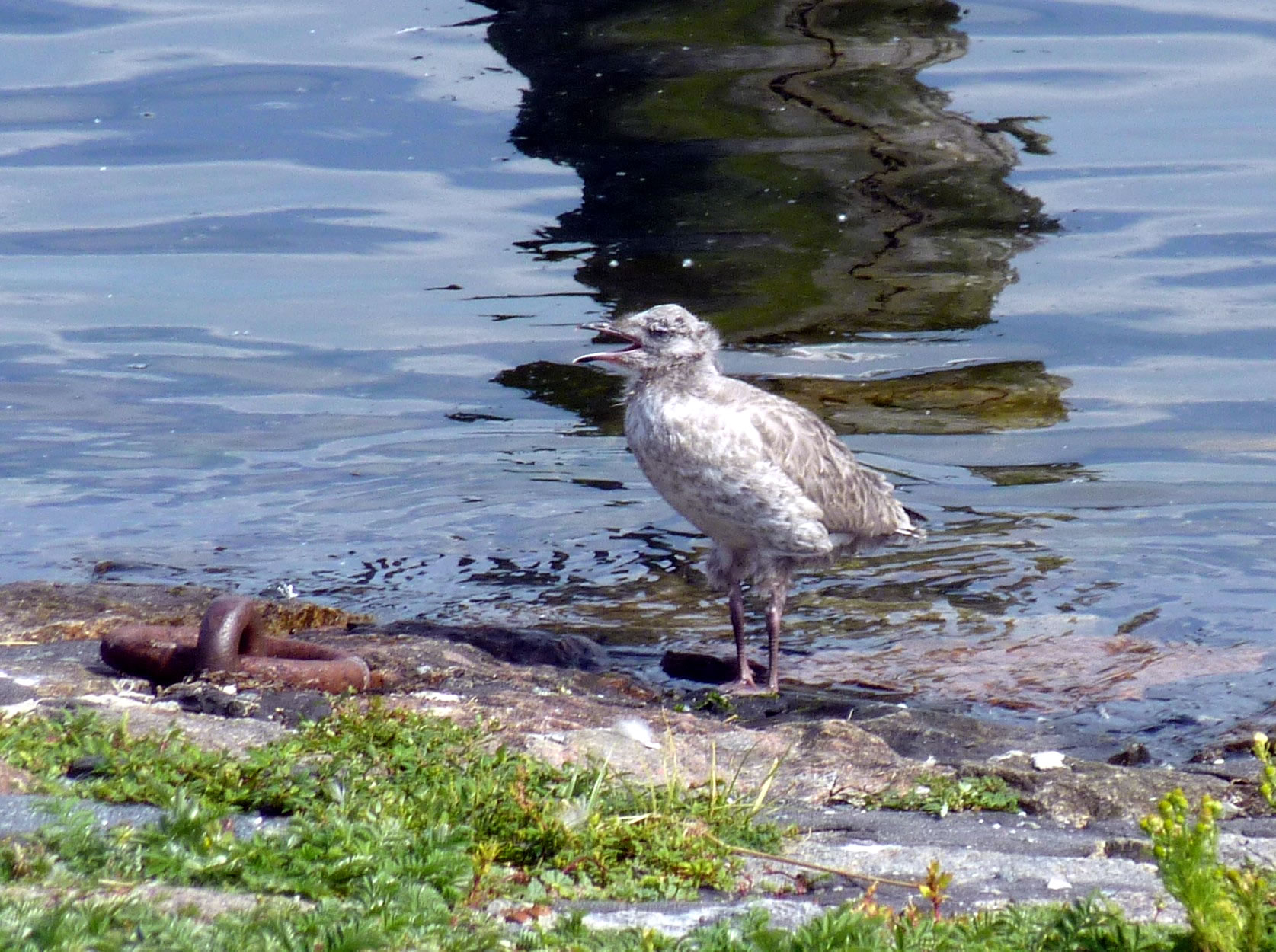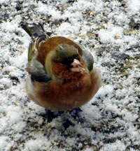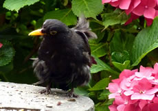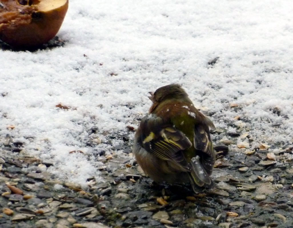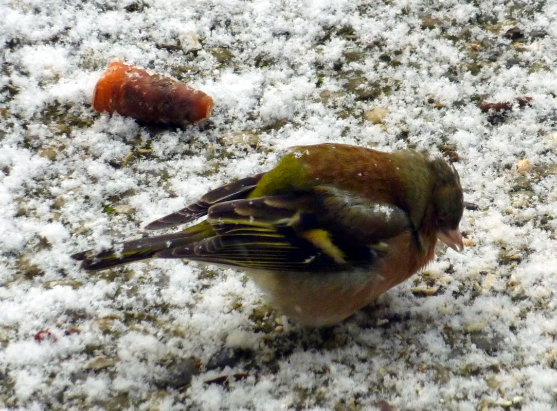 Mit sien groten Ogen keek he mi an. Sien lütten Fööt harr he tosamen krallt, stahn kunn he noch nich. Aver he dreih al den Kopp na mi. Up den Kopp harr he en richtig Buul. Natüürlich heff ik em mit mien Knipskassen fasthollen. As ik noch wat neger ran wull, breet he sien Flünken ut un flöög dorvun. Wat heff ik mi freut! Annern Dag seet he wedder bi mi up den Lünkendisch un hett sik satt freten. An de Buul up den Kopp kunn ik de Blaumeesch, den lütten Pechvagel, mank all de annern Meeschen rutkennen. He kümmt ümmer noch un is wedder richtig kregel. Toeerst sett he sik up den Haken vun de Blomenampel un kiekt üm sik, up de Luft rein is. Denn haalt sik de lütt Pechvagel wedder en Mahltiet vun den Lünkendisch. De Biller köönt Se per Klick