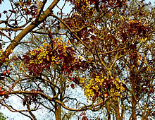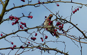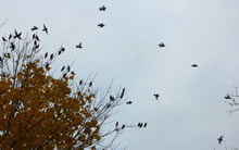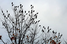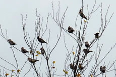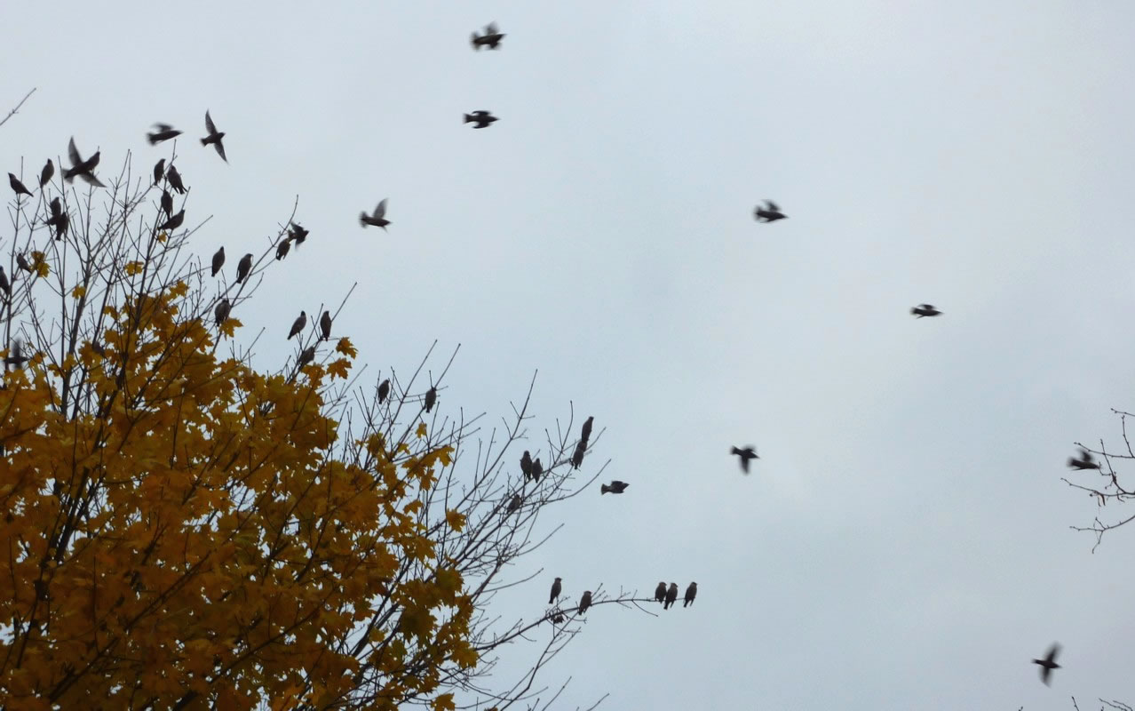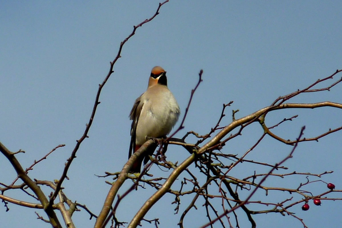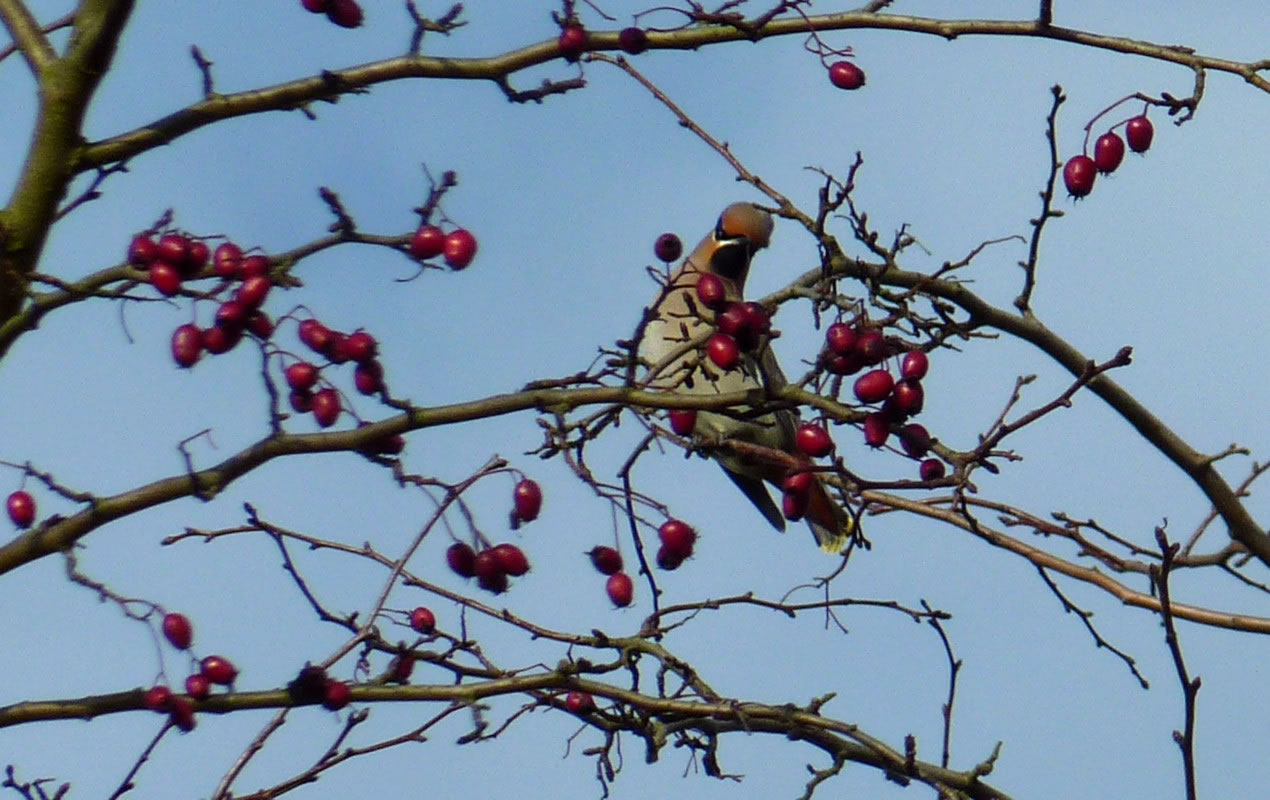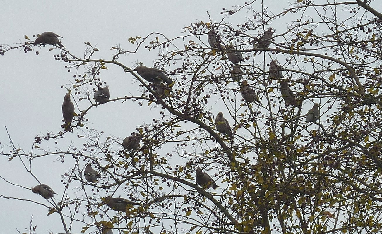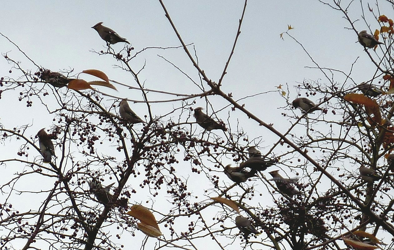 Neegsten Dag leet mi dat keen Roh. Ik müss nochmal na de Siedensteerten kieken. Un wohrhaftig kreisen vele Vagels in de Luft un setten sik up de kahlen Telgen vun enen Boom. De harr nu mehr Vagels as Bläder up sien Telgen sitten. Denn stöven se miteens los. All in Richt vun de Wittdoornbüsch. Dor setten se sik daal un möken sik över de Beeren her. Dittmal tell ik noch mehr Vagels. För mi bringt de smucken Vagels eben Glück! De Biller köönt Se per Klick