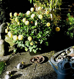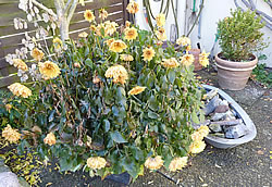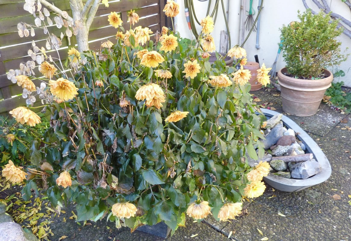 Vör twee Daag strahl de Dahlie noch mit de Sünn üm de Wett. Aver nu hett de eerst Frost ehr tosett. De Blöden un Bläder hängt trurig hindaal! So is dat, wenn man nich up den Wederbericht höört! Twee bit veer Grad Minus weern för de Dahlie to veel! De Biller köönt Se per Klick