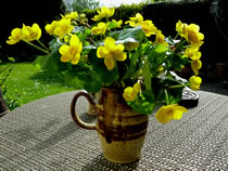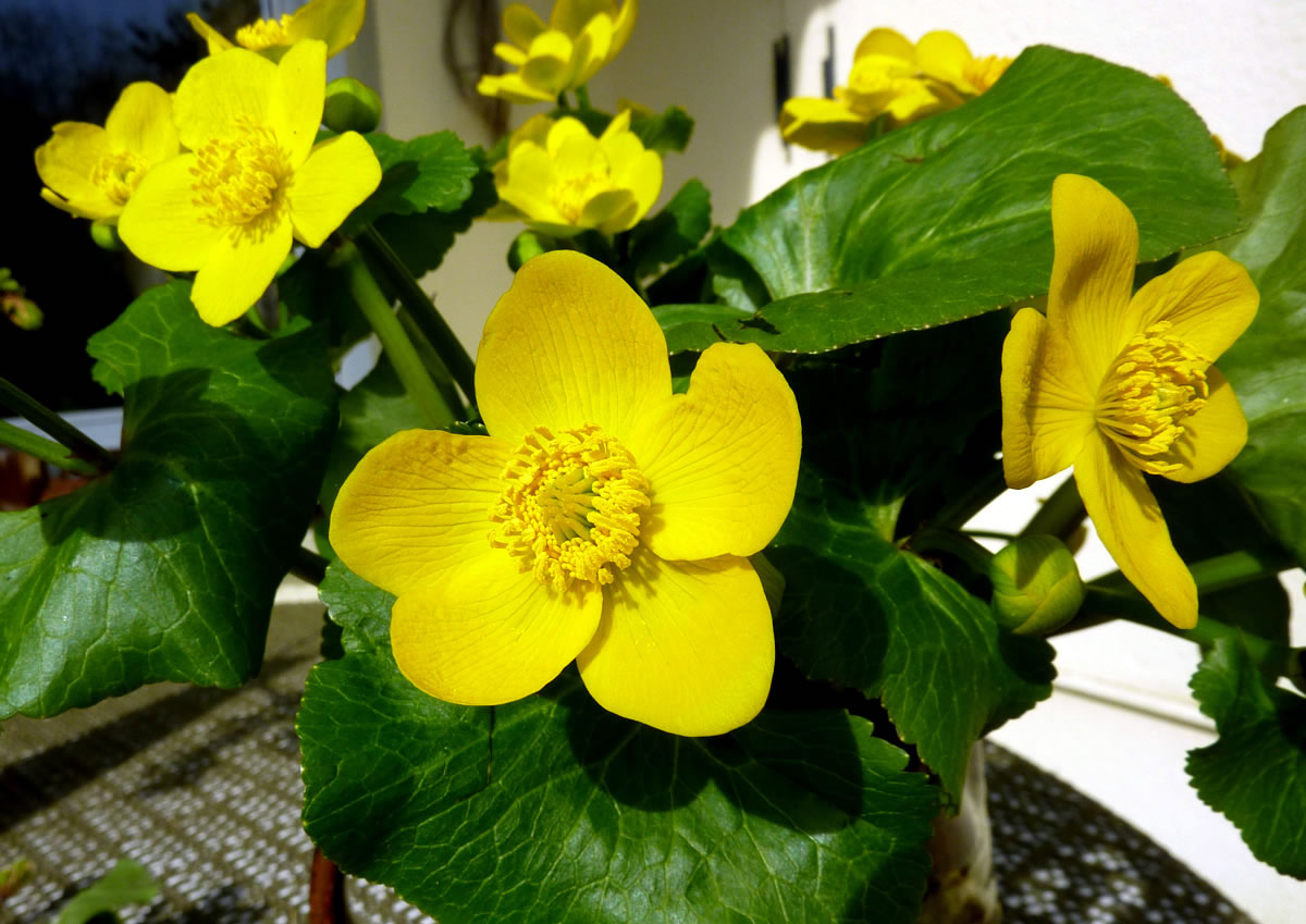 Toonputt up den Terrassendisch. De De Kohbloom tellt to de Hahnenfootplanten. Fief grote gele Blödenbläder