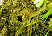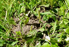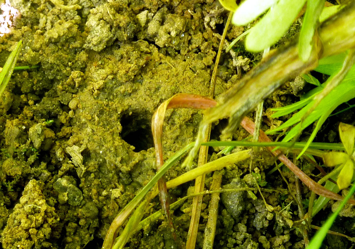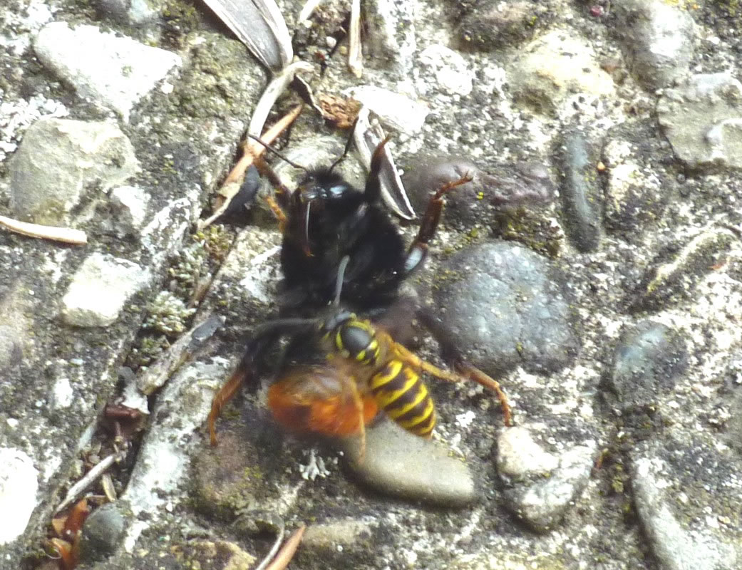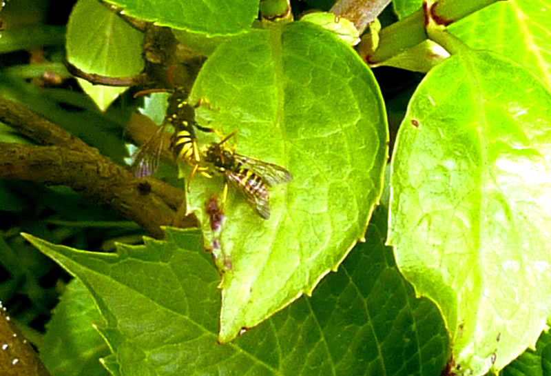 Up d De Graafwöps is en flietigen Goornarbeider. Graaft sik Eerdlöker un leggt ehr Eier dor af. In mien Rasen weern lütte Eerdhümpel to sehn. Dor harr seker en Graafwöps Löcker för ehr Eier buddelt . In de Blomenrabatt weern ok welk togang. Dor heff ik mank de Blomen en Lock in de Eer funnen. En fardig Nest för dat Freten vun de Kinner. Bavenöver up en Blatt seet de Uppasser un keek mi mit grote Ogen an.