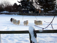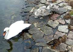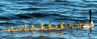 al dor un snattern miteenanner üm de Un nu hebbt se ok al ehr lütten Kinner vörstellt. Dittmal weern dat söss Gössel. Veer Weken fröher as verleden Johr! Mien Naver hett mi de Naricht mitdeelt. Dor müss ik doch glieks na den Diek un de Gooskinner bewunnern. Un wohrhaftig plücken de Öllern mit ehr Kinner dat frische gröne Gras an den Diek. Ganz vörsichtig slieker ik mi neger an de Goosfamilie ran. Dat harrn de Öllern aver furts mitkregen. Beide böörn ehr'n Kopp, keken na mi un snacken miteenanner. Hellwaak söchen se lever dat Wiede. Ehr Kinner nehmen se twischen sik. So kunnen se beter uppassen. Un denn marscheern se wieder. Eerst as ik wiet noog weg weer, hebbt se wedder Gras freten. De Göös sünd gode Uppasser! De Biller köönt Se per Klick