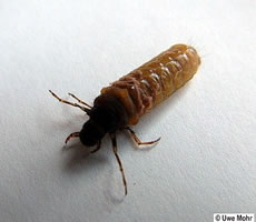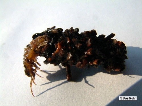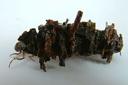 De Köcher is an beide Sieden open, dormit Woter dörchlopen kann un so de Larve Suerstoff kriegen kann. He ward mit Hölp von Tracheenkiemen an Achterlief obnohmen. De Larven verpoppen sik in' Köcher, de vörher an Steen odder an Grund fastmookt ward. De Köcher ward dörch de ganze Wasstumstied vörn vergröttert, un de engen achteren Deele warrt togliek wegmokt. De recht beweglichen Poppen krabbelt to'n Slüppen an Land. De Biller köönt Se per Klick