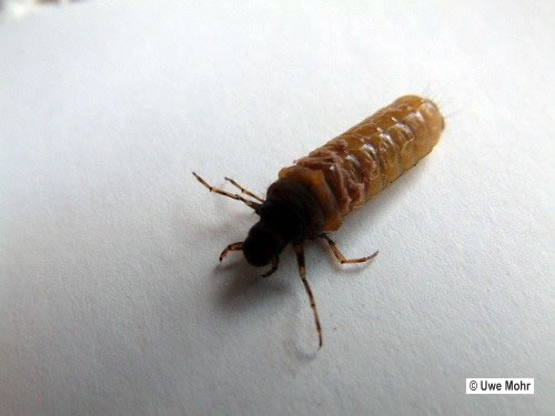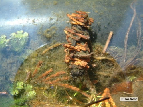 Buten hebbt wi Aprilwedder von Feinsten, dor sit ik leever in't Huus un schrief mool wat över de Köcherfleeg. Op uns Terrasse hebbt wi een lütten Tümpel. Bi't Afkeschern von Loof güng mi een sünnerbores Buwark in't Nett. Ut lütte Holtstücke un afbroken Nodeln von een Zypresse, de an Diek steiht, weer een sonnerbores Huus to sehn, dor kann di de "Lange Anna" von Helgoland infallen. Bloots, an een Enn von düssen Köcher, dor keken dree Been von de Larve rut.