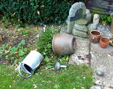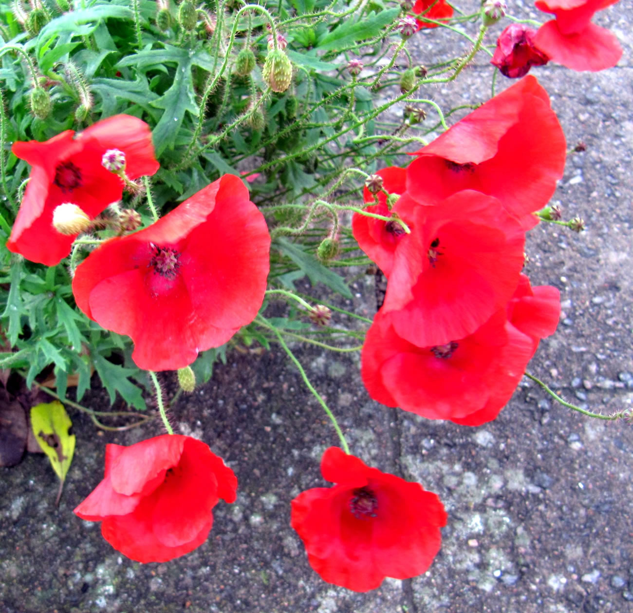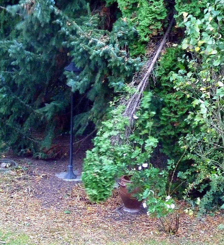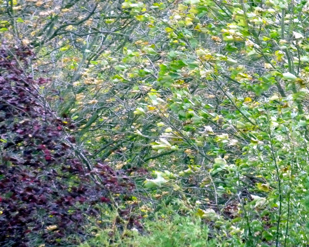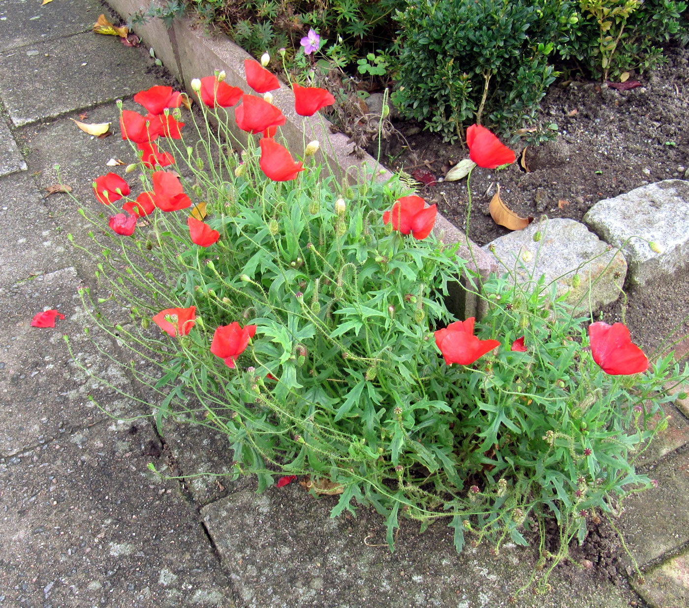 Hupenwies legen rode Bläder up de Straat. Up dat Rasenstück ünner den Boom weer en Bodderbloom kum noch to sehn. Aver sien gele Farv heef sik noch goot vun dat rode Blödenwark af. De lütten witten Mardelbloom keken neeschierig ut dat rode Blattwark. De Storm harr allens verännert. Vörher hebbt wi uns ümmer