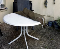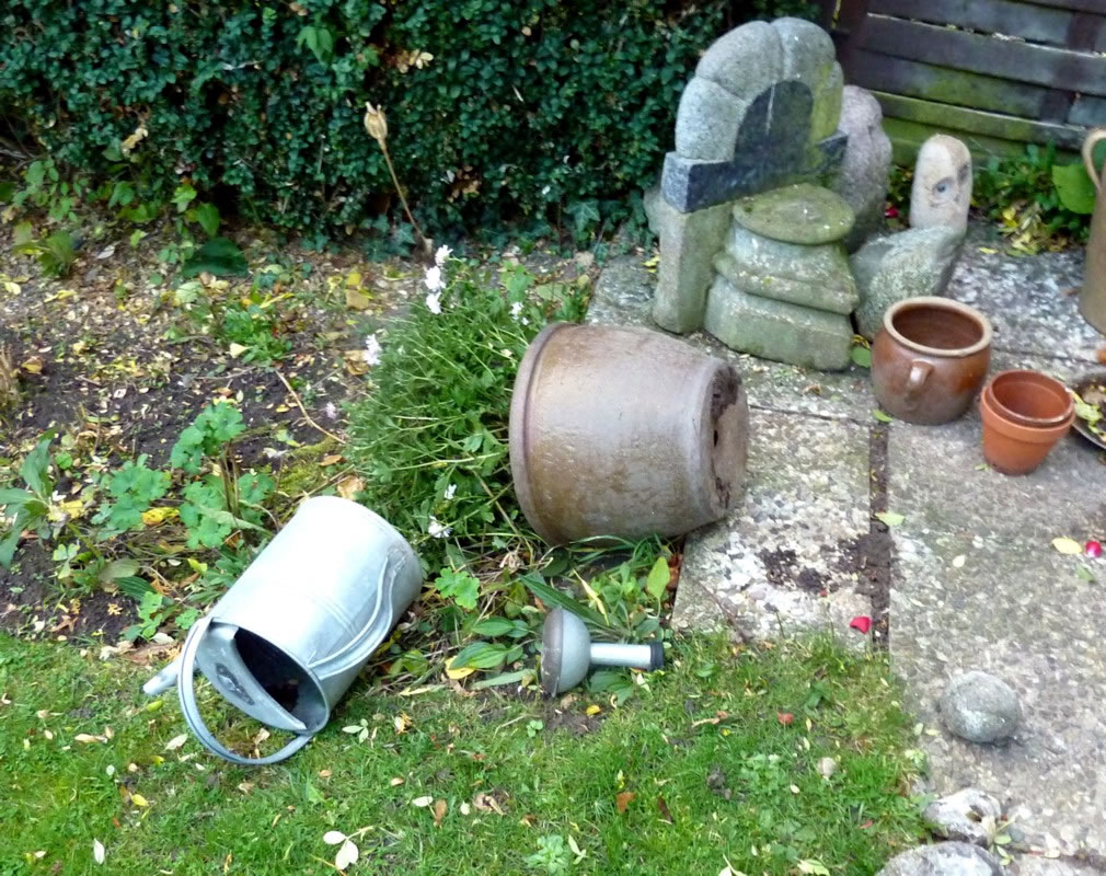 To Huus överlegg ik denn, wo kann ik disse Kumme denn mal to bruken? Dat weer warm, ik seet buten. Mien leef Mann weer an't Rasensprengen un natürlich müss he mi natt sprütten. Denn röter dat Telephon, ik also rin un harr enen langen Snack.