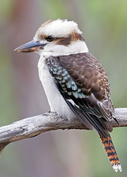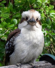Sien Roop höört sik nämlich an, as wörr he lachen, also as so'n Gelächter. Un wiel he morgens fröh, wenn't hell warrt dit Gelächter utstött un ok avends, wenn't dämmert, ranken sik hübsche Legenden vun de Aborigines üm em. He is en tehmlich groten Vagel, un he höört to de Familie vun de Iesvagels. He is de gröttst vun disse Familie. Sien richtig Naam is Kookaburra. Schöön, nich? Kookaburra. In Düütschland warrt he Jägerliest nöömt un ok Lachen nee, nich Jack, hier heet he "Lachen Hans". In Australien hebbt de Minschen den Kookaburra geern üm sik rüm, he fritt veel Ungeziefer, sogoor giftig Slangen aver eben ok Sigrids Botterbroot. Anke Nissen