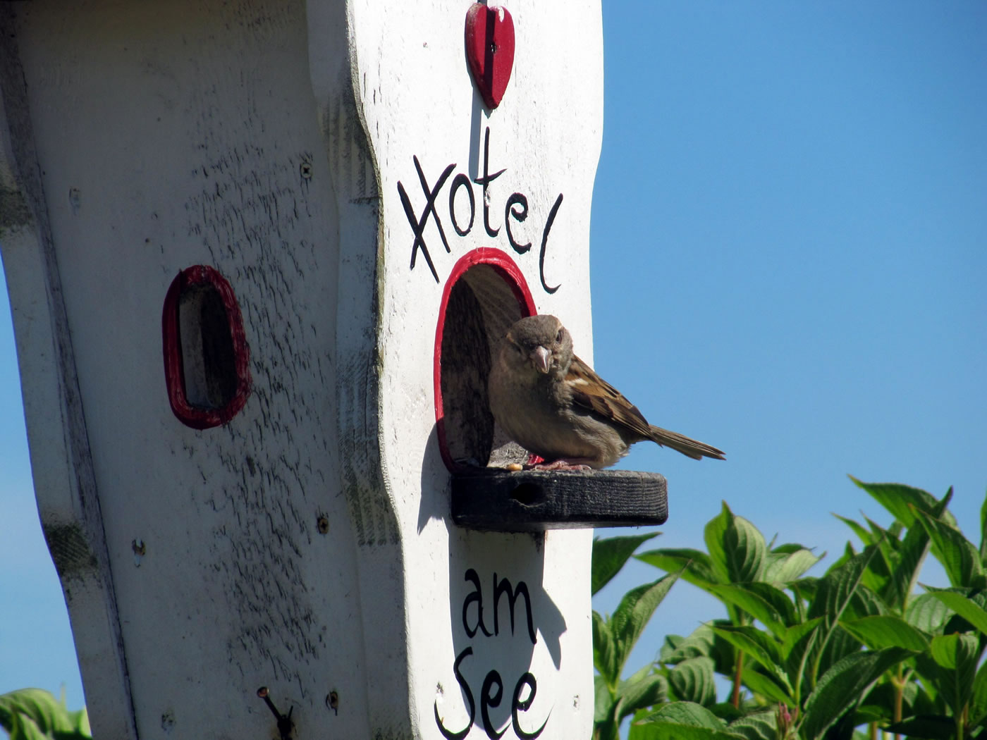Emsig sammeln twee Finken en He un en Se Nistmaterial. Se kemen mit Halme un Moosbüschel anflagen, mit Bastfasern un Flechten. Dat lütt Nest aver bu blots Fru Fink, as mi dat dücht. To'n Sluss pulster se de lütte Schaal noch ut mit Hoor un Feddern un denn sett se sik komodig hen un füng mit Eierleggen an. Fiev Stück tell ik an't End. Un nu güng dat Bröden los. Nich afwesselnd, nee, blots Fru Fink seet in't Nest. Twee Weken lang. Herr Fink weer solang an't Singen. Wunnerschöne Töne süng he sien Fru un mi vör. As de Lütten denn ut't Ei krapen weern, dor hett he denn aver düchtig bi't Fodern mithulpen. Ik kenn en Fru, de mag Vagels so geern, se weer an'n leevsten sülms en. Ehr Droom is, dat se en Iesvagel is. De is so schöön un so fix, he is as en blagen Blitz. Leest heff ik vun en anner Fru, de much geern en lütt Tuunkrüper sien. Disse Vagel kann so schöön un so luut un so kräftig singen, un jüst dat wörr de Fru ok geern doon. En vun miene Fründinnen swärmt för Duven. Ja, se much geern sülms en Duuv sien. Se harr dat beten mit de Religion, un dor weer de Duuv denn ja ok de passlich Vagel.