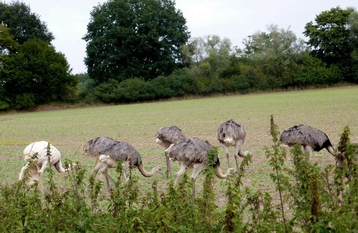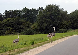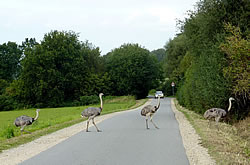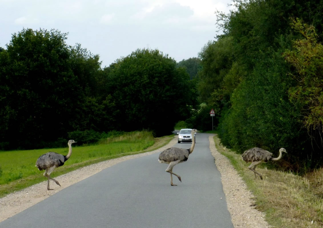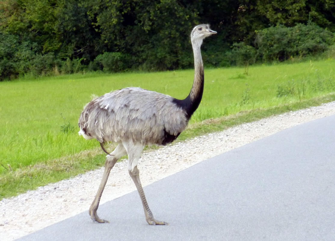 "Pass up!", reep mien Mann, "dor achter löppt wat över de Straat!" Ik weer dat ok al wies woorn. Wi weern in Meckelnborg mit Auto mank Upahl un Schattin ünnerwegens. Vörsichtig föhr ik neger ran. "Du, dat sünd ja Nandus, de över de Straat wüllt", reep ik ut. Un wohrhaftig, een na'n annern keem vun dat linke Feld ümmer neger an de Straat. De eerste sicher na beide Sieden af un marscheer över de Straat. De annern kemen al in "Nandumarsch" achterna. Ik harr intwischen dat Auto an de Stratensiet stellt un weer gau utstegen. Dat müss ik doch knipsen! Nu keem uns noch en Auto mit Licht in de Mööt. Dat stöör de Nandus överhaupt nich. Se marscheern ruhig wieder. Se wullen alle up dat anner Feld.