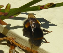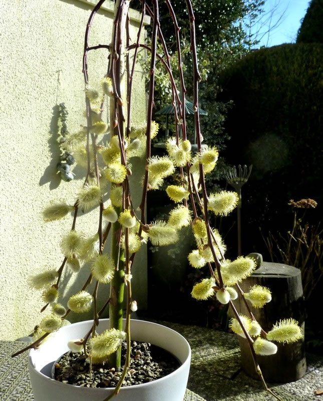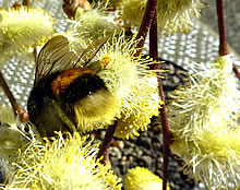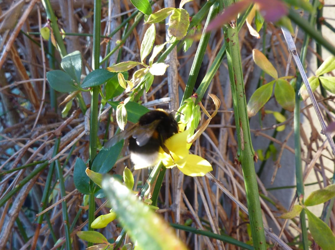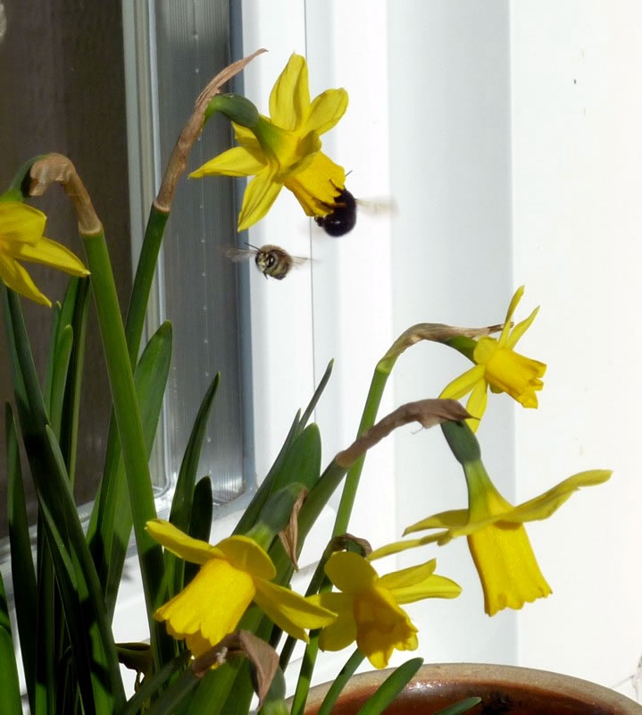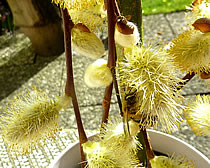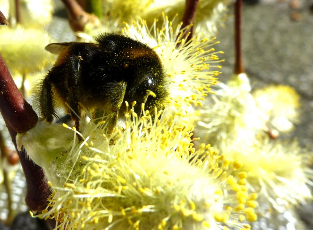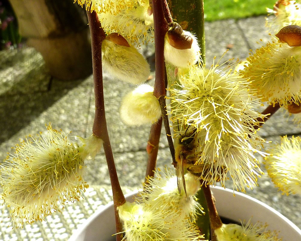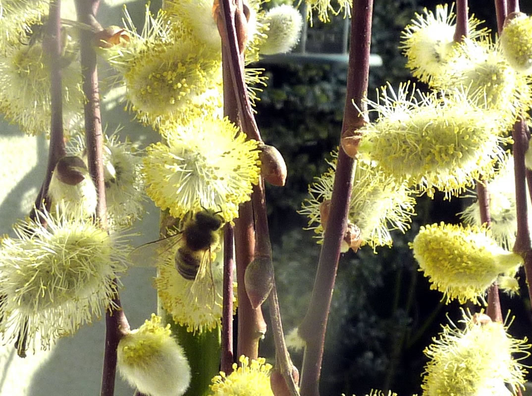 9.3.14 . Märzensünn un Wichelkatten Kuum dat de Märzensünn sik wies un ehr warmen Strahlen up de Eer schickt, zanken sik al de Immen un anner lütte Insekten üm den besten Placken up mien Wiedenstock. Ik harr en lütten Wiedenstock schenkt kregen un up den Terassendisch stellt. Eerst summen de Insekten üm de Narzissen up de Finsterbank. Se zanken sik richtig üm en Blööt. Denn flögen se na den Wiedenstock up den Disch. De stünn dor eerst en gode Stünn. Dat weer en Gesumm un Gebrumm up de Terrass! De lütten Deerten weern wull meist al to glieken Tiet ut den Winterslaap upwaakt. Un nu harrn se Hunger. De gelen Wiedenblöden harrn se al düchtig dörcheenanner bröcht. De weern al richtig strubbelig. Nu misch sik noch en ganz depen Ton mank dat Gebrumm. En Eerdhummelkönigin weer ok waak woorn. Se geev den Ton an un sett sik meern mank de gelen Blöden. Dat weer en richtig Fröhjohrskunzert up de Terrass. De Biller köönt Se per Klick