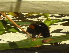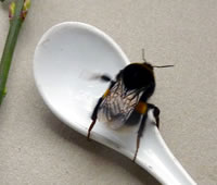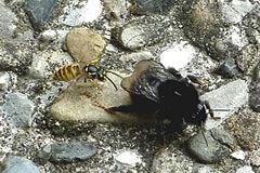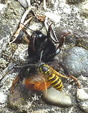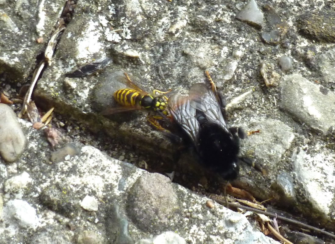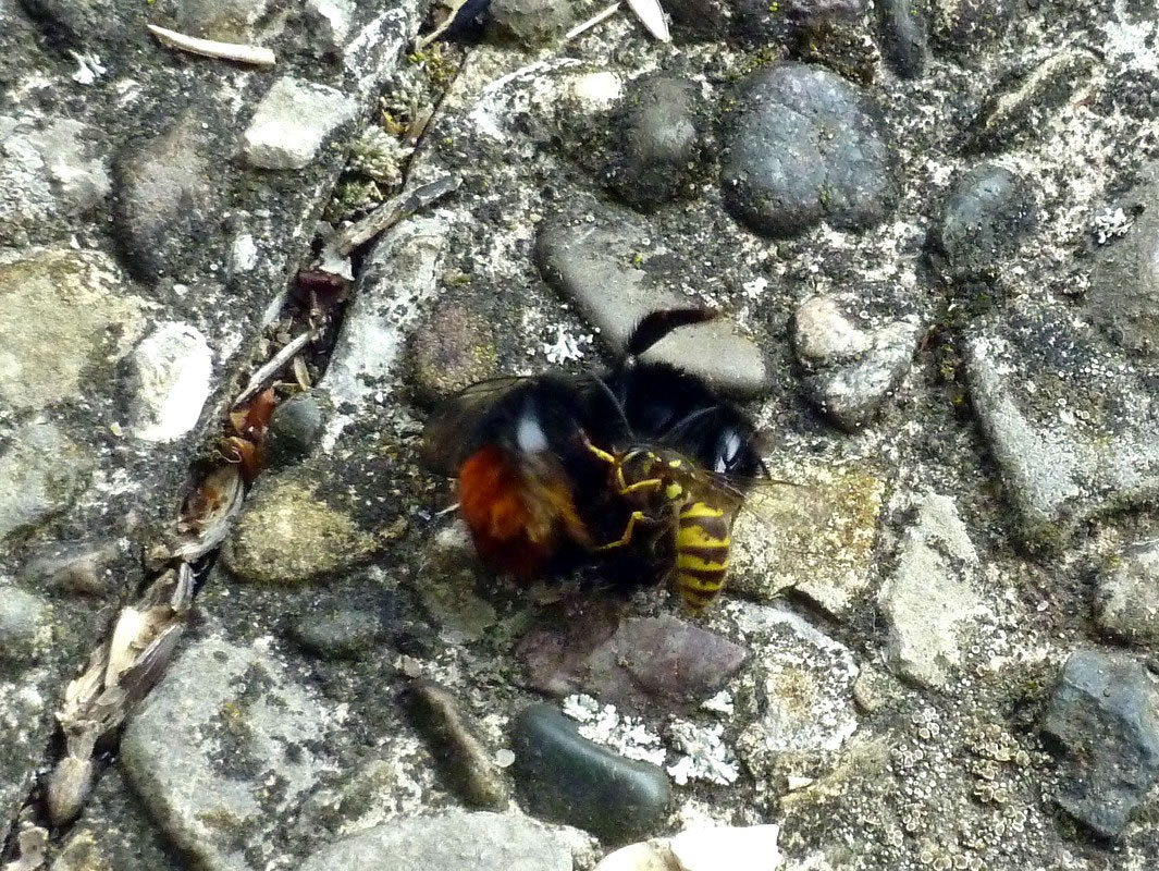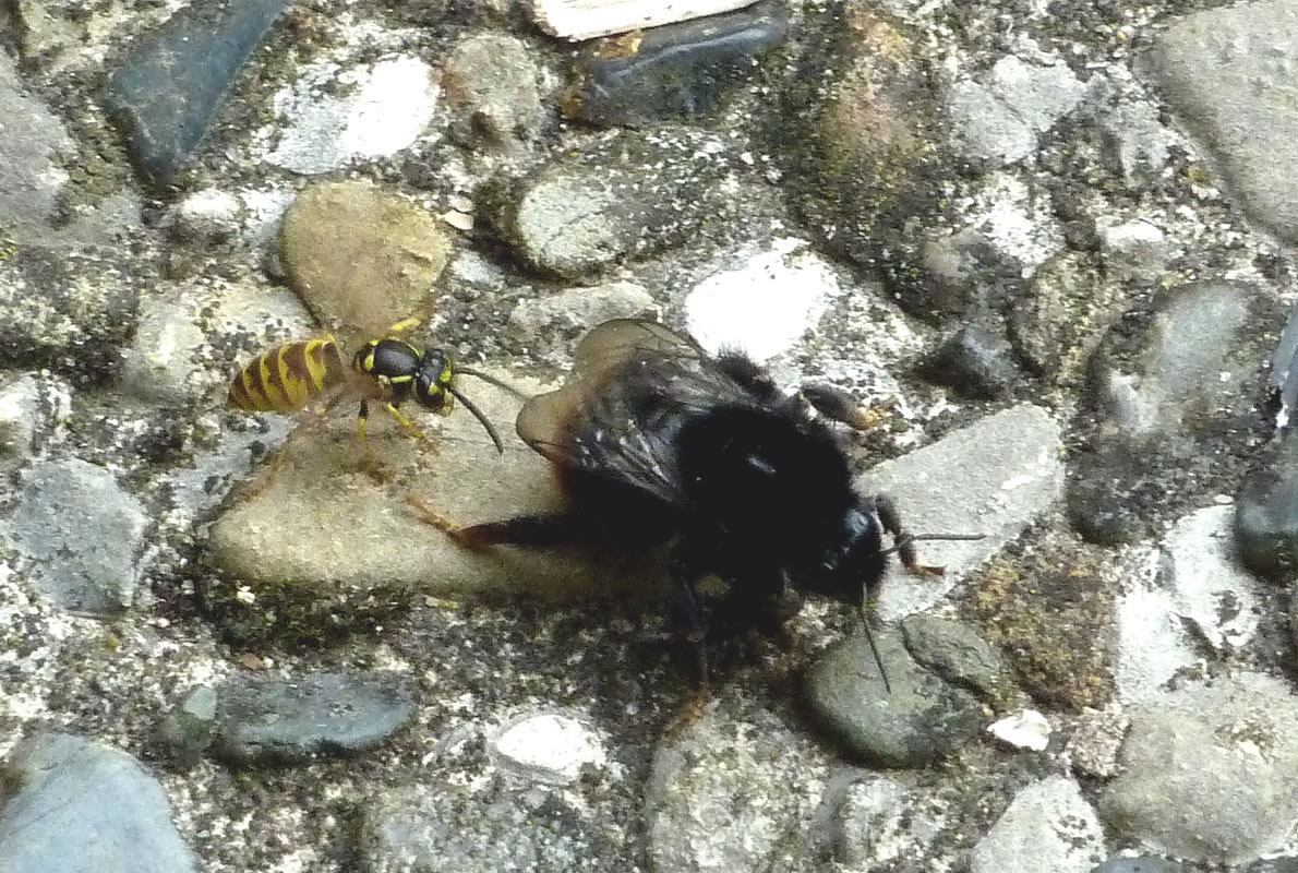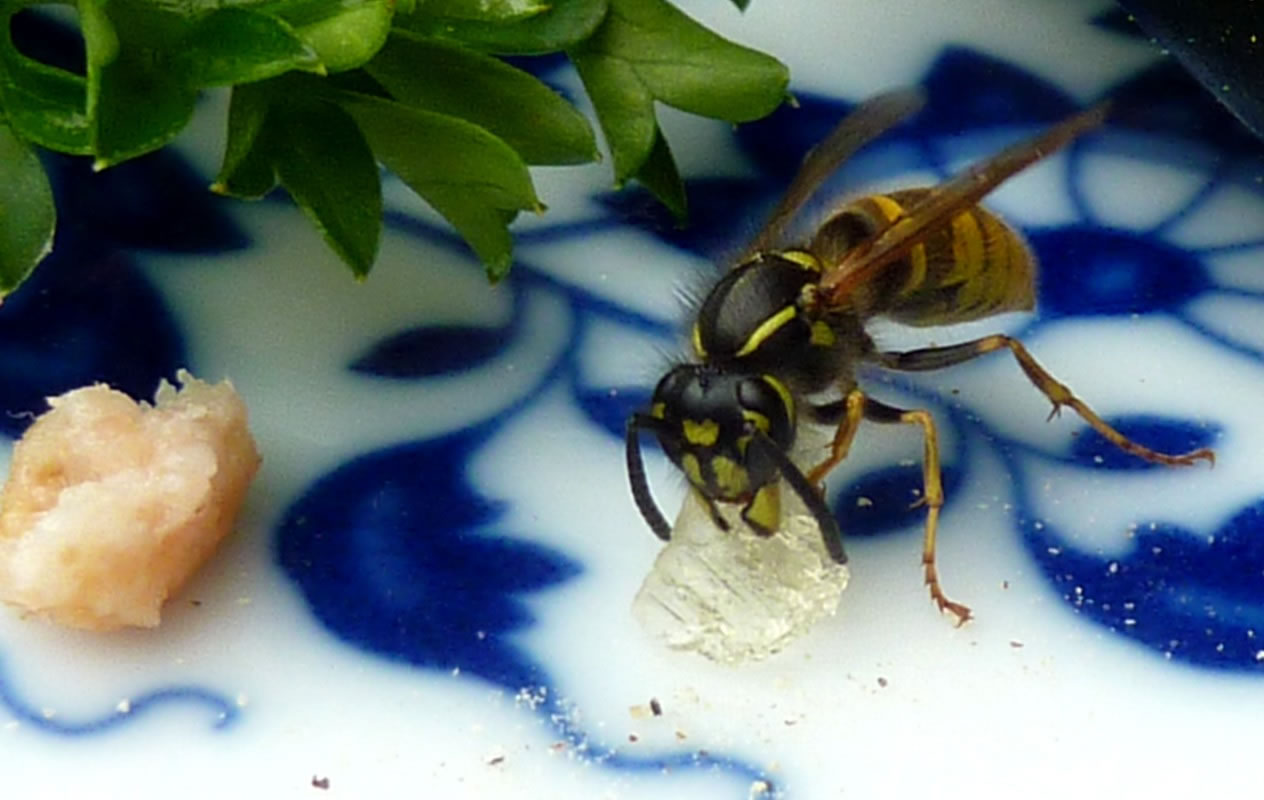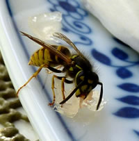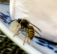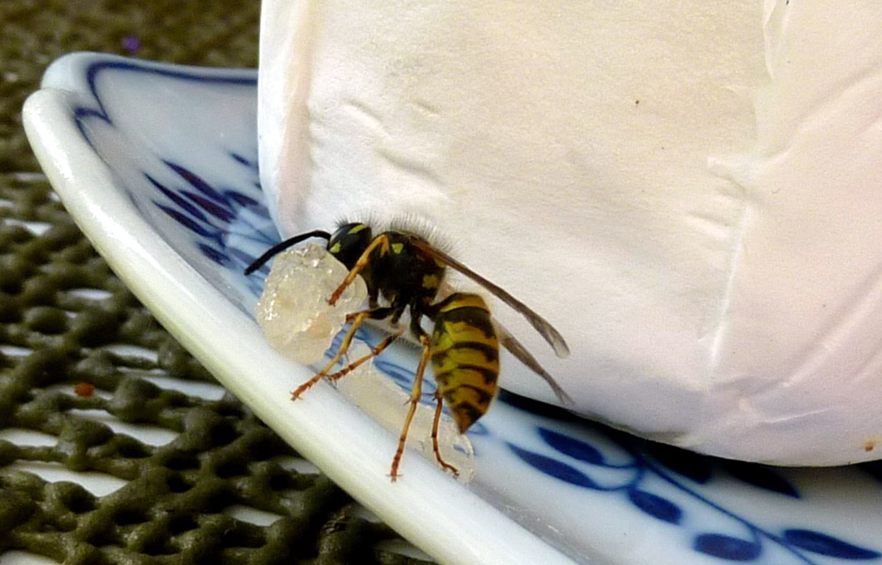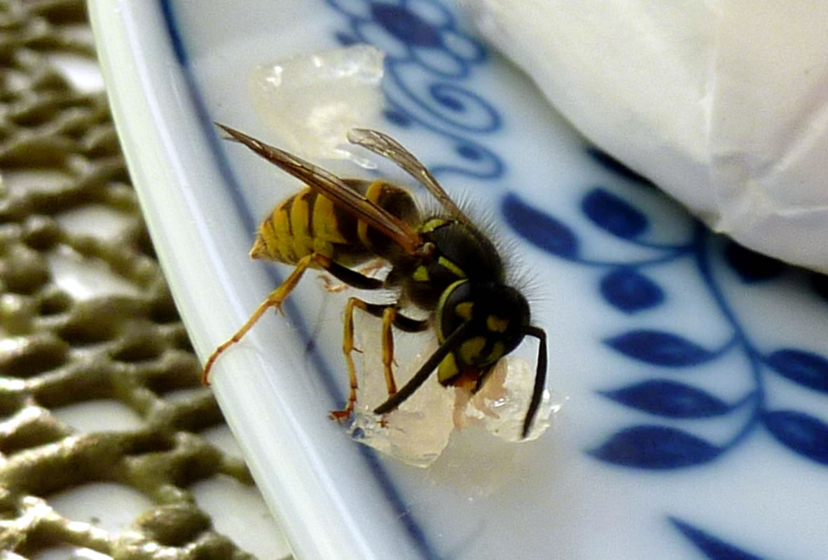 19.8.12 . .Besöök vun en Wöps! Uns Avendbroot et wi in de Sommertiet bi goot Weder ümmer up de Terrass. Aver kuum dat ik den Disch andeckt harr, mell sik al Besöök. Knapp, dat wi up unsen Stohl seten. "Pass up, glieks sünd de Wöpsen wedder dor", meen mien Mann un lang na de Flegenklatsch. "Wie kann't blots angahn? De mütt dat doch rüken." "Nu hau nich glieks wedder na de Wöpsen. Kiek lever to, wie de sik en lütt Stück vun de Wuss halt. De hebbt doch ok Hunger."Aver he leet sik nich begöschen. De Wöpsen summen üm sien Kopp. "Dor sall nu ener ruhig bi blieven!" Aver denn keek he doch to. De en Wöps harr dat besünners up en Stück vun de Sült afsehn. An den Rand vun de Schiev weer en lütt beten Sült affullen. Dor möök se sik överheer. Greep mit ehr Been üm dat lütt Stück un sleep dat över den Töller. Bit an den Töllerrand hett se dat bröcht. Denn flöög se mit dat Stück dorvun. "Kiek mal", meen ik to mien Mann, "de Wöps hett Di doch gor nix daan. Se wull sik blots wat t'on Freten halen." Seker bringt se dat in ehr Wöpsennest. De Biller köönt Se per Klick