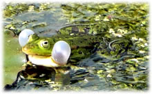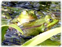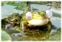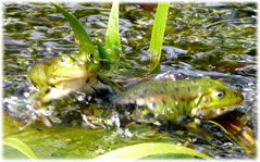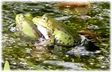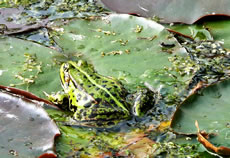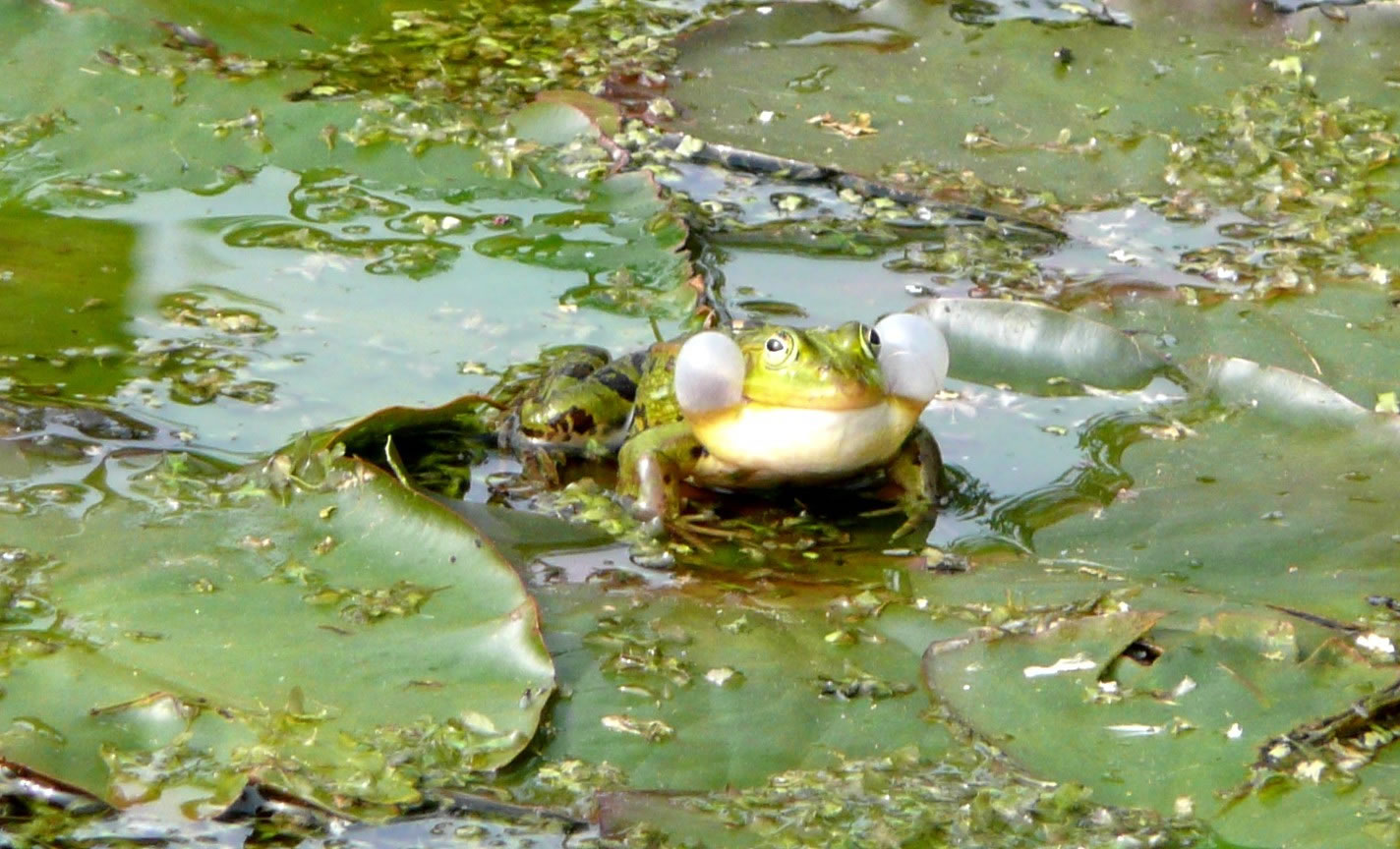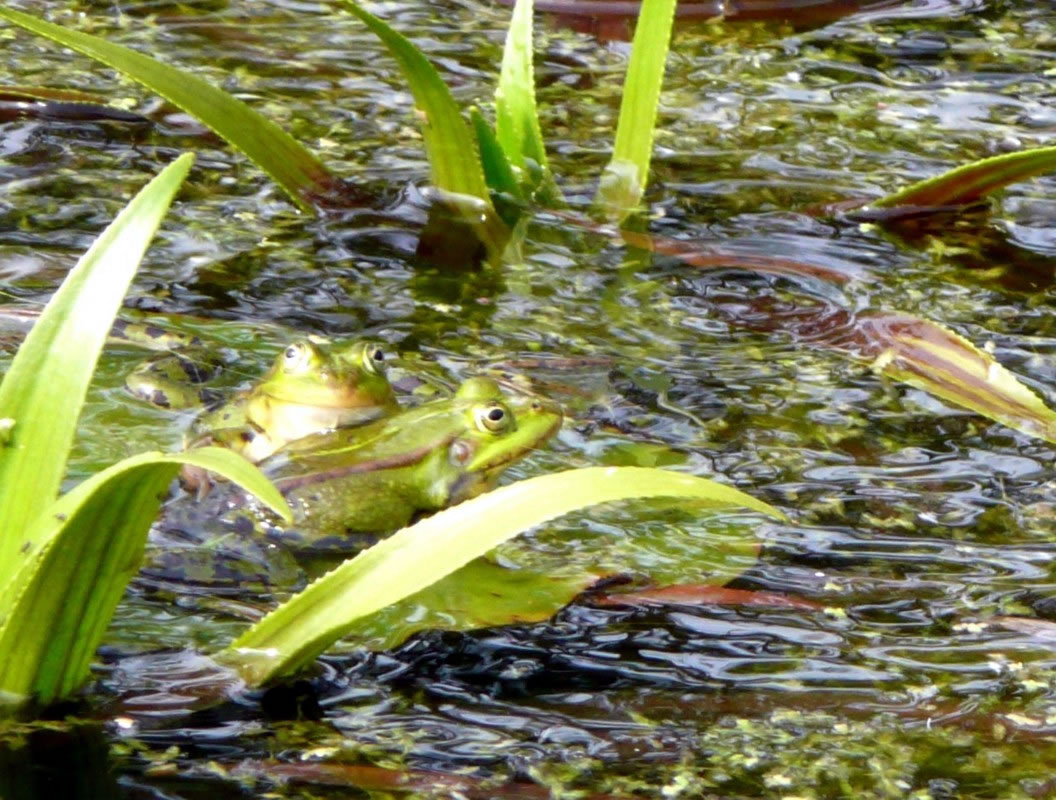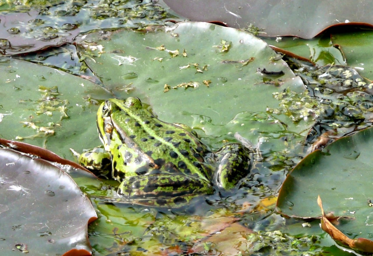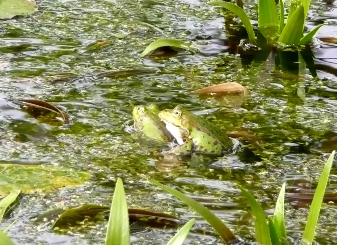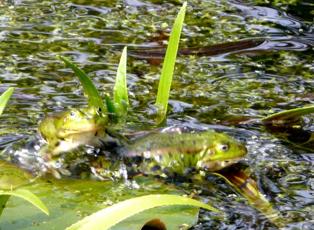 De Wind weer inslapen un de Sünn güng to Roh. De Schummertied harr anfungen. Sogoor de Klock vun Kirchturm weer to höörn, so still weer dat. Se sloog de neegst Stunn an. Quark, quark, quaaark, keem dor en Stimm vun den Diek, de achter unsen Goorn liggt. En tweete Stimm full in. Dat duur nich lang, dor geev dat mit vele Stimmen en richtig Poggenkonzert. Ganz sachte slieker ik mi an den Diek. Dat Quarken wöör luder. De Diek weer ganz mit Seerosenbläder todeckt. Mank de Bläder dükern Poggenköpp up. De witten Swimmblasen heven sik goot vun de grönen Seerosenbläder af. Quark, quark!, keem immer wedder en Poggenstimm. All repen se na en Fru. Een Pogg seet meern up en Seerosenblatt, so as wenn he up den Diek dat Seggen harr. He puss sien Swimmblasen up un quark. Mit enen groten Satz jump he denn in't Water glieks up den Rüüch vun en Fru! De sööch aver dat Wiede. He achteran un wedder jump he up den Rüüch vun de Fru. Nu klammer he sik mit de langen Achterbeen an ehr fass. He leet se nich wedder los. He weer so swoor, dat he se meist ünnert Water düker. En annern Pogg sööch ok en Fru un jump vun Seerosenblatt to Seerosenblatt. Endlich harr he ok en Fru funnen. De ganze Diek weer in Hochtiedsstimmung. Bit laat in de Nacht kunn man dat Quarken vun de Poggen höörn. Dat weer so luut! Oftins stöör dat de Minschen in de Naverschap. Wi aver freut uns ümmer. De Biller köönt Se per Klick