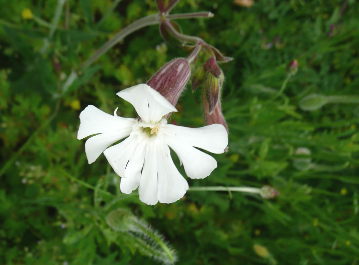 22.6.14 . Duvenkropf dat Liemkruut op den Liem gahn De Bloom wasst bi mien Fründin in ehr'n Goorn. Se tellt to de Liemkrüder. Kunnst meist för en witte Daglichtnelk hollen. Aver se sehg doch wat anners ut. Dat weer en "Taubenkropf", op Platt denn ja wohl Duvenkropf. De Daglichtnelk harr nich ganz so grote un apattig Kelchbläder.